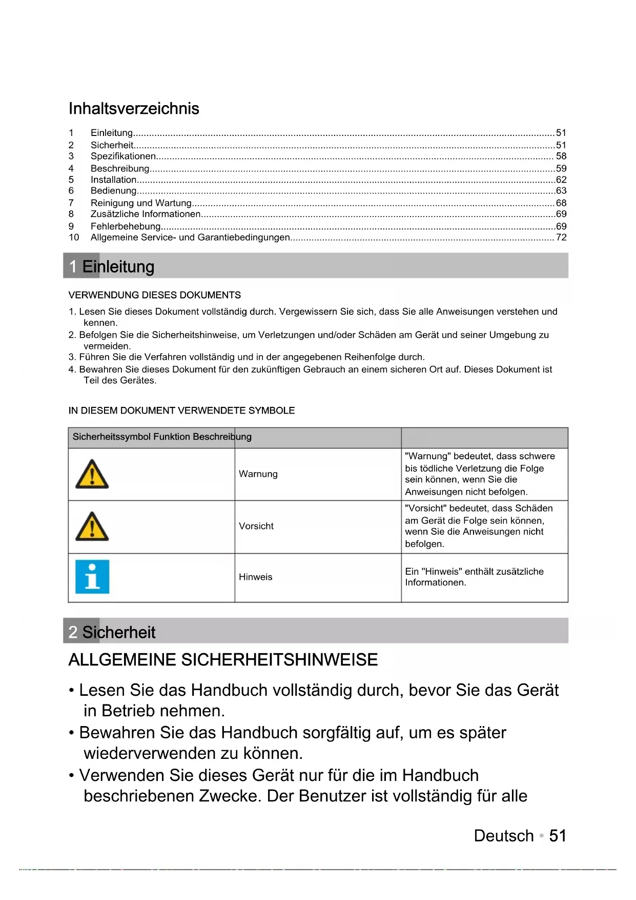 - Lesen Sie das Handbuch vollständig durch, bevor Sie das Gerät in Betrieb nehmen.