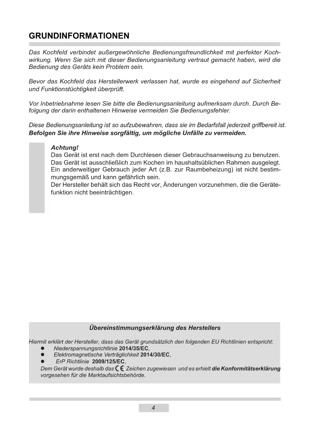 - Vor dem ersten Benutzen des Induktionskochfeldes lesen Sie die Gebrauchsanweisung aufmerksam durch. Auf diese Art und Weise können Sie einen sicheren Gerätebetrieb sicherstellen und Beschädigungen des Kochfeldes vermeiden.