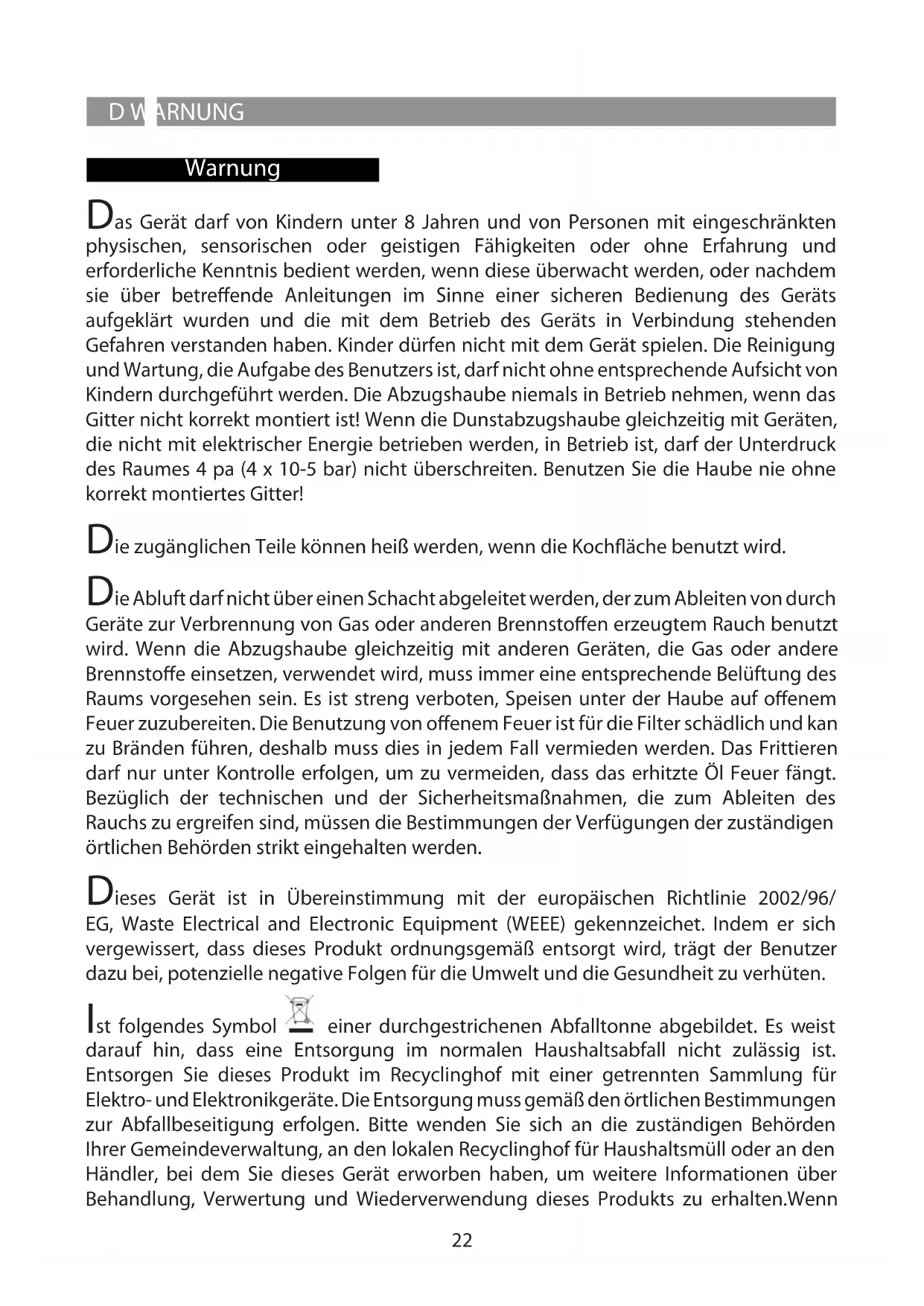 Warnung D WARNUNG Das Gerät darf von Kindern unter 8 Jahren und von Personen mit eingeschränkten physischen, sensorischen oder geistigen Fähigkeiten oder ohne Erfahrung und erforderliche Kenntnis bedient werden, wenn diese überwacht werden, oder nachdem sie über betreende Anleitungen im Sinne einer sicheren Bedienung des Geräts aufgeklärt wurden und die mit dem Betrieb des Geräts in Verbindung stehenden Gefahren verstanden haben. Kinder dürfen nicht mit dem Gerät spielen. Die Reinigung und Wartung, die Aufgabe des Benutzers ist, darf nicht ohne entsprechende Aufsicht von Kindern durchgeführt werden. Die Abzugshaube niemals in Betrieb nehmen, wenn das Gitter nicht korrekt montiert ist! Wenn die Dunstabzugshaube gleichzeitig mit Geräten, die nicht mit elektrischer Energie betrieben werden, in Betrieb ist, darf der Unterdruck des Raumes 4 pa (4 x 10-5 bar) nicht überschreiten. Benutzen Sie die Haube nie ohne korrekt montiertes Gitter! Die zugänglichen Teile können heiß werden, wenn die Kochäche benutzt wird. Die Abluft darf nicht über einen Schacht abgeleitet werden, der zum Ableiten von durch Geräte zur Verbrennung von Gas oder anderen Brennstoen erzeugtem Rauch benutzt wird. Wenn die Abzugshaube gleichzeitig mit anderen Geräten, die Gas oder andere Brennstoe einsetzen, verwendet wird, muss immer eine entsprechende Belüftung des Raums vorgesehen sein. Es ist streng verboten, Speisen unter der Haube auf oenem Feuer zuzubereiten. Die Benutzung von oenem Feuer ist für die Filter schädlich und kan zu Bränden führen, deshalb muss dies in jedem Fall vermieden werden. Das Frittieren darf nur unter Kontrolle erfolgen, um zu vermeiden, dass das erhitzte Öl Feuer fängt. Bezüglich der technischen und der Sicherheitsmaßnahmen, die zum Ableiten des Rauchs zu ergreifen sind, müssen die Bestimmungen der Verfügungen der zuständigen örtlichen Behörden strikt eingehalten werden. Dieses Gerät ist in Übereinstimmung mit der europäischen Richtlinie 2002/96/ EG, Waste Electrical and Electronic Equipment (WEEE) gekennzeichet. Indem er sich vergewissert, dass dieses Produkt ordnungsgemäß entsorgt wird, trägt der Benutzer dazu bei, potenzielle negative Folgen für die Umwelt und die Gesundheit zu verhüten. Ist folgendes Symbol einer durchgestrichenen Abfalltonne abgebildet. Es weist darauf hin, dass eine Entsorgung im normalen Haushaltsabfall nicht zulässig ist. Entsorgen Sie dieses Produkt im Recyclinghof mit einer getrennten Sammlung für Elektro- und Elektronikgeräte. Die Entsorgung muss gemäß den örtlichen Bestimmungen zur Abfallbeseitigung erfolgen. Bitte wenden Sie sich an die zuständigen Behörden Ihrer Gemeindeverwaltung, an den lokalen Recyclinghof für Haushaltsmüll oder an den Händler, bei dem Sie dieses Gerät erworben haben, um weitere Informationen über Behandlung, Verwertung und Wiederverwendung dieses Produkts zu erhalten.Wenn23 DWARNUNG das Stromkabel beschädigt ist, muss es vom Hersteller, von einem technischen Hilfe- Center oder von einer anderen Person mit ähnlicher Qualikation ausgetauscht werden, um Gefahrensituationen zu vermeiden. Konsultieren Sie auch die Zeichnungen auf den ersten Seiten mit den Buchstaben- und Nummern, auf die im Erklärungstext Bezug genommen wird. Halten Sie sich strikt an die in diesem Handbuch gegebenen Anleitungen. Für eventuelle vom Gerät verursachte Unannehmlichkeiten, Schäden oder Brände, die sich aus der Nichteinhaltung der in diesem Handbuch gegebenen Anleitungen ergeben, wird jede Haftung abgelehnt. Es wird empfohlen, die Haube nicht an einer Wand zu befestigen, die das Gewicht nicht tragen kann, z.B. einer Rigipswand, und sie nicht in ein Möbelstück einzubauen. Die Küchenhaube muss in einem Abstand von mindestens 65 cm über einem Elektroherd und von mindestens 65 cm über einem Gasherd oder kombinierten Herd angebracht werden. Wenn die Installationsanweisungen der Gaskochgeräts einen größeren Abstand vorgeben, ist dieser zu berücksichtigen. Die Küchenhaubenmodelle,sindmit einer oberen Luftaustrittsönung B ausgestattet, um die angesaugten Dämpfe nach aussen abzuleiten (Abluftversion A – das Abluftrohr ist nicht mitgeliefert). Falls es nicht möglich sein sollte, die angesaugten Kochdämpfe nach aussen abzuleiten, kann das Gerät auch als Umlufthaube F verwendet werden. Dazu ist es notwendig, 1 Aktivkohlelter F zu montieren; so wird die angesaugte Luft ueber die Gitter G wieder in den Raum zurueckgefuehrt. Vergewissern Sie sich, dass sich in der Nähe der Haube eine Stromsteckdose bendet und dass die Anlage mit einem Dierential von 30 mA versehen ist. Die Netzspannung muss der auf der Datenplakette im Inneren der Haube angegebenen Spannung entsprechen. Die Haube hat ein 1250 mm langes Stromkabel mit oder ohne Stecker: Wenn es einen Stecker hat, schließen Sie die Haube an eine den geltenden Vorschriften entsprechende, in einem zugänglichen Bereich liegende Steckdose an, hat es keinen Stecker (direkter Netzanschluss), ist ein zweipoliger vorschriftsgemäßer Schalter mit einem Abstand von mindestens 3 mm zwischen den Kontakten (zugänglich) angebracht werden. Diese Installation und der Stromanschluss muss nach der technischen Vorschrift von einem spezialisierten Techniker ausgeführt werden. Leistungsfähigkeitstests des Produkts, durchgeführt in Übereinstimmung mit der EU- Verordnung Nr. 65/2014 – Ref.: IEC 61591 Die höchste Leistungsfähigkeit wird erreicht, wenn eventuell vorhandene Verkleidungsplatten geönet sind.24