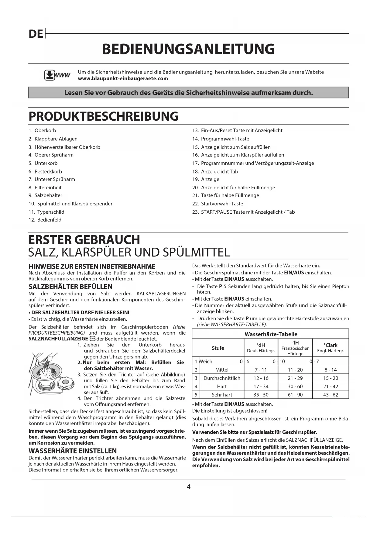 BEDIENUNGSANLEITUNG Lesen Sie vor Gebrauch des Geräts die Sicherheitshinweise aufmerksam durch. PRODUKTBESCHREIBUNG 1. Oberkorb2. Klappbare Ablagen3. Höhenverstellbarer Oberkorb4. Oberer Sprüharm5. Unterkorb6. Besteckkorb7. Unterer Sprüharm8. Filtereinheit9. Salzbehälter10. Spülmittel und Klarspülerspender11. Typenschild12. Bedienfeld13. Ein-Aus/Reset Taste mit Anzeigelicht14. Programmwahl-Taste15. Anzeigelicht zum Salz auüllen16. Anzeigelicht zum Klarspüler auüllen17. Programmnummer und Verzögerungszeit-Anzeige18. Anzeigelicht Tab19. Anzeige20. Anzeigelicht für halbe Füllmenge21. Taste für halbe Füllmenge22. Startvorwahl-Taste23. START/PAUSE Taste mit Anzeigelicht / Tab Um die Sicherheitshinweise und die Bedienungsanleitung, herunterzuladen, besuchen Sie unsere Website www.blaupunkt-einbaugeraete.com