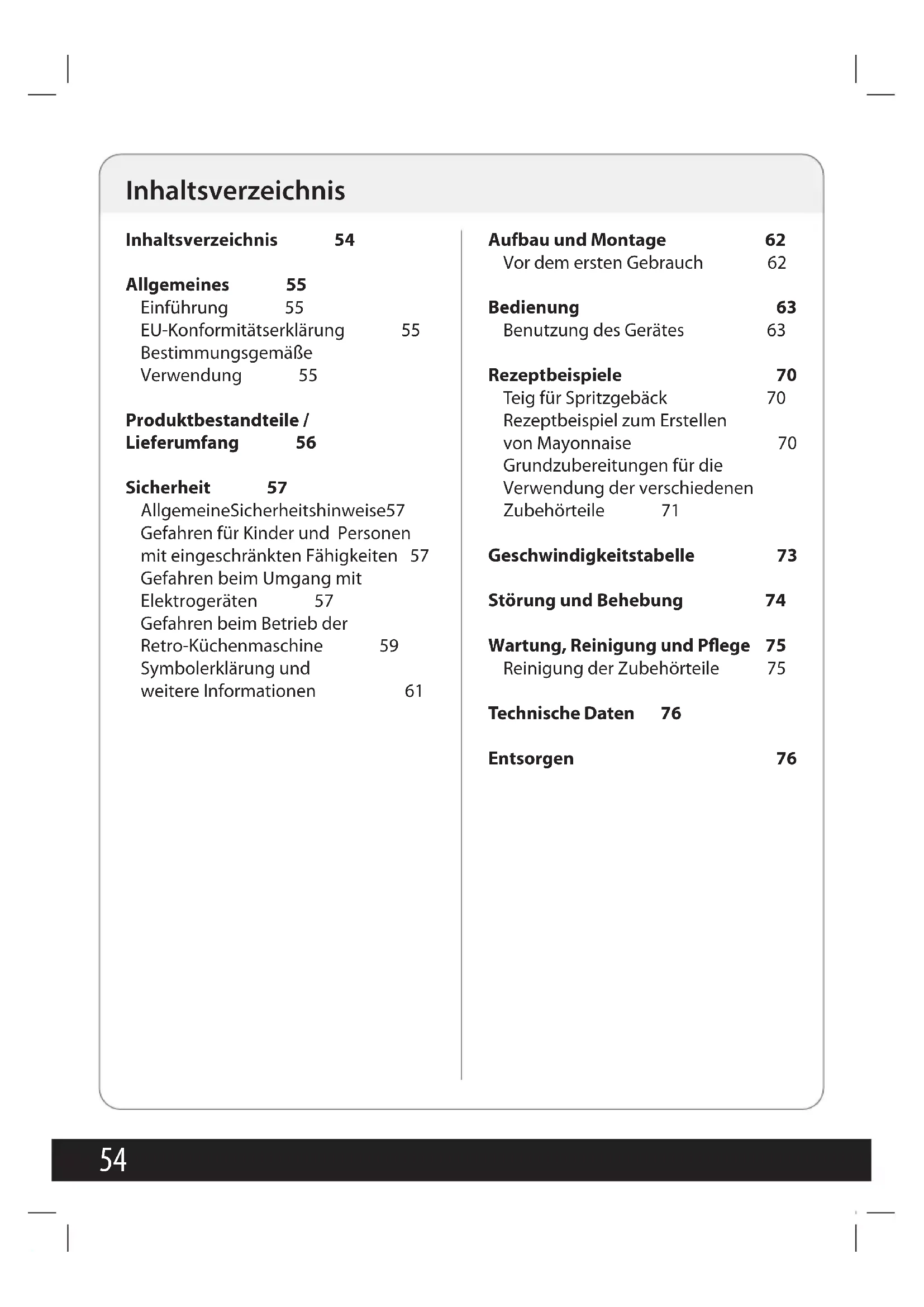 Inhaltsverzeichnis 54 Allgemeines 55 Einführung 55 EU-Konformitätserklärung 55 Bestimmungsgemäße Verwendung 55 Produktbestandteile / Lieferumfang 56 Sicherheit 57 Allgemeine Sicherheitshinweise 57 Gefahren für Kinder und Personen mit eingeschränkten Fähigkeiten 57 Gefahren beim Umgang mit Elektrogeräten 57 Gefahren beim Betrieb der Retro-Küchenmaschine 59 Symbolerklärung und weitere Informationen 61 Aufbau und Montage 62 Vor dem ersten Gebrauch 62 Bedienung 63 Benutzung des Gerätes 63 Rezeptbeispiele 70 Teig für Spritzgebäck 70 Rezeptbeispiel zum Erstellen von Mayonnaise 70 Grundzubereitungen für die Verwendung der verschiedenen Zubehörteile 71 Geschwindigkeitstabelle 73 Störung und Behebung 74 Wartung, Reinigung und Pflege 75 Reinigung der Zubehörteile 75 Technische Daten 76 Entsorgen 76 Inhaltsverzeichnis55