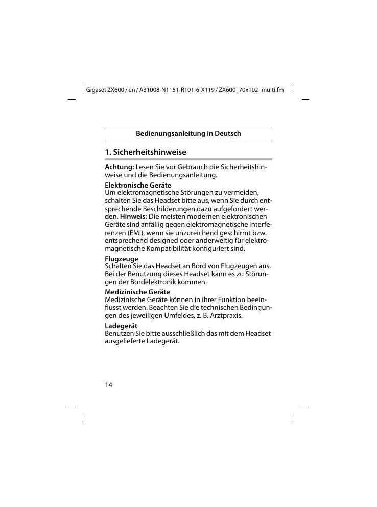 Gigaset ZX600 / en / A31008-N1151-R101-6-X119 / ZX600_70x102_multi.fm Aufbewahrung Bitte bewahren Sie das Headset so auf, dass er nicht verbogen oder beschädigt werden kann. Andernfalls besteht für den Benutzer die Gefahr von Verletzungen. Reparatur bzw. Wartung Jedwede Versuche zum Entfernen beliebiger Teile des Headsets führen zum Verlust der Garantie. Zusätzlicher Sicherheitshinweis Headsets können Töne mit hoher Lautstärke und Frequenzen ausgeben. Wird das Gehör derartigen Tönen ausgesetzt, kann dies zu permanenten Hörverlusten führen. Die Lautstärke ist ggf. abhängig von den Bedingungen, unter denen Sie das Gerät verwenden. Bitte machen Sie sich vor Verwendung des Headsets mit den nachfolgenden Sicherheitsvorkehrungen vertraut. Führen Sie vor der Verwendung dieses Erzeugnisses folgende Schritte aus: ◆ Stellen Sie die Lautstärke auf Minimum, bevor Sie das Headset aufsetzen. ◆ Setzen Sie das Headset auf und stellen Sie eine für Sie angenehme Lautstärke ein. Während der Verwendung dieses Erzeugnisses: Stellen Sie stets die Lautstärke so niedrig wie möglich ein und vermeiden Sie die Verwendung des Headsets in lärmbelasteter Umgebung, in der Sie geneigt sein könnten, die Lautstärke hoch zu regeln.