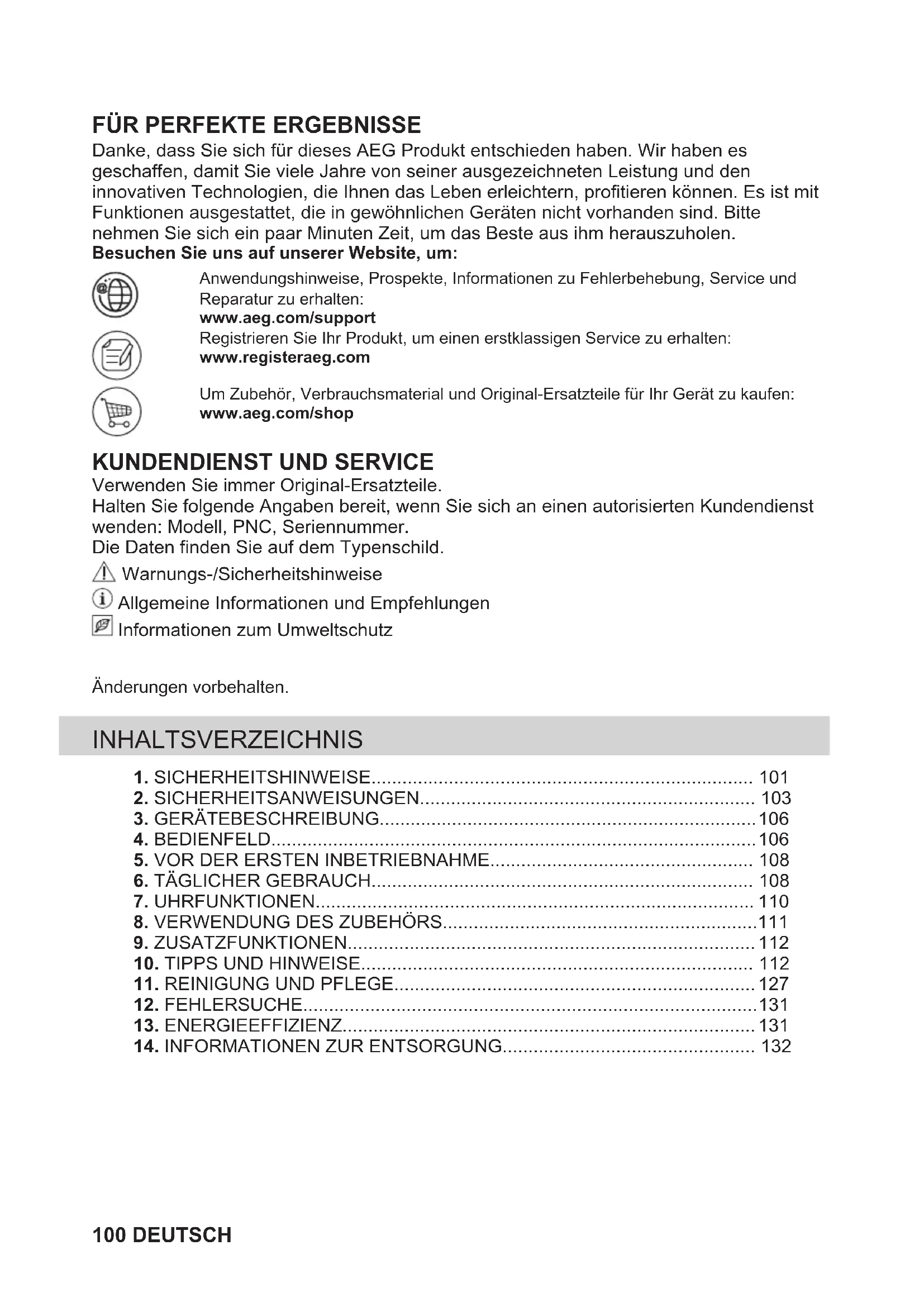 Danke, dass Sie sich für dieses AEG Produkt entschieden haben. Wir haben es geschaffen, damit Sie viele Jahre von seiner ausgezeichneten Leistung und den innovativen Technologien, die Ihnen das Leben erleichtern, profitieren können. Es ist mit Funktionen ausgestattet, die in gewöhnlichen Geräten nicht vorhanden sind. Bitte nehmen Sie sich ein paar Minuten Zeit, um das Beste aus ihm herauszuholen. Besuchen Sie uns auf unserer Website, um: Anwendungshinweise, Prospekte, Informationen zu Fehlerbehebung, Service undReparatur zu erhalten:www.aeg.com/supportRegistrieren Sie Ihr Produkt, um einen erstklassigen Service zu erhalten:www.registeraeg.comUm Zubehör, Verbrauchsmaterial und Original-Ersatzteile für Ihr Gerät zu kaufen:www.aeg.com/shop