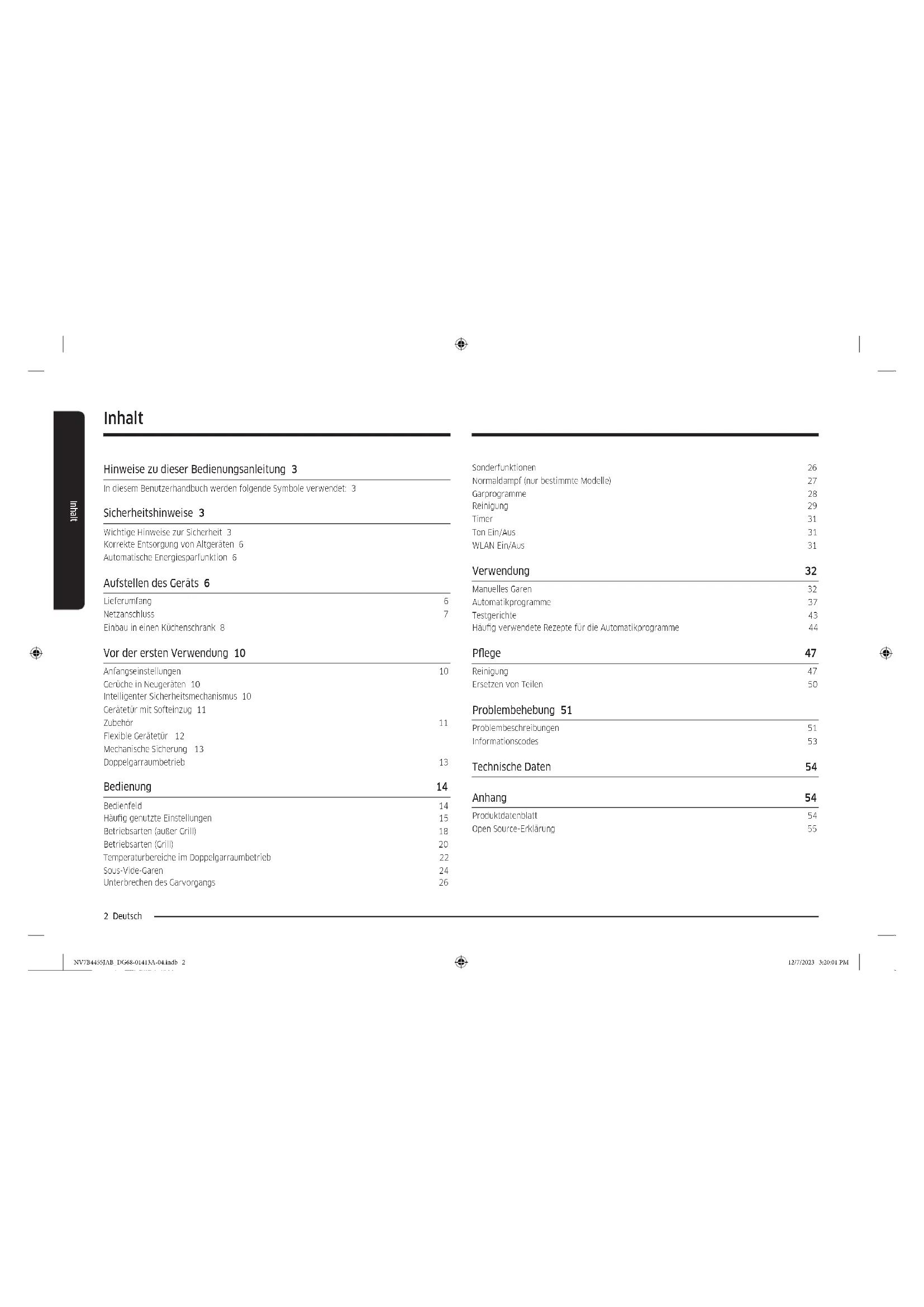 Chamada para a rede xa nacional Dias úteis das 9h às 20h www.samsung.com/pt/support SPAIN 91 175 00 15 www.samsung.com/es/support SWEDEN 0771-400 300 www.samsung.com/se/support SWITZERLAND 0800 726 786 www.samsung.com/ch/support (German) www.samsung.com/ch_fr/support (French) UK 0333 000 0333 www.samsung.com/uk/support IRELAND (EIRE) 0818 717100 www.samsung.com/ie/support DG68-01413A-04 NV7B4455JAB_DG68-01413A-04.indb 56NV7B4455JAB_DG68-01413A-04.indb 56 12/7/2023 3:19:59 PM12/7/2023 3:19:59 PMEinbaubackofen Benutzer- und Installationshandbuch NV7B441****/ NV7B442****/ NV7B443****/ NV7B444****/ NV7B445****/ NV7B441**C*/ NV7B442**C*/ NV7B444**C*/ NV7B451****/ NV7B452****/ NV7B453****/ NV7B454****/ NV7B455**** NV7B4455JAB_DG68-01413A-04.indb 1NV7B4455JAB_DG68-01413A-04.indb 1 12/7/2023 3:20:01 PM12/7/2023 3:20:01 PM2 Deutsch Inhalt Inhalt Hinweise zu dieser Bedienungsanleitung 3 In diesem Benutzerhandbuch werden folgende Symbole verwendet: 3 Sicherheitshinweise 3 Wichtige Hinweise zur Sicherheit 3 Korrekte Entsorgung von Altgeräten 6 Automatische Energiesparfunktion 6 Aufstellen des Geräts 6 Lieferumfang 6 Netzanschluss 7 Einbau in einen Küchenschrank 8 Vor der ersten Verwendung 10 Anfangseinstellungen 10 Gerüche in Neugeräten 10 Intelligenter Sicherheitsmechanismus 10 Gerätetür mit Softeinzug 11 Zubehör 11 Flexible Gerätetür 12 Mechanische Sicherung 13 Doppelgarraumbetrieb 13 Bedienung 14 Bedienfeld 14 Häug genutzte Einstellungen 15 Betriebsarten (außer Grill) 18 Betriebsarten (Grill) 20 Temperaturbereiche im Doppelgarraumbetrieb 22 Sous-Vide-Garen 24 Unterbrechen des Garvorgangs 26 Sonderfunktionen 26 Normaldampf (nur bestimmte Modelle) 27 Garprogramme 28 Reinigung 29 Timer 31 Ton Ein/Aus 31 WLAN Ein/Aus 31 Verwendung 32 Manuelles Garen 32 Automatikprogramme 37 Testgerichte 43 Häug verwendete Rezepte für die Automatikprogramme 44 Pege 47 Reinigung 47 Ersetzen von Teilen 50 Problembehebung 51 Problembeschreibungen 51 Informationscodes 53 Technische Daten 54 Anhang 54 Produktdatenblatt 54 Open Source-Erklärung 55 NV7B4455JAB_DG68-01413A-04.indb 2NV7B4455JAB_DG68-01413A-04.indb 2 12/7/2023 3:20:01 PM12/7/2023 3:20:01 PMDeutsch 3 Hinweise zu dieser Bedienungsanleitung Sicherheitshinweise Die Installation dieses Geräts darf nur von einem zugelassenen Elektriker durchgeführt werden. Der Installateur ist dafür verantwortlich, das Gerät an das Stromnetz anzuschließen und dabei die einschlägigen Sicherheitsbestimmungen zu beachten. Wichtige Hinweise zur Sicherheit WARNUNG Dieses Gerät ist nicht zur Verwendung durch Personen (einschließlich Kindern) mit verringerten körperlichen, sensorischen oder mentalen Fähigkeiten oder einem Mangel an Erfahrung und Wissen bestimmt, sofern sie nicht von einer für ihre Sicherheit verantwortlichen Person im Umgang mit dem Gerät unterwiesen wurden und von dieser beaufsichtigt werden. Kinder müssen beaufsichtigt werden, um zu verhindern, dass sie mit dem Gerät spielen. Die Trennungsvorrichtungen sind entsprechend den Anschlussvorschriften in die fest verlegte Leitung einzubauen. Das Gerät muss so aufgestellt werden, dass es auch nach der Installation vom Netz getrennt werden kann. Dies kann erreicht werden, indem der Stecker stets zugänglich bleibt oder in die fest verlegte Leitung ein den Anschlussvorschriften entsprechender Schalter eingebaut wird. Falls das Netzkabel beschädigt ist, muss es vom Hersteller oder vom Kundendienst bzw. von einer entsprechend qualizierten Fachkraft ausgetauscht werden, um Gefährdungen auszuschließen. Hinweise zu dieser Bedienungsanleitung Vielen Dank, dass Sie sich für einen Einbaubackofen von SAMSUNG entschieden haben. Dieses Handbuch enthält wichtige Informationen zur Sicherheit und Anweisungen, die Ihnen helfen sollen, Ihr Gerät zu bedienen und zu pegen. Bitte nehmen Sie sich vor der Inbetriebnahme Ihres Geräts Zeit, um dieses Handbuch zu lesen und halten Sie es zur späteren Verwendung bereit. In diesem Benutzerhandbuch werden folgende Symbole verwendet: WARNUNG Gefährliche bzw. unsichere Praktiken, die zu schweren Verletzungen, Tod und/oder Sachschäden führen können. VORSICHT Gefährliche bzw. unsichere Praktiken, die zu Verletzungen und/oder Sachschäden führen können. HINWEIS Nützliche Tipps, Empfehlungen oder Informationen, die Ihnen den Umgang mit dem Gerät erleichtern. NV7B4455JAB_DG68-01413A-04.indb 3NV7B4455JAB_DG68-01413A-04.indb 3 12/7/2023 3:20:01 PM12/7/2023 3:20:01 PM4 Deutsch Sicherheitshinweise Sicherheitshinweise Bei der angegebenen Befestigungsart dürfen keine Klebemittel eingesetzt werden, da sie keinen ausreichenden Halt bieten. Dieses Gerät darf von Kindern unter 8 Jahren nicht verwendet werden. Kinder mit höherem Alter und Personen mit verminderten körperlichen, sensorischen oder geistigen Fähigkeiten oder einem Mangel an Erfahrung und Wissen nur dann bedient werden, wenn sie unter Aufsicht stehen oder eine Unterweisung zum sicheren Umgang mit dem Gerät erhalten haben und die damit verbundenen Gefahren verstehen. Kinder dürfen nicht mit dem Gerät spielen. Kinder dürfen bei Reinigung und Wartung nur dann helfen, wenn sie dabei beaufsichtigt werden. Halten Sie das Gerät und das Netzkabel außerhalb der Reichweite von Kindern unter 8 Jahren. Das Gerät erhitzt sich im Betrieb. Es ist Vorsicht geboten, damit Sie die Heizelemente im Innern des Geräts nicht berühren. WARNUNG: Zugängliche Teile können sich im Betrieb erwärmen. Halten Sie Kinder deshalb fern. Benutzen Sie keine scharfen Scheuermittel oder Metallschaber, um den Glaseinsatz der Gerätetür zu reinigen. Sie könnten die Oberäche zerkratzen und damit das Glas zerbrechen lassen. Wenn dieses Gerät über eine Reinigungsfunktion verfügt, müssen Sie überschüssiges Wasser und Kochutensilien vor Verwendung der Dampf- oder Selbstreinigung aus dem Gerät entfernen. Die Reinigungsfunktion ist modellabhängig. Wenn dieses Gerät über eine Reinigungsfunktion verfügt, können die Oberächen währe