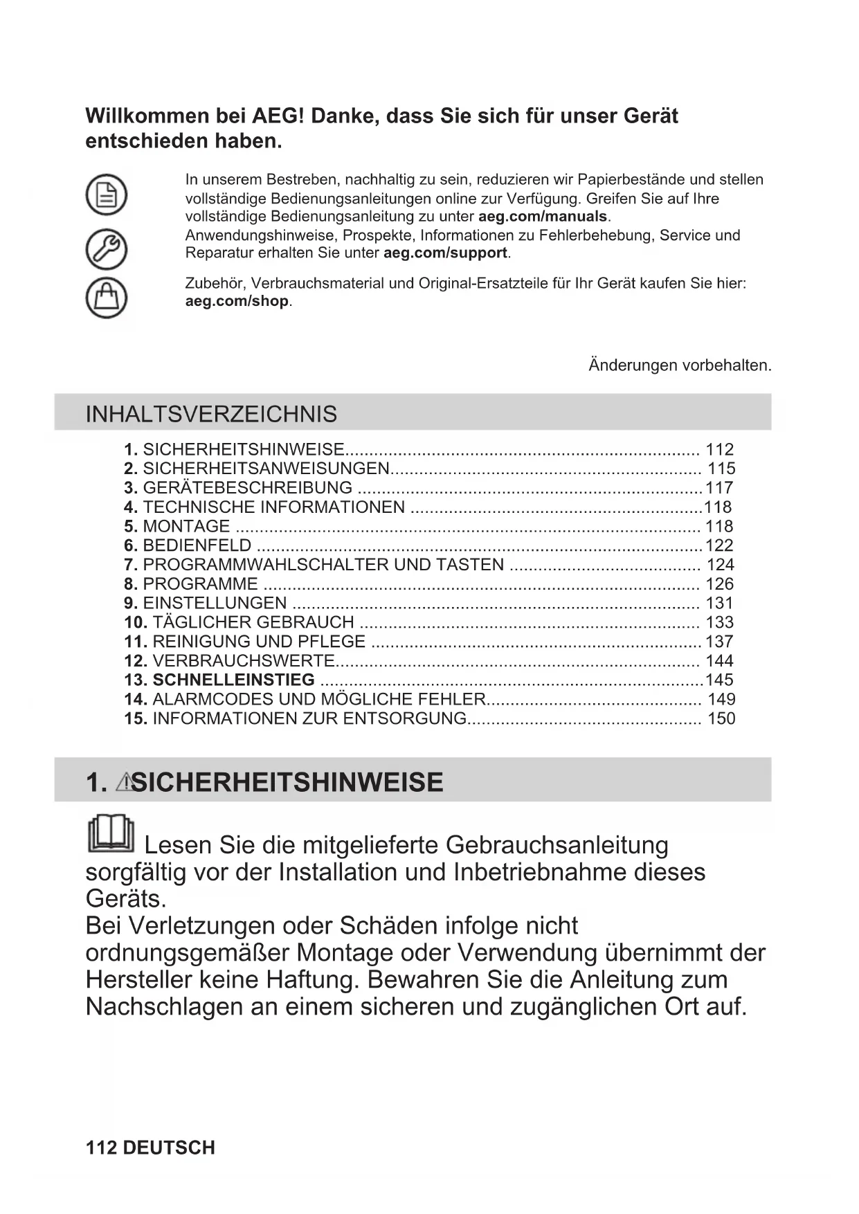 Recyclez les matériaux portant le symbole . Déposez les emballages dans les conteneurs prévus à cet effet. Contribuez à la protection de l'environnement et à votre sécurité, recyclez vos produits électriques et électroniques. Ne jetez pas les appareils portant le symbole avec les ordures ménagères. Emmenez un tel produit dans votre centre local de recyclage ou contactez vos services municipaux. Concerne la France uniquement : FRANÇAIS 111Willkommen bei AEG! Danke, dass Sie sich für unser Gerät entschieden haben. In unserem Bestreben, nachhaltig zu sein, reduzieren wir Papierbestände und stellenvollständige Bedienungsanleitungen online zur Verfügung. Greifen Sie auf Ihrevollständige Bedienungsanleitung zu unter aeg.com/manuals.Anwendungshinweise, Prospekte, Informationen zu Fehlerbehebung, Service undReparatur erhalten Sie unter aeg.com/support.Zubehör, Verbrauchsmaterial und Original-Ersatzteile für Ihr Gerät kaufen Sie hier: aeg.com/shop.Änderungen vorbehalten. INHALTSVERZEICHNIS