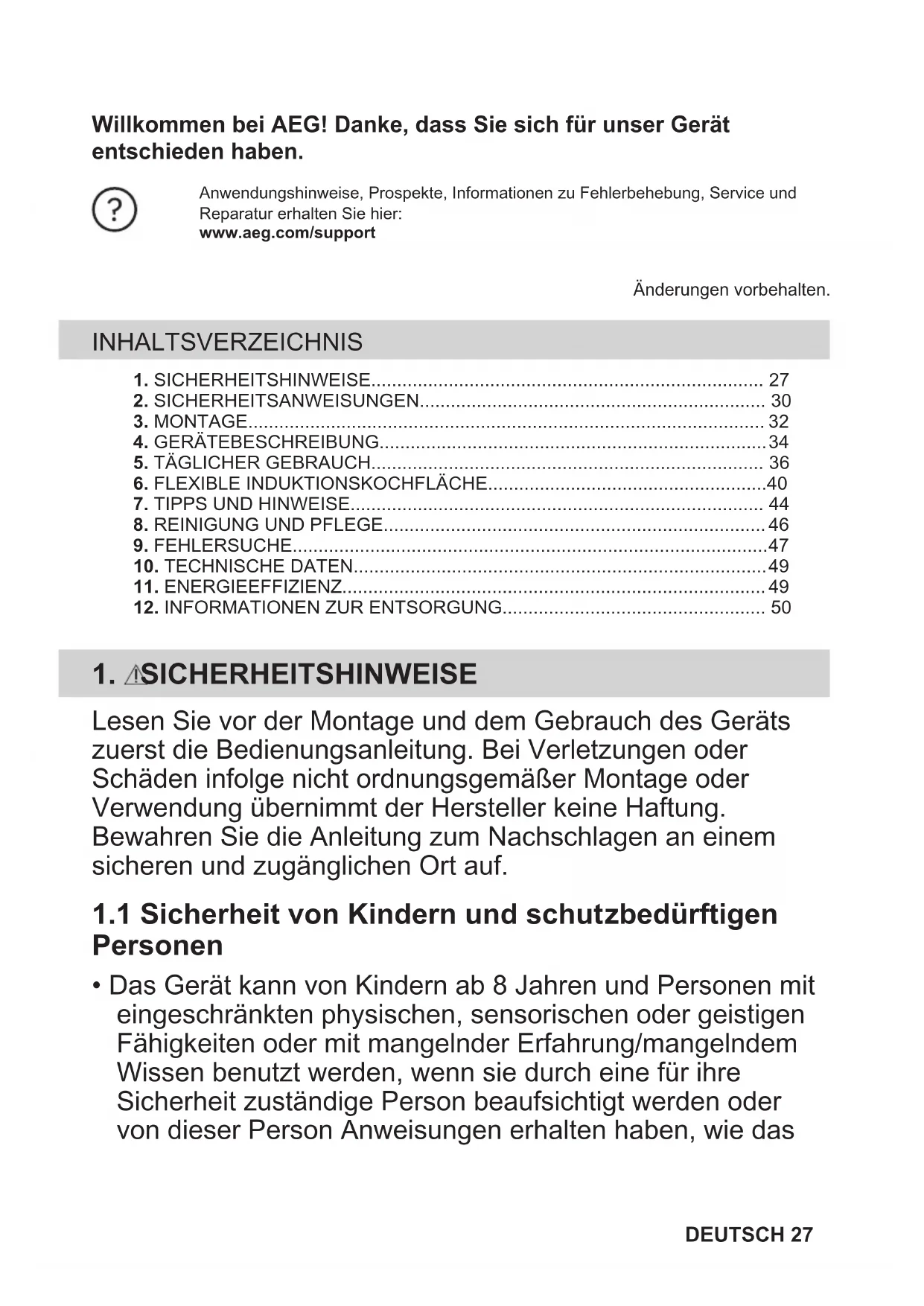 - Das Gerät kann von Kindern ab 8 Jahren und Personen mit eingeschränkten physischen, sensorischen oder geistigen Fähigkeiten oder mit mangelnder Erfahrung/mangelndem Wissen benutzt werden, wenn sie durch eine für ihre Sicherheit zuständige Person beaufsichtigt werden oder von dieser Person Anweisungen erhalten haben, wie das DEUTSCH 27Gerät sicher zu bedienen ist und welche Gefahren bei nicht ordnungsgemäßer Bedienung bestehen. Kinder unter 8 Jahren und Personen mit schweren Behinderungen oder Mehrfachbehinderung sollten vom Gerät ferngehalten werden, wenn sie nicht ständig beaufsichtigt werden.