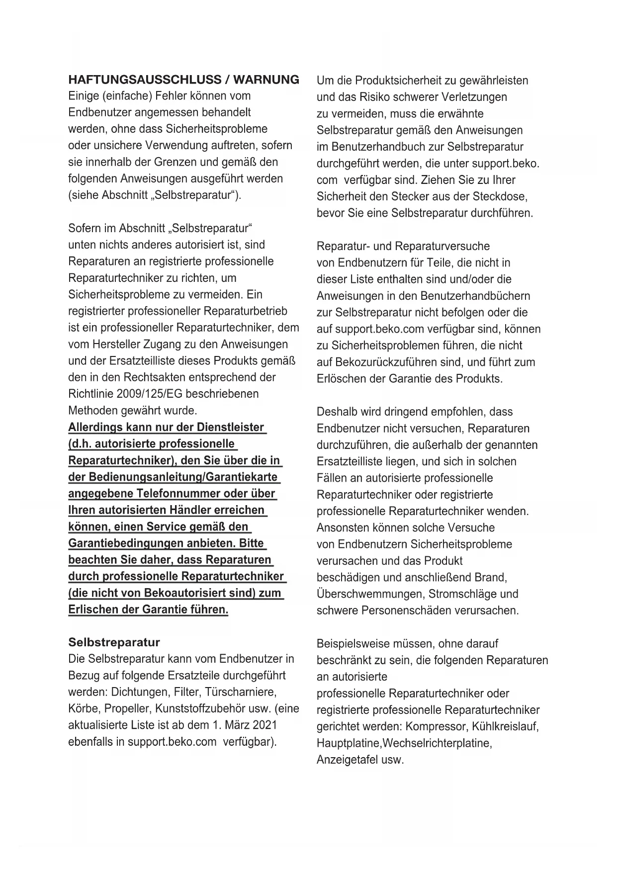 The minimum duration of guarantee of the refrigerator that you purchased is 24 months. This product is equipped with a lighting source of the “G” energy class. The lighting source in this product shall only be replaced by professional repairers.HAFTUNGSAUSSCHLUSS / WARNUNG Einige (einfache) Fehler können vom Endbenutzer angemessen behandelt werden, ohne dass Sicherheitsprobleme oder unsichere Verwendung auftreten, sofern sie innerhalb der Grenzen und gemäß den folgenden Anweisungen ausgeführt werden (siehe Abschnitt „Selbstreparatur“). Sofern im Abschnitt „Selbstreparatur“ unten nichts anderes autorisiert ist, sind Reparaturen an registrierte professionelle Reparaturtechniker zu richten, um Sicherheitsprobleme zu vermeiden. Ein registrierter professioneller Reparaturbetrieb ist ein professioneller Reparaturtechniker, dem vom Hersteller Zugang zu den Anweisungen und der Ersatzteilliste dieses Produkts gemäß den in den Rechtsakten entsprechend der Richtlinie 2009/125/EG beschriebenen Methoden gewährt wurde. Allerdings kann nur der Dienstleister (d.h. autorisierte professionelle Reparaturtechniker), den Sie über die in der Bedienungsanleitung/Garantiekarte angegebene Telefonnummer oder über Ihren autorisierten Händler erreichen können, einen Service gemäß den Garantiebedingungen anbieten. Bitte beachten Sie daher, dass Reparaturen durch professionelle Reparaturtechniker (die nicht von Bekoautorisiert sind) zum Erlischen der Garantie führen. Selbstreparatur Die Selbstreparatur kann vom Endbenutzer in Bezug auf folgende Ersatzteile durchgeführt werden: Dichtungen, Filter, Türscharniere, Körbe, Propeller, Kunststoffzubehör usw. (eine aktualisierte Liste ist ab dem 1. März 2021 ebenfalls in support.beko.com verfügbar). Um die Produktsicherheit zu gewährleisten und das Risiko schwerer Verletzungen zu vermeiden, muss die erwähnte Selbstreparatur gemäß den Anweisungen im Benutzerhandbuch zur Selbstreparatur durchgeführt werden, die unter support.beko. com verfügbar sind. Ziehen Sie zu Ihrer Sicherheit den Stecker aus der Steckdose, bevor Sie eine Selbstreparatur durchführen. Reparatur- und Reparaturversuche von Endbenutzern für Teile, die nicht in dieser Liste enthalten sind und/oder die Anweisungen in den Benutzerhandbüchern zur Selbstreparatur nicht befolgen oder die auf support.beko.com verfügbar sind, können zu Sicherheitsproblemen führen, die nicht auf Bekozurückzuführen sind, und führt zum Erlöschen der Garantie des Produkts. Deshalb wird dringend empfohlen, dass Endbenutzer nicht versuchen, Reparaturen durchzuführen, die außerhalb der genannten Ersatzteilliste liegen, und sich in solchen Fällen an autorisierte professionelle Reparaturtechniker oder registrierte professionelle Reparaturtechniker wenden. Ansonsten können solche Versuche von Endbenutzern Sicherheitsprobleme verursachen und das Produkt beschädigen und anschließend Brand, Überschwemmungen, Stromschläge und schwere Personenschäden verursachen. Beispielsweise müssen, ohne darauf beschränkt zu sein, die folgenden Reparaturen an autorisierte professionelle Reparaturtechniker oder registrierte professionelle Reparaturtechniker gerichtet werden: Kompressor, Kühlkreislauf, Hauptplatine,Wechselrichterplatine, Anzeigetafel usw.Der Hersteller/Verkäufer kann in keinem Fall haftbar gemacht werden, in dem Endbenutzer die oben genannten Bestimmungen nicht einhalten. Die Ersatzteilverfügbarkeit des von Ihnen gekauften Kühlschrank beträgt 10 Jahre. Während dieser Zeit stehen Originalersatzteile zur Verfügung, um den Kühlschrank ordnungsgemäß zu betreiben. Die Mindestgarantiedauer für den von Ihnen gekauften Kühlschrank beträgt 24 Monate. Dieses Produkt ist mit einer Lichtquelle der Energieklasse „G“ ausgestattet. Die Lichtquelle in diesem Produkt darf nur von professionellen Reparaturtechnikern ersetzt werden.Sehr geehrter Kunde, Wir möchten Ihnen eine optimale Effizienz Ihres Produkts bieten, welches in modernen Betrieben mit akribischen Qualitätskontrollen hergestellt wurde. Hierzu bitten wir Sie die Bedienungsanleitung vollständig und gründlich durchzulesen und das Handbuch als Referenzquelle aufzubewahren. Wenn Sie das Produkt wiederum an eine andere Person weitergeben, geben Sie auch dieses Handbuch zusammen mit dem Produkt weiter. Das Benutzerhandbuch gewährleistet die schnelle und sichere Anwendung des Produkts.