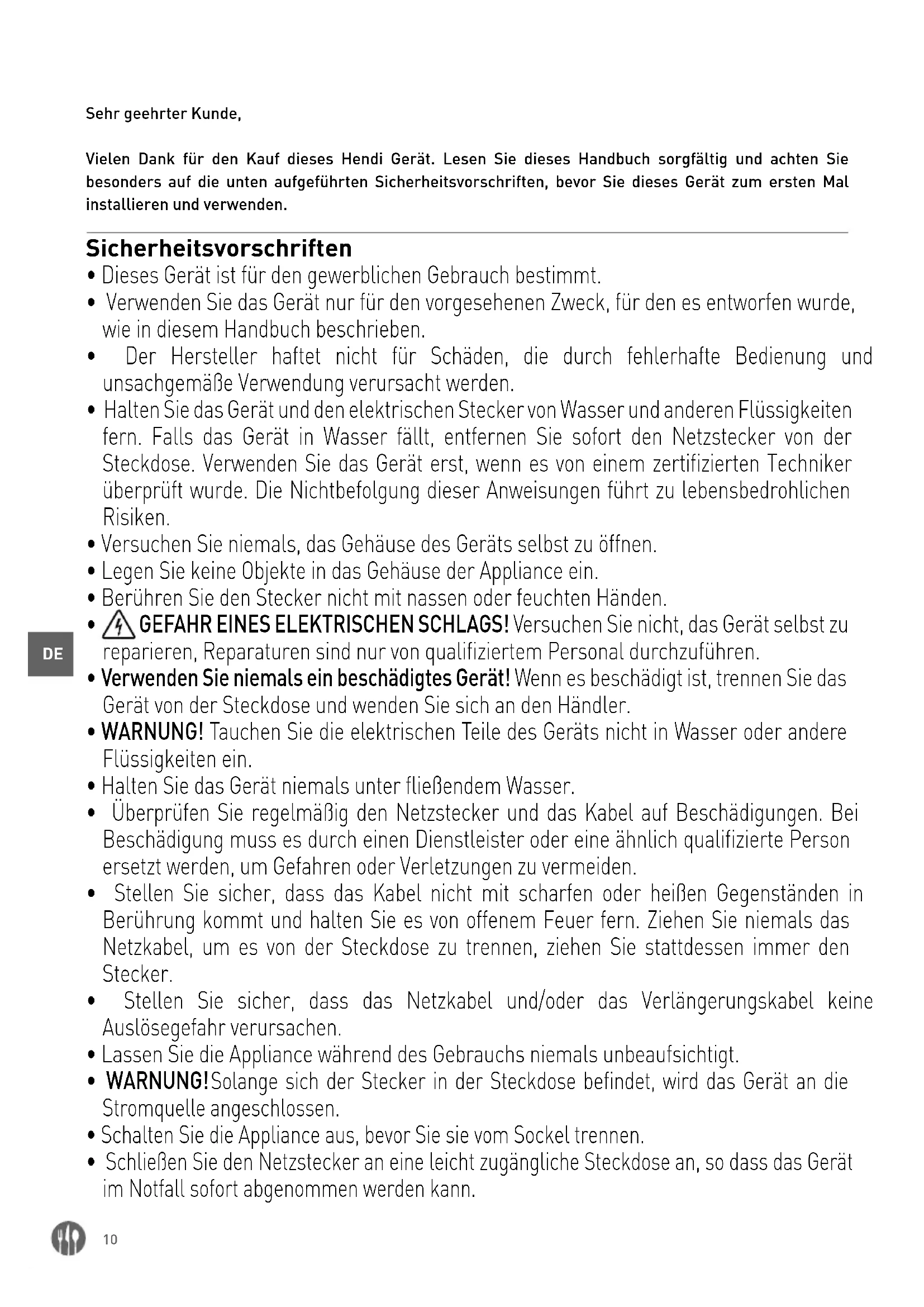 Sehr geehrter Kunde, Vielen Dank für den Kauf dieses Hendi Gerät. Lesen Sie dieses Handbuch sorgfältig und achten Sie besonders auf die unten aufgeführten Sicherheitsvorschriften, bevor Sie dieses Gerät zum ersten Mal installieren und verwenden. Sicherheitsvorschriften