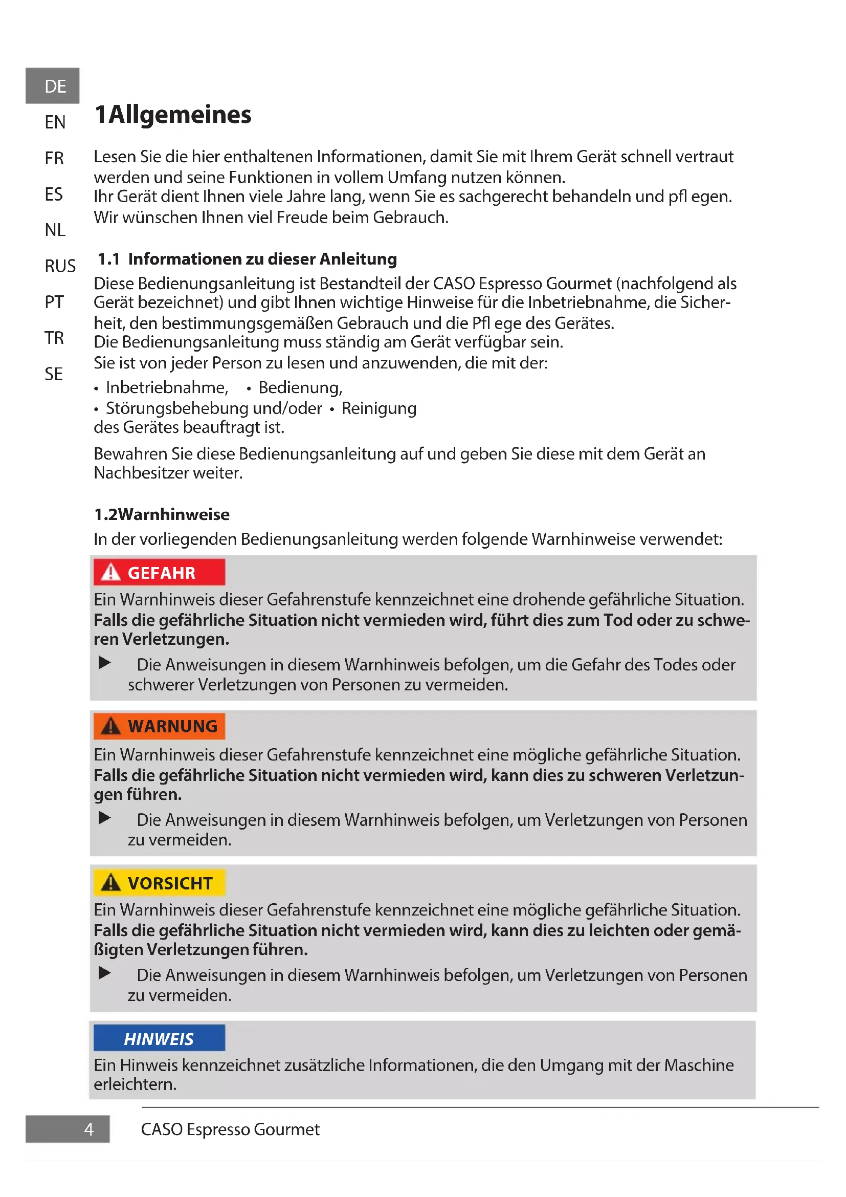 Diese Bedienungsanleitung ist Bestandteil der CASO Espresso Gourmet (nachfolgend als Gerät bezeichnet) und gibt Ihnen wichtige Hinweise für die Inbetriebnahme, die Sicher- heit, den bestimmungsgemäßen Gebrauch und die P ege des Gerätes. Die Bedienungsanleitung muss ständig am Gerät verfügbar sein. Sie ist von jeder Person zu lesen und anzuwenden, die mit der: