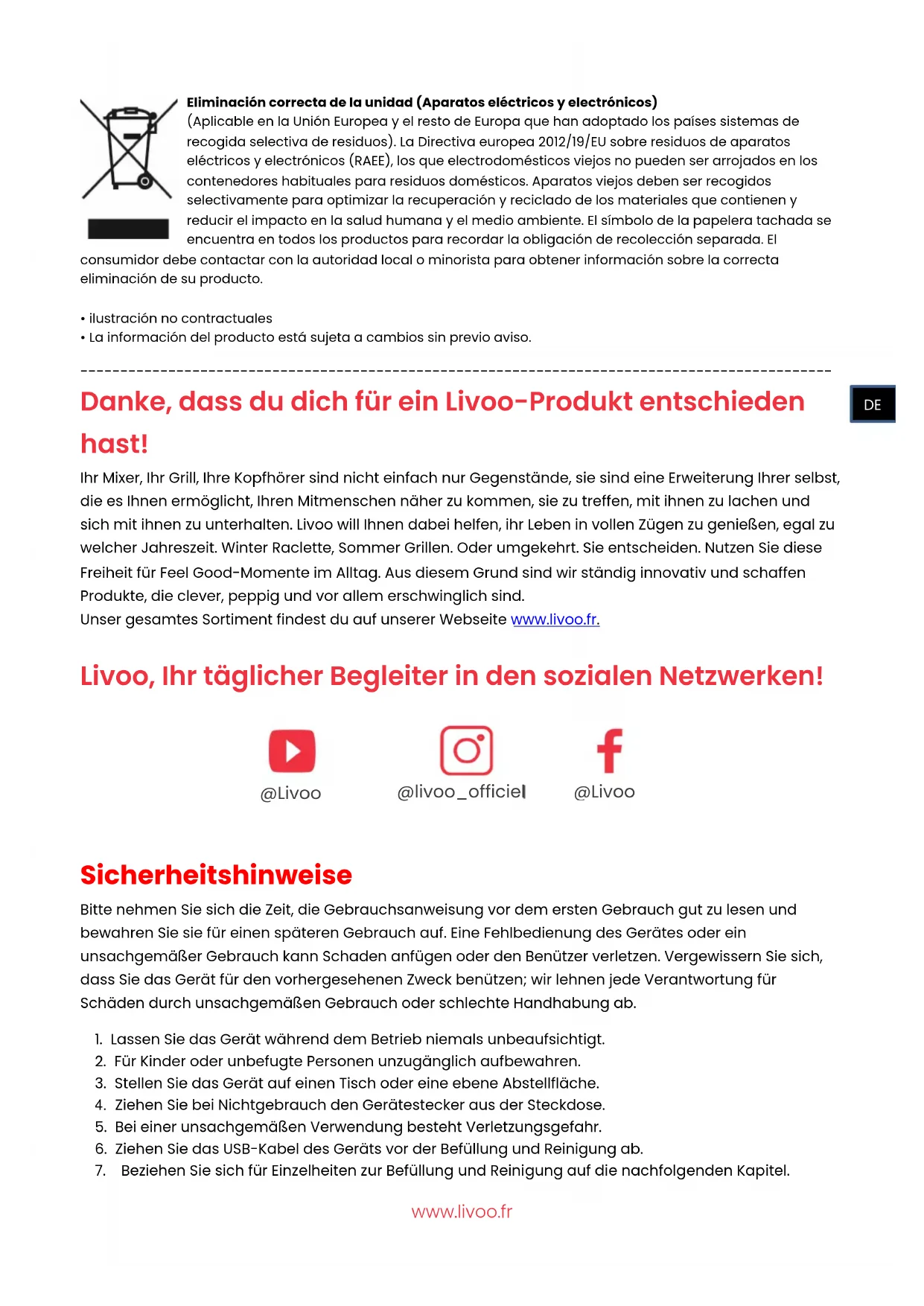 Danke, dass du dich für ein Livoo-Produkt entschieden hast! Ihr Mixer, Ihr Grill, Ihre Kopfhörer sind nicht einfach nur Gegenstände, sie sind eine Erweiterung Ihrer selbst, die es Ihnen ermöglicht, Ihren Mitmenschen näher zu kommen, sie zu treffen, mit ihnen zu lachen und sich mit ihnen zu unterhalten. Livoo will Ihnen dabei helfen, ihr Leben in vollen Zügen zu genießen, egal zu welcher Jahreszeit. Winter Raclette, Sommer Grillen. Oder umgekehrt. Sie entscheiden. Nutzen Sie diese Freiheit für Feel Good-Momente im Alltag. Aus diesem Grund sind wir ständig innovativ und schaffen Produkte, die clever, peppig und vor allem erschwinglich sind. Unser gesamtes Sortiment findest du auf unserer Webseite www.livoo.fr. Livoo, Ihr täglicher Begleiter in den sozialen Netzwerken!