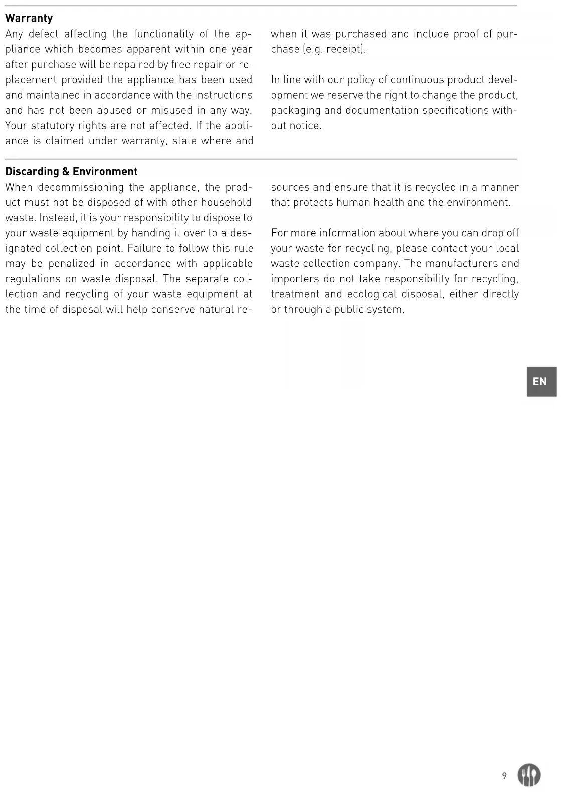 Garantie Alle innerhalb von einem Jahr nach dem Kaufda- tum festgestellten Defekte oder Mängel, die die Funktionalität des Gerätes beeinträchtigen, wer- den auf dem Wege der unentgeltlichen Reparatur bzw. des Austausches unter der Voraussetzung beseitigt, dass das Gerät in einer der Bedienungs- anleitung gemäßen Art und Weise betrieben und gewartet wird und weder vorsätzlich vernichtet noch nicht bestimmungsgemäß genutzt wurde. Ihre Rechte aus den entsprechenden Gesetzen bleiben davon unberührt. Eine in der Garantiefrist einzureichende Beanstandung hat die Angabe des Kaufortes und Kaufdatums und in der Anlage einen Kaufbeleg (z.B. Kassenzettel) zu enthalten. Gemäß unserer Politik der ständigen Weiterent- wicklung unserer Produkte behalten wir uns vor, Änderungen am Produkt, an seiner Verpackung und an den dokumentierten technischen Daten ohne vorherige Ankündigung vorzunehmen. Entsorgung und Umweltschutz Wird das Gerät außer Betrieb genommen, darf es nicht über den Hausmüll entsorgt werden. Der Be- nutzer ist für die Übergabe des Gerätes an eine ge- eignete Sammelstelle für Altgeräte verantwortlich. Die Nichteinhaltung dieser Regel kann gemäß den geltenden Vorschriften über die Abfallentsorgung bestraft werden. Die getrennte Sammlung und das Recycling der Altgeräte trägt zur Schonung der natürlichen Ressourcen bei und sorgt für eine umwelt- und gesundheitsschonende Verwertungs- weise. Weitere Informationen darüber, wo Sie Ihre Altge- räte entsorgen können, erhalten Sie bei Ihrem ört- lichen Entsorgungsunternehmen. Der Hersteller und der Importeur übernehmen keine Verantwor- tung für das Recycling sowie die umweltfreundli- che Verwertung von Abfällen, weder direkt noch über ein öffentliches System.18