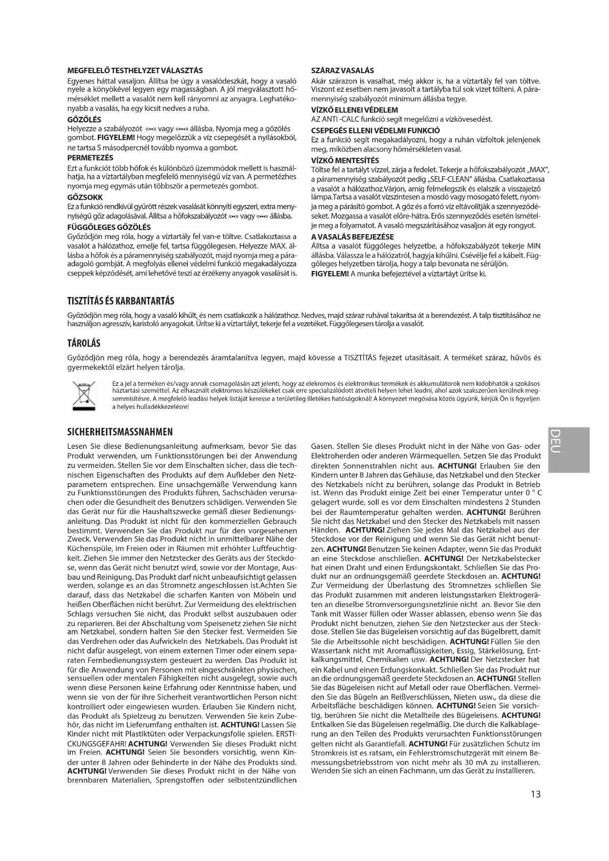Ez a jel a terméken és/vagy annak csomagolásán azt jelenti, hogy az elekromos és elektronikus termékek és akkumulátorok nem kidobhatók a szokásos háztartási szeméttel. Az elhasznált elektromos készülékeket csak erre specializálódott átvételi helyen lehet leadni, ahol azok szakszerűen kerülnek meg- semmisítésre. A megfelelő leadási helyek listáját keresse a területileg illetékes hatóságoknál! A környezet megóvása közös ügyünk, kérjük Ön is gyeljen a helyes hulladékkezelésre! DEU Lesen Sie diese Bedienungsanleitung aufmerksam, bevor Sie das Produkt verwenden, um Funktionsstörungen bei der Anwendung zu vermeiden. Stellen Sie vor dem Einschalten sicher, dass die tech- nischen Eigenschaften des Produkts auf dem Aufkleber den Netz- parametern entsprechen. Eine unsachgemäße Verwendung kann zu Funktionsstörungen des Produkts führen, Sachschäden verursa- chen oder die Gesundheit des Benutzers schädigen. Verwenden Sie das Gerät nur für die Haushaltszwecke gemäß dieser Bedienungs- anleitung. Das Produkt ist nicht für den kommerziellen Gebrauch bestimmt. Verwenden Sie das Produkt nur für den vorgesehenen Zweck. Verwenden Sie das Produkt nicht in unmittelbarer Nähe der Küchenspüle, im Freien oder in Räumen mit erhöhter Luftfeuchtig- keit. Ziehen Sie immer den Netzstecker des Geräts aus der Steckdo- se, wenn das Gerät nicht benutzt wird, sowie vor der Montage, Aus- bau und Reinigung. Das Produkt darf nicht unbeaufsichtigt gelassen werden, solange es an das Stromnetz angeschlossen ist.Achten Sie darauf, dass das Netzkabel die scharfen Kanten von Möbeln und heißen Oberächen nicht berührt. Zur Vermeidung des elektrischen Schlags versuchen Sie nicht, das Produkt selbst auszubauen oder zu reparieren. Bei der Abschaltung vom Speisenetz ziehen Sie nicht am Netzkabel, sondern halten Sie den Stecker fest. Vermeiden Sie das Verdrehen oder das Aufwickeln des Netzkabels. Das Produkt ist nicht dafür ausgelegt, von einem externen Timer oder einem sepa- raten Fernbedienungssystem gesteuert zu werden. Das Produkt ist für die Anwendung von Personen mit eingeschränkten physischen, sensuellen oder mentalen Fähigkeiten nicht ausgelegt, sowie auch wenn diese Personen keine Erfahrung oder Kenntnisse haben, und wenn sie von der für ihre Sicherheit verantwortlichen Person nicht kontrolliert oder eingewiesen wurden. Erlauben Sie Kindern nicht, das Produkt als Spielzeug zu benutzen. Verwenden Sie kein Zube- hör, das nicht im Lieferumfang enthalten ist. ACHTUNG! Lassen Sie Kinder nicht mit Plastiktüten oder Verpackungsfolie spielen. ERSTI- CKUNGSGEFAHR! ACHTUNG! Verwenden Sie dieses Produkt nicht im Freien. ACHTUNG! Seien Sie besonders vorsichtig, wenn Kin- der unter 8 Jahren oder Behinderte in der Nähe des Produkts sind. ACHTUNG! Verwenden Sie dieses Produkt nicht in der Nähe von brennbaren Materialien, Sprengstoen oder selbstentzündlichen Gasen. Stellen Sie dieses Produkt nicht in der Nähe von Gas- oder Elektroherden oder anderen Wärmequellen. Setzen Sie das Produkt direkten Sonnenstrahlen nicht aus. ACHTUNG! Erlauben Sie den Kindern unter 8 Jahren das Gehäuse, das Netzkabel und den Stecker des Netzkabels nicht zu berühren, solange das Produkt in Betrieb ist. Wenn das Produkt einige Zeit bei einer Temperatur unter 0 ° C gelagert wurde, soll es vor dem Einschalten mindestens 2 Stunden bei der Raumtemperatur gehalten werden. ACHTUNG! Berühren Sie nicht das Netzkabel und den Stecker des Netzkabels mit nassen Händen. ACHTUNG! Ziehen Sie jedes Mal das Netzkabel aus der Steckdose vor der Reinigung und wenn Sie das Gerät nicht benut- zen. ACHTUNG! Benutzen Sie keinen Adapter, wenn Sie das Produkt an eine Steckdose anschließen. ACHTUNG! Der Netzkabelstecker hat einen Draht und einen Erdungskontakt. Schließen Sie das Pro- dukt nur an ordnungsgemäß geerdete Steckdosen an. ACHTUNG! Zur Vermeidung der Überlastung des Stromnetzes schließen Sie das Produkt zusammen mit anderen leistungsstarken Elektrogerä- ten an dieselbe Stromversorgungsnetzlinie nicht an. Bevor Sie den Tank mit Wasser füllen oder Wasser ablassen, ebenso wenn Sie das Produkt nicht benutzen, ziehen Sie den Netzstecker aus der Steck- dose. Stellen Sie das Bügeleisen vorsichtig auf das Bügelbrett, damit Sie die Arbeitssohle nicht beschädigen. ACHTUNG! Füllen Sie den Wassertank nicht mit Aromaüssigkeiten, Essig, Stärkelösung, Ent- kalkungsmittel, Chemikalien usw. ACHTUNG! Der Netzstecker hat ein Kabel und einen Erdungskonkakt. Schließen Sie das Produkt nur an die ordnungsgemäß geerdete Steckdosen an. ACHTUNG! Stellen Sie das Bügeleisen nicht auf Metall oder raue Oberächen. Vermei- den Sie das Bügeln an Reißverschlüssen, Nieten usw., da diese die Arbeitsäche beschädigen können. ACHTUNG! Seien Sie vorsich- tig, berühren Sie nicht die Metallteile des Bügeleisens. ACHTUNG! Entkalken Sie das Bügeleisen regelmäßig. Die durch die Kalkablage- rung an den Teilen des Produkts verursachten Funktionsstörungen gelten nicht als Garantiefall. ACHTUNG! Für zusätzlichen Schutz im Stromkreis ist es ratsam, ein Fehlerstromschutzgerät mit einem Be- messungsbetriebsstrom von nicht mehr als 30 mA zu installieren. Wenden Sie sich an einen Fachmann, um das Gerät zu installieren. SICHERHEITSMASSNAHMEN14 Stecken Sie das Netzkabel des Bügeleisens in eine Steckdose. Die Kon- trollleuchte leuchtet auf. Stellen Sie den mechanischen Regler auf die erforderliche Temperatur ein. Wenn die Leuchte erlischt, können Sie mit dem Bügeln beginnen. Wenn Sie die Temperatur niedriger als beim vor- herigen Bügeln einstellen, wird es nicht empfohlen, mit dem Bügeln zu beginnen, bis die Anzeige wieder aueuchtet.