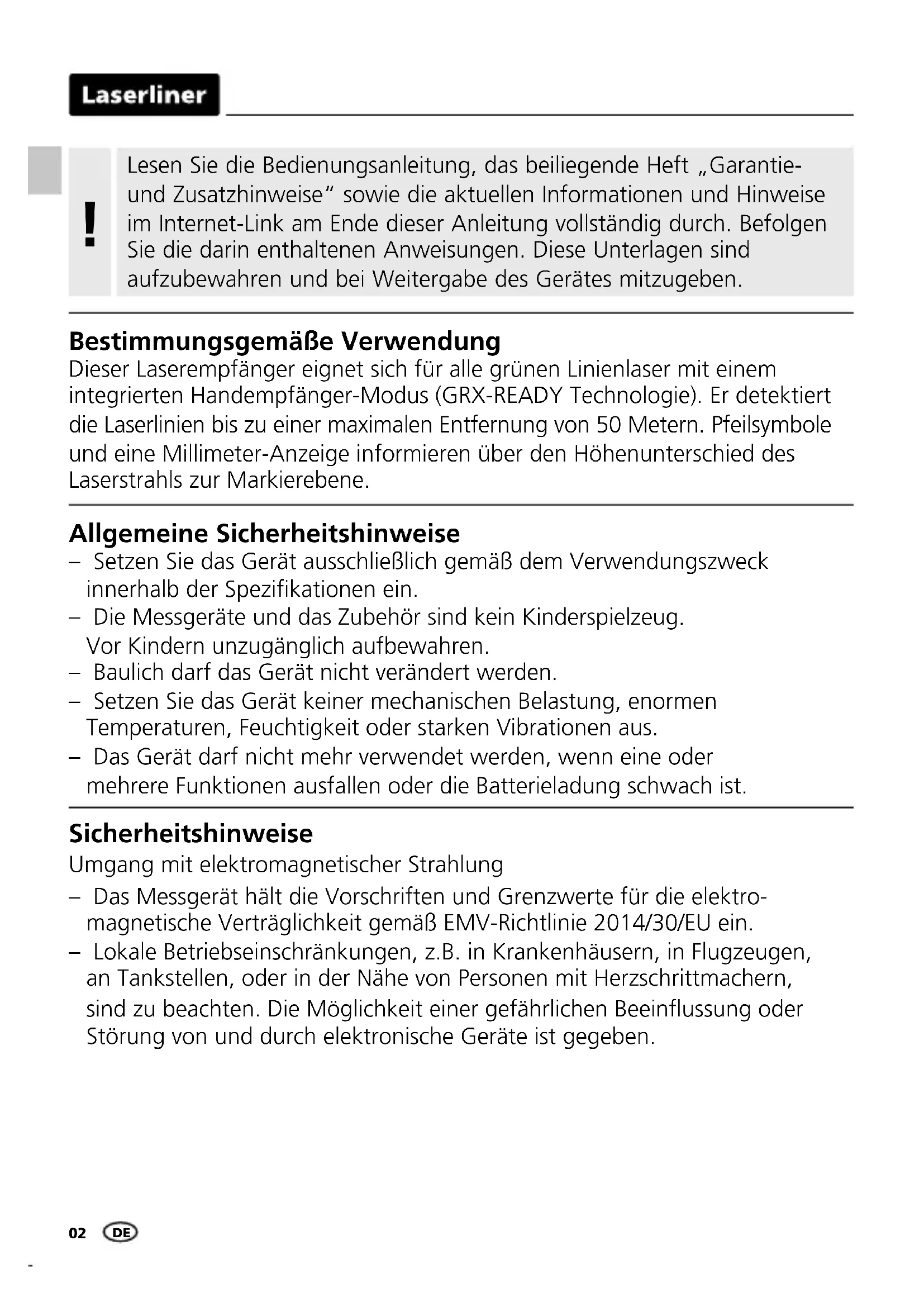 Bestimmungsgemäße Verwendung Dieser Laserempfänger eignet sich für alle grünen Linienlaser mit einem integrierten Handempfänger-Modus (GRX-READY Technologie). Er detektiert die Laserlinien bis zu einer maximalen Entfernung von 50 Metern. Pfeilsymbole und eine Millimeter-Anzeige informieren über den Höhenunterschied des Laserstrahls zur Markierebene. Allgemeine Sicherheitshinweise – Setzen Sie das Gerät ausschließlich gemäß dem Verwendungszweck innerhalb der Spezikationen ein. – Die Messgeräte und das Zubehör sind kein Kinderspielzeug. Vor Kindern unzugänglich aufbewahren. – Baulich darf das Gerät nicht verändert werden. – Setzen Sie das Gerät keiner mechanischen Belastung, enormen Temperaturen, Feuchtigkeit oder starken Vibrationen aus. – Das Gerät darf nicht mehr verwendet werden, wenn eine oder mehrere Funktionen ausfallen oder die Batterieladung schwach ist. Sicherheitshinweise Umgang mit elektromagnetischer Strahlung – Das Messgerät hält die Vorschriften und Grenzwerte für die elektro- magnetische Verträglichkeit gemäß EMV-Richtlinie 2014/30/EU ein. – Lokale Betriebseinschränkungen, z.B. in Krankenhäusern, in Flugzeugen, an Tankstellen, oder in der Nähe von Personen mit Herzschrittmachern, sind zu beachten. Die Möglichkeit einer gefährlichen Beeinussung oder Störung von und durch elektronische Geräte ist gegeben. Lesen Sie die Bedienungsanleitung, das beiliegende Heft „Garantie- und Zusatzhinweise“ sowie die aktuellen Informationen und Hinweise im Internet-Link am Ende dieser Anleitung vollständig durch. Befolgen Sie die darin enthaltenen Anweisungen. Diese Unterlagen sind aufzubewahren und bei Weitergabe des Gerätes mitzugeben. !RangeXtender M 50