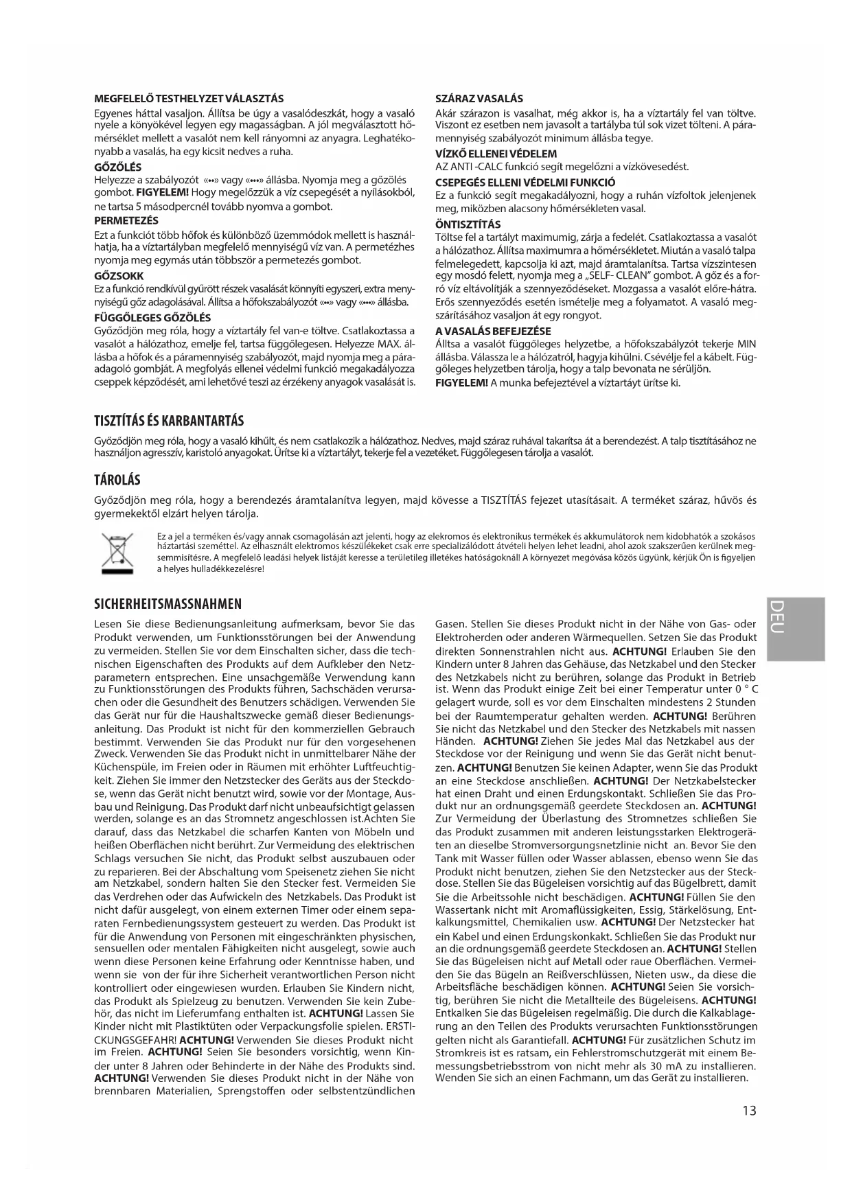 Ez a jel a terméken és/vagy annak csomagolásán azt jelenti, hogy az elekromos és elektronikus termékek és akkumulátorok nem kidobhatók a szokásos háztartási szeméttel. Az elhasznált elektromos készülékeket csak erre specializálódott átvételi helyen lehet leadni, ahol azok szakszerűen kerülnek meg- semmisítésre. A megfelelő leadási helyek listáját keresse a területileg illetékes hatóságoknál! A környezet megóvása közös ügyünk, kérjük Ön is gyeljen a helyes hulladékkezelésre! DEU Lesen Sie diese Bedienungsanleitung aufmerksam, bevor Sie das Produkt verwenden, um Funktionsstörungen bei der Anwendung zu vermeiden. Stellen Sie vor dem Einschalten sicher, dass die tech- nischen Eigenschaften des Produkts auf dem Aufkleber den Netz- parametern entsprechen. Eine unsachgemäße Verwendung kann zu Funktionsstörungen des Produkts führen, Sachschäden verursa- chen oder die Gesundheit des Benutzers schädigen. Verwenden Sie das Gerät nur für die Haushaltszwecke gemäß dieser Bedienungs- anleitung. Das Produkt ist nicht für den kommerziellen Gebrauch bestimmt. Verwenden Sie das Produkt nur für den vorgesehenen Zweck. Verwenden Sie das Produkt nicht in unmittelbarer Nähe der Küchenspüle, im Freien oder in Räumen mit erhöhter Luftfeuchtig- keit. Ziehen Sie immer den Netzstecker des Geräts aus der Steckdo- se, wenn das Gerät nicht benutzt wird, sowie vor der Montage, Aus- bau und Reinigung. Das Produkt darf nicht unbeaufsichtigt gelassen werden, solange es an das Stromnetz angeschlossen ist.Achten Sie darauf, dass das Netzkabel die scharfen Kanten von Möbeln und heißen Oberächen nicht berührt. Zur Vermeidung des elektrischen Schlags versuchen Sie nicht, das Produkt selbst auszubauen oder zu reparieren. Bei der Abschaltung vom Speisenetz ziehen Sie nicht am Netzkabel, sondern halten Sie den Stecker fest. Vermeiden Sie das Verdrehen oder das Aufwickeln des Netzkabels. Das Produkt ist nicht dafür ausgelegt, von einem externen Timer oder einem sepa- raten Fernbedienungssystem gesteuert zu werden. Das Produkt ist für die Anwendung von Personen mit eingeschränkten physischen, sensuellen oder mentalen Fähigkeiten nicht ausgelegt, sowie auch wenn diese Personen keine Erfahrung oder Kenntnisse haben, und wenn sie von der für ihre Sicherheit verantwortlichen Person nicht kontrolliert oder eingewiesen wurden. Erlauben Sie Kindern nicht, das Produkt als Spielzeug zu benutzen. Verwenden Sie kein Zube- hör, das nicht im Lieferumfang enthalten ist. ACHTUNG! Lassen Sie Kinder nicht mit Plastiktüten oder Verpackungsfolie spielen. ERSTI- CKUNGSGEFAHR! ACHTUNG! Verwenden Sie dieses Produkt nicht im Freien. ACHTUNG! Seien Sie besonders vorsichtig, wenn Kin- der unter 8 Jahren oder Behinderte in der Nähe des Produkts sind. ACHTUNG! Verwenden Sie dieses Produkt nicht in der Nähe von brennbaren Materialien, Sprengstoen oder selbstentzündlichen Gasen. Stellen Sie dieses Produkt nicht in der Nähe von Gas- oder Elektroherden oder anderen Wärmequellen. Setzen Sie das Produkt direkten Sonnenstrahlen nicht aus. ACHTUNG! Erlauben Sie den Kindern unter 8 Jahren das Gehäuse, das Netzkabel und den Stecker des Netzkabels nicht zu berühren, solange das Produkt in Betrieb ist. Wenn das Produkt einige Zeit bei einer Temperatur unter 0 ° C gelagert wurde, soll es vor dem Einschalten mindestens 2 Stunden bei der Raumtemperatur gehalten werden. ACHTUNG! Berühren Sie nicht das Netzkabel und den Stecker des Netzkabels mit nassen Händen. ACHTUNG! Ziehen Sie jedes Mal das Netzkabel aus der Steckdose vor der Reinigung und wenn Sie das Gerät nicht benut- zen. ACHTUNG! Benutzen Sie keinen Adapter, wenn Sie das Produkt an eine Steckdose anschließen. ACHTUNG! Der Netzkabelstecker hat einen Draht und einen Erdungskontakt. Schließen Sie das Pro- dukt nur an ordnungsgemäß geerdete Steckdosen an. ACHTUNG! Zur Vermeidung der Überlastung des Stromnetzes schließen Sie das Produkt zusammen mit anderen leistungsstarken Elektrogerä- ten an dieselbe Stromversorgungsnetzlinie nicht an. Bevor Sie den Tank mit Wasser füllen oder Wasser ablassen, ebenso wenn Sie das Produkt nicht benutzen, ziehen Sie den Netzstecker aus der Steck- dose. Stellen Sie das Bügeleisen vorsichtig auf das Bügelbrett, damit Sie die Arbeitssohle nicht beschädigen. ACHTUNG! Füllen Sie den Wassertank nicht mit Aromaüssigkeiten, Essig, Stärkelösung, Ent- kalkungsmittel, Chemikalien usw. ACHTUNG! Der Netzstecker hat ein Kabel und einen Erdungskonkakt. Schließen Sie das Produkt nur an die ordnungsgemäß geerdete Steckdosen an. ACHTUNG! Stellen Sie das Bügeleisen nicht auf Metall oder raue Oberächen. Vermei- den Sie das Bügeln an Reißverschlüssen, Nieten usw., da diese die Arbeitsäche beschädigen können. ACHTUNG! Seien Sie vorsich- tig, berühren Sie nicht die Metallteile des Bügeleisens. ACHTUNG! Entkalken Sie das Bügeleisen regelmäßig. Die durch die Kalkablage- rung an den Teilen des Produkts verursachten Funktionsstörungen gelten nicht als Garantiefall. ACHTUNG! Für zusätzlichen Schutz im Stromkreis ist es ratsam, ein Fehlerstromschutzgerät mit einem Be- messungsbetriebsstrom von nicht mehr als 30 mA zu installieren. Wenden Sie sich an einen Fachmann, um das Gerät zu installieren. SICHERHEITSMASSNAHMEN14 Stecken Sie das Netzkabel des Bügeleisens in eine Steckdose. Die Kon- trollleuchte leuchtet auf. Stellen Sie den mechanischen Regler auf die erforderliche Temperatur ein. Wenn die Leuchte erlischt, können Sie mit dem Bügeln beginnen. Wenn Sie die Temperatur niedriger als beim vor- herigen Bügeln einstellen, wird es nicht empfohlen, mit dem Bügeln zu beginnen, bis die Anzeige wieder aueuchtet.