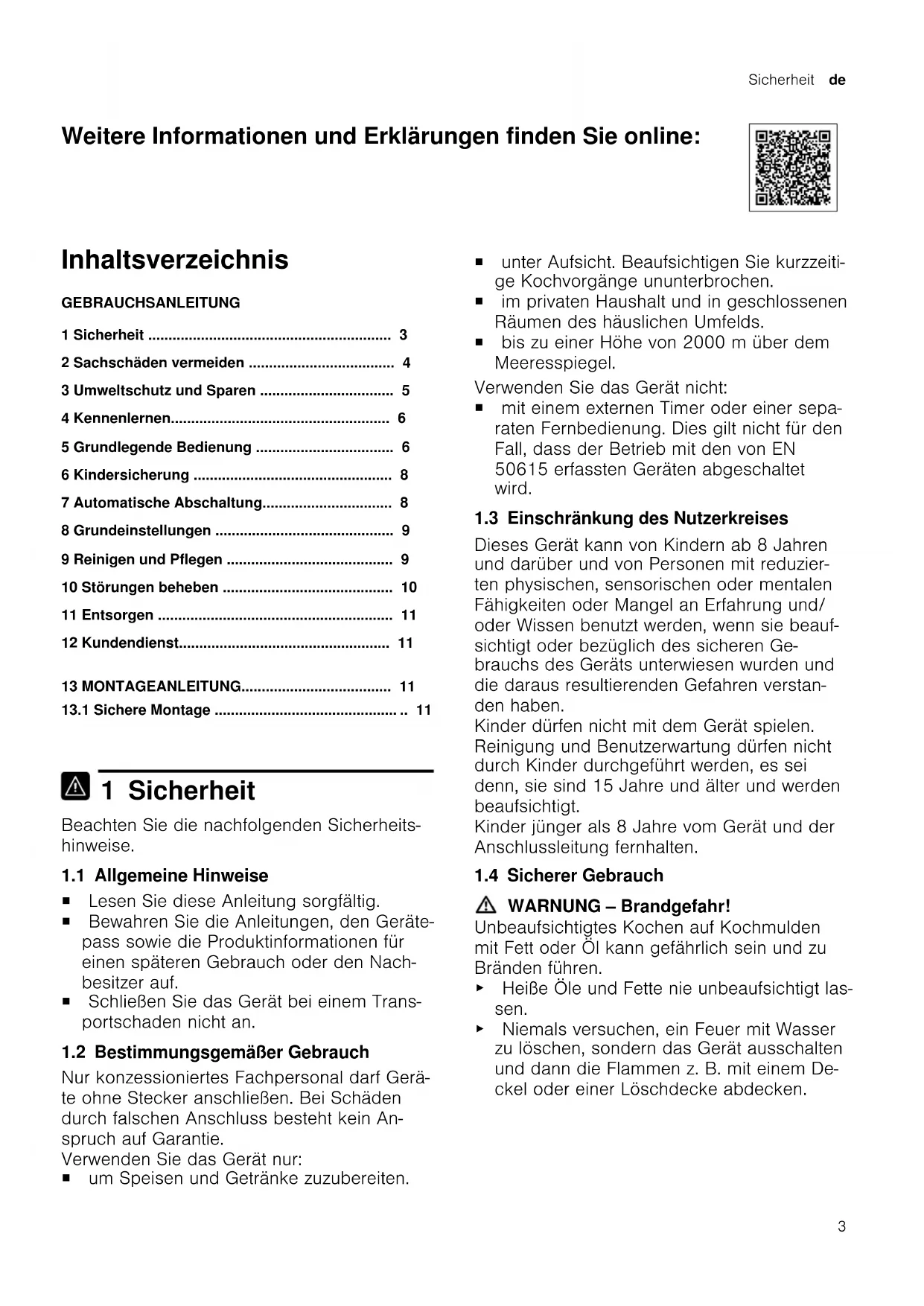 1 Sicherheit Beachten Sie die nachfolgenden Sicherheits- hinweise. 1.1 Allgemeine Hinweise ¡ Lesen Sie diese Anleitung sorgfältig. ¡ Bewahren Sie die Anleitungen, den Geräte- pass sowie die Produktinformationen für einen späteren Gebrauch oder den Nach- besitzer auf. ¡ Schließen Sie das Gerät bei einem Trans- portschaden nicht an. 1.2 Bestimmungsgemäßer Gebrauch Nur konzessioniertes Fachpersonal darf Gerä- te ohne Stecker anschließen. Bei Schäden durch falschen Anschluss besteht kein An- spruch auf Garantie. Verwenden Sie das Gerät nur: ¡ um Speisen und Getränke zuzubereiten. ¡ unter Aufsicht. Beaufsichtigen Sie kurzzeiti- ge Kochvorgänge ununterbrochen. ¡ im privaten Haushalt und in geschlossenen Räumen des häuslichen Umfelds. ¡ bis zu einer Höhe von 2000m über dem Meeresspiegel. Verwenden Sie das Gerät nicht: ¡ mit einem externen Timer oder einer sepa- raten Fernbedienung. Dies gilt nicht für den Fall, dass der Betrieb mit den von EN 50615 erfassten Geräten abgeschaltet wird. 1.3 Einschränkung des Nutzerkreises Dieses Gerät kann von Kindern ab 8 Jahren und darüber und von Personen mit reduzier- ten physischen, sensorischen oder mentalen Fähigkeiten oder Mangel an Erfahrung und/ oder Wissen benutzt werden, wenn sie beauf- sichtigt oder bezüglich des sicheren Ge- brauchs des Geräts unterwiesen wurden und die daraus resultierenden Gefahren verstan- den haben. Kinder dürfen nicht mit dem Gerät spielen. Reinigung und Benutzerwartung dürfen nicht durch Kinder durchgeführt werden, es sei denn, sie sind 15 Jahre und älter und werden beaufsichtigt. Kinder jünger als 8 Jahre vom Gerät und der Anschlussleitung fernhalten. 1.4 Sicherer Gebrauch WARNUNG‒Brandgefahr! Unbeaufsichtigtes Kochen auf Kochmulden mit Fett oder Öl kann gefährlich sein und zu Bränden führen. ▶ Heiße Öle und Fette nie unbeaufsichtigt las- sen. ▶ Niemals versuchen, ein Feuer mit Wasser zu löschen, sondern das Gerät ausschalten und dann die Flammen z. B. mit einem De- ckel oder einer Löschdecke abdecken.de Sachschäden vermeiden