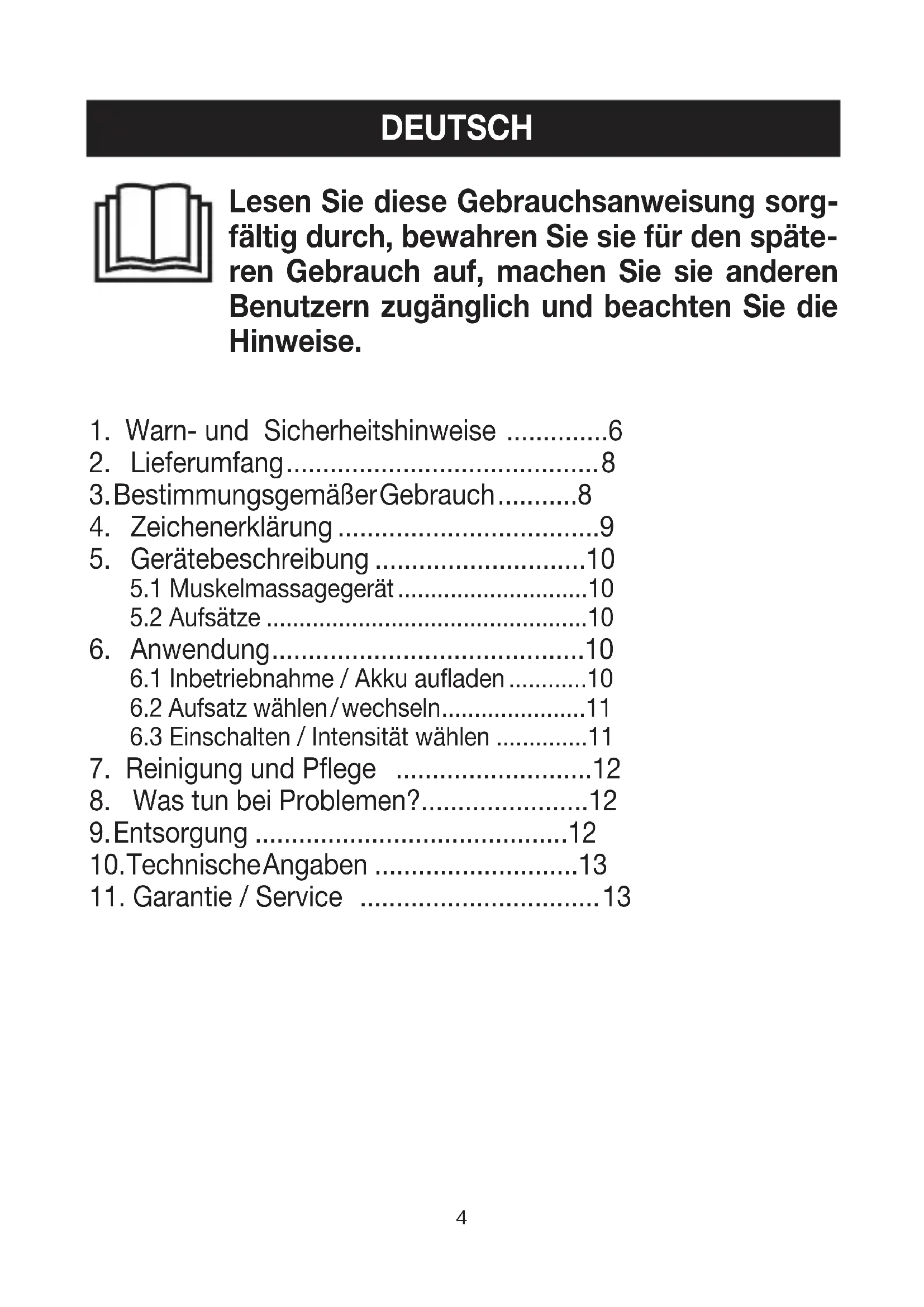SSER GEBRAUCH WARNUNG Verwenden Sie das Muskelmassagegerät ausschließlich mit den im Lieferumfang enthaltenen Aufsätzen. Das Muskelmas