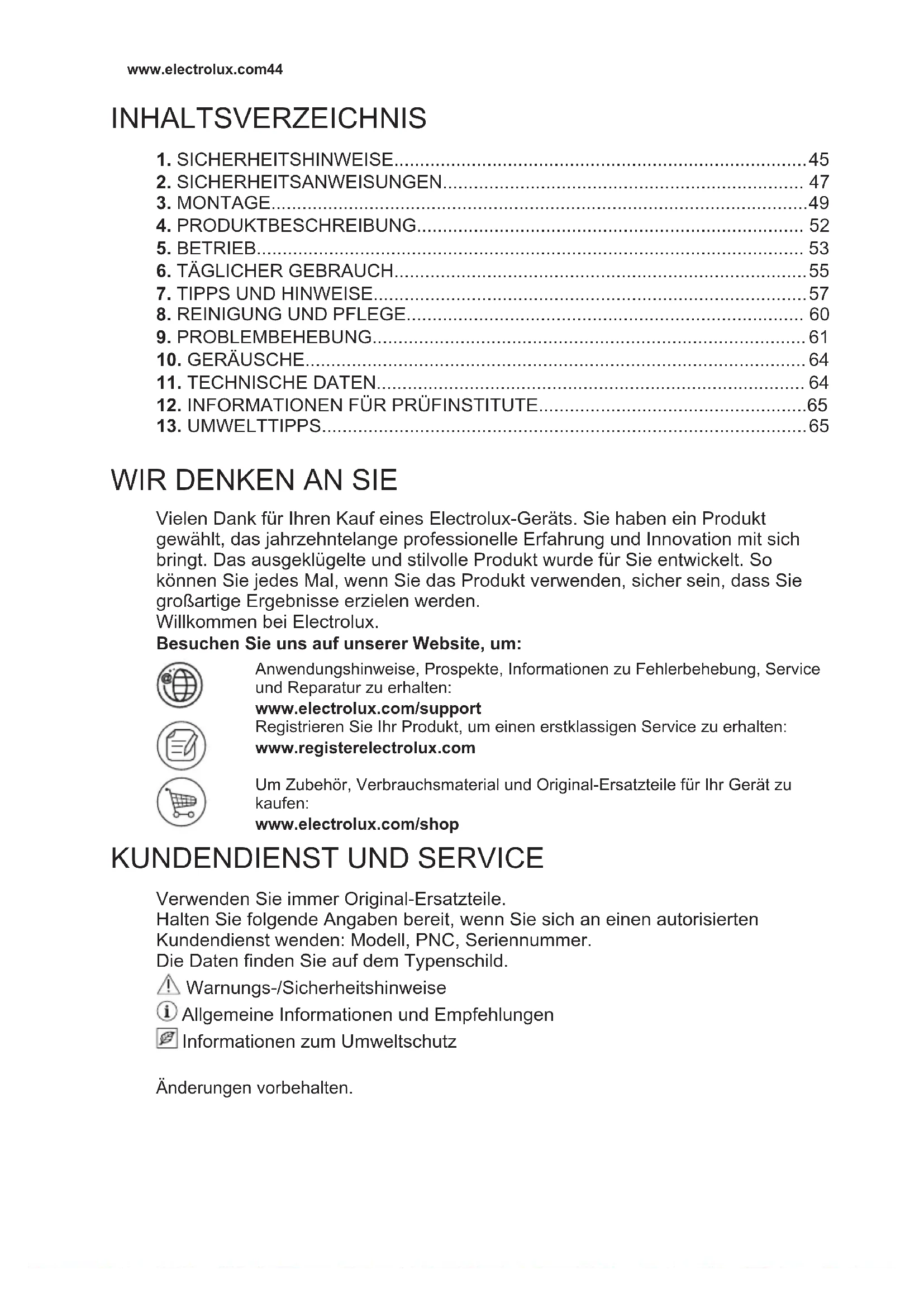 Verwenden Sie immer Original-Ersatzteile. Halten Sie folgende Angaben bereit, wenn Sie sich an einen autorisierten Kundendienst wenden: Modell, PNC, Seriennummer. Die Daten finden Sie auf dem Typenschild. Warnungs-/Sicherheitshinweise Allgemeine Informationen und Empfehlungen Informationen zum Umweltschutz Änderungen vorbehalten. www.electrolux.com441. SICHERHEITSHINWEISE Lesen Sie vor der Montage und dem Gebrauch des Geräts zuerst die Bedienungsanleitung. Bei Verletzungen oder Schäden infolge nicht ordnungsgemäßer Montage oder Verwendung übernimmt der Hersteller keine Haftung. Bewahren Sie die Anleitung zum Nachschlagen an einem sicheren und zugänglichen Ort auf.
