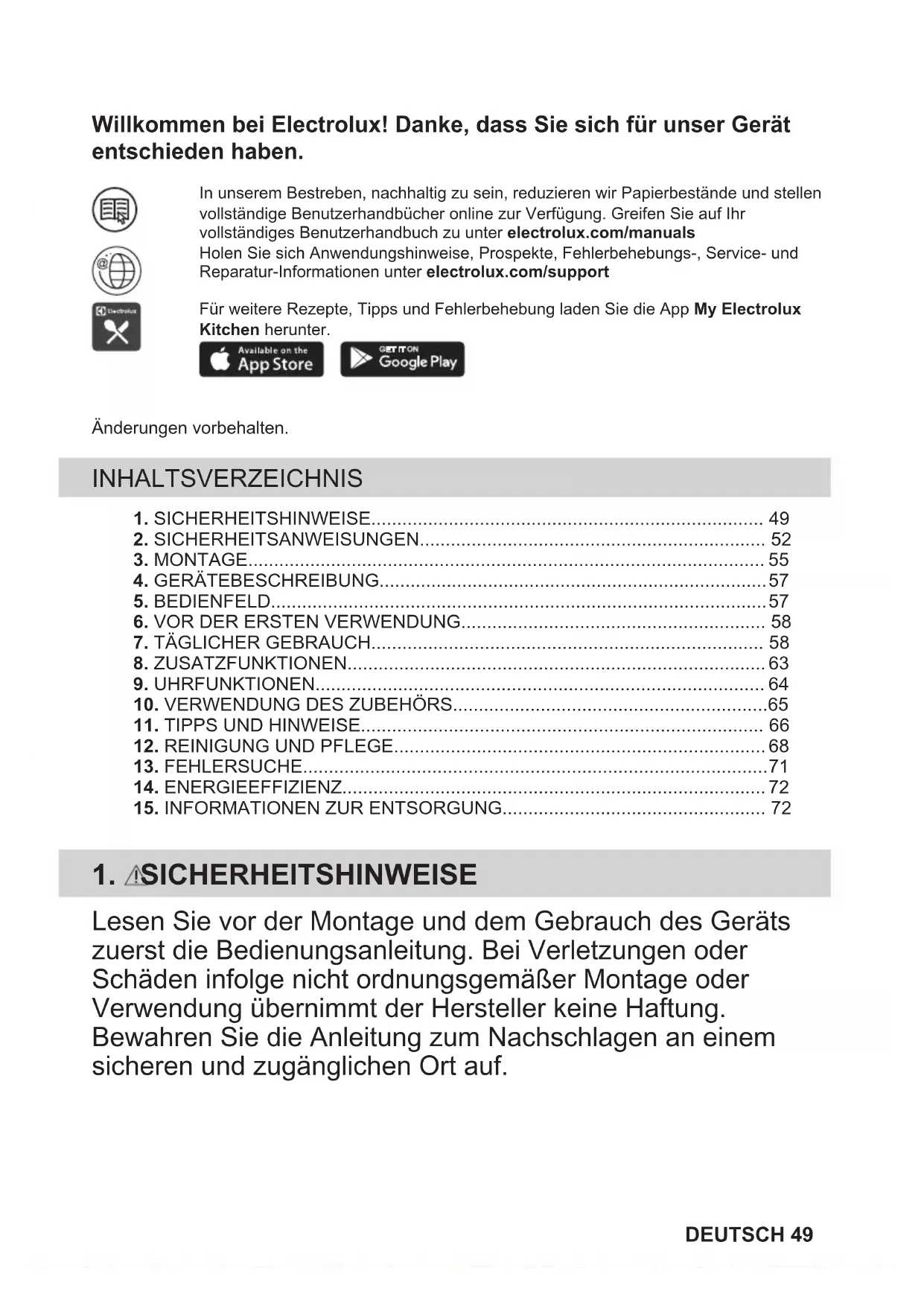 Ihre Pflichten als Endnutzer Dieses Elektro- bzw. Elektronikgerät ist mit einer durchgestrichenen Abfalltonne auf Rädern gekennzeichnet. Das Gerät darf deshalb nur getrennt vom unsortierten Siedlungsabfall gesammelt und zurückgenommen werden, es darf also nicht in den Hausmüll gegeben werden. Das Gerät kann z. B. bei einer kommunalen Sammelstelle oder ggf. bei einem Vertreiber (siehe zu deren Rücknahmepflichten unten) abgegeben werden. Das gilt auch für alle Bauteile, Unterbaugruppen und Verbrauchsmaterialien des zu entsorgenden Altgeräts. Bevor das Altgerät entsorgt werden darf, müssen alle Altbatterien und Altakkumulatoren vom Altgerät getrennt werden, die nicht vom Altgerät umschlossen sind. Das gleiche gilt für Lampen, die zerstörungsfrei aus dem Altgerät entnommen werden können. Der Endnutzer ist zudem selbst dafür verantwortlich, personenbezogene Daten auf dem Altgerät zu löschen. Hinweise zum Recycling 72 DEUTSCHHelfen Sie mit, alle Materialien zu recyceln, die mit diesem Symbol gekennzeichnet sind. Entsorgen Sie solche Materialien, insbesondere Verpackungen, nicht im Hausmüll sondern über die bereitgestellten Recyclingbehälter oder die entsprechenden örtlichen Sammelsysteme. Recyceln Sie zum Umwelt- und Gesundheitsschutz auch elektrische und elektronische Geräte. Rücknahmepflichten der Vertreiber in Deutschland Wer auf mindestens 400 m² Verkaufsfläche Elektro- und Elektronikgeräte vertreibt oder sonst geschäftlich an Endnutzer abgibt, ist verpflichtet, bei Abgabe eines neuen Geräts ein Altgerät des Endnutzers der gleichen Geräteart, das im Wesentlichen die gleichen Funktionen wie das neue Gerät erfüllt, am Ort der Abgabe oder in unmittelbarer Nähe hierzu unentgeltlich zurückzunehmen. Das gilt auch für Vertreiber von Lebensmitteln mit einer Gesamtverkaufsfläche von mindestens 800 m², die mehrmals im Kalenderjahr oder dauerhaft Elektro- und Elektronikgeräte anbieten und auf dem Markt bereitstellen. Solche Vertreiber müssen zudem auf Verlangen des Endnutzers Altgeräte, die in keiner äußeren Abmessung größer als 25 cm sind (kleine Elektrogeräte), im Einzelhandelsgeschäft oder in unmittelbarer Nähe hierzu unentgeltlich zurückzunehmen; die Rücknahme darf in diesem Fall nicht an den Kauf eines Elektro- oder Elektronikgerätes geknüpft, kann aber auf drei Altgeräte pro Geräteart beschränkt werden. Ort der Abgabe ist auch der private Haushalt, wenn das neue Elektro- oder Elektronikgerät dorthin geliefert wird; in diesem Fall ist die Abholung des Altgerätes für den Endnutzer kostenlos. Die vorstehenden Pflichten gelten auch für den Vertrieb unter Verwendung von Fernkommunikationsmitteln, wenn die Vertreiber Lager- und Versandflächen für Elektro- und Elektronikgeräte bzw. Gesamtlager- und -versandflächen für Lebensmittel vorhalten, die den oben genannten Verkaufsflächen entsprechen. Die unentgeltliche Abholung von Elektro- und Elektronikgeräten ist dann aber auf Wärmeüberträger (z. B. Kühlschrank), Bildschirme, Monitore und Geräte, die Bildschirme mit einer Oberfläche von mehr als 100 cm² enthalten, und Geräte beschränkt, bei denen mindestens eine der äußeren Abmessungen mehr als 50 cm beträgt. Für alle übrigen Elektro- und Elektronikgeräte muss der Vertreiber geeignete Rückgabemöglichkeiten in zumutbarer Entfernung zum jeweiligen Endnutzer gewährleisten; das gilt auch für kleine Elektrogeräte (s.o.), die der Endnutzer zurückgeben will, ohne ein neues Gerät zu kaufen. Rücknahmepflichten von Vertreibern und andere Möglichkeiten der Entsorgung von Elektro- und Elektronikgeräten in der Region Wallonien Vertreiber, die Elektro- und Elektronikgeräte verkaufen, sind verpflichtet, bei der Lieferung von Neugeräten Altgeräte desselben Typs, die im Wesentlichen die gleichen Funktionen wie die Neugeräte erfüllen, kostenlos vom Endverbraucher zurückzunehmen. Dies gilt auch bei der Lieferung von neuen Elektro- und Elektronikgeräten oder beim Fernabsatz. Darüber hinaus ist jeder, der Elektro- und Elektronikgeräte auf einer Verkaufsfläche von mindestens 400 m² verkauft, verpflichtet, Altgeräte, die in keiner äußeren Abmessung größer als 25 cm sind (Elektrokleingeräte), im Ladengeschäft oder in unmittelbarer Nähe kostenlos zurückzunehmen; die Rücknahme darf in diesem Fall nicht vom Kauf eines Elektro- oder Elektronikgerätes abhängig gemacht werden. Die Rücknahme von Elektro- und Elektronikgeräten kann auch auf Containerplätzen oder zugelassenen Recyclinghöfen erfolgen. Für weitere Informationen wenden Sie sich bitte an Ihre Gemeindeverwaltung. DEUTSCH 73Ti diamo il benvenuto in Electrolux! Grazie per aver scelto di acquistare questo prodotto. Nel nostro intento di essere sostenibili stiamo riducendo le risorse cartacee eforniamo manuali d'uso completi online. È possibile accedere al manuale d'usocompleto all'indirizzo electrolux.com/manualsRicevere consigli per l’uso, scaricare i nostri opuscoli, eliminare eventuali anomalie,ottenere informazioni sull'assistenza e la riparazione su: electrolux.com/supportPer ulteriori ricette, suggerimenti, indicazioni per la risoluzione dei problemi scaricarel’app My Electrolux Kitchen.Con riserva di modifiche. INDICE