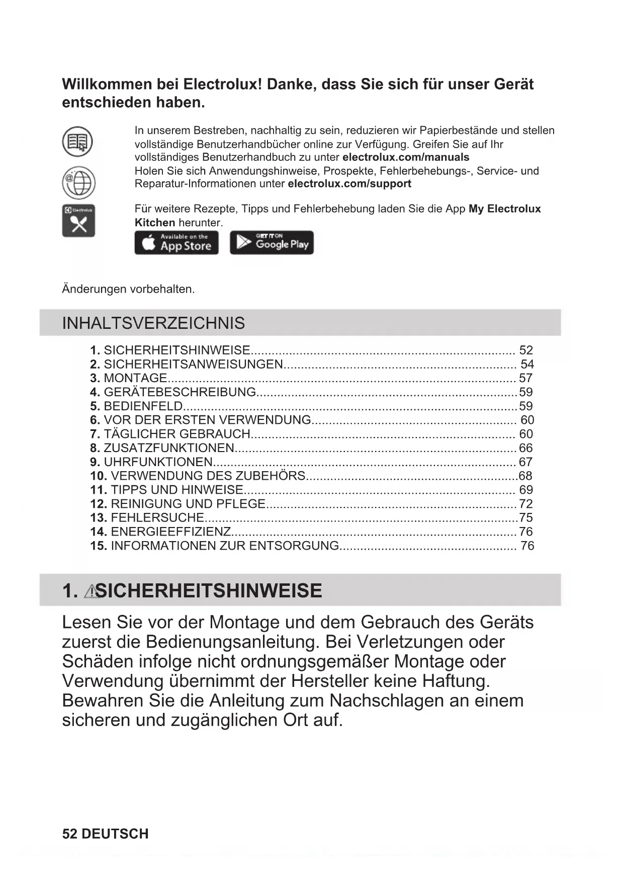 Recyclez les matériaux portant le symbole . Déposez les emballages dans les conteneurs prévus à cet effet. Contribuez à la protection de l'environnement et à votre sécurité, recyclez vos produits électriques et électroniques. Ne jetez pas les appareils portant le symbole avec les ordures ménagères. Emmenez un tel produit dans votre centre local de recyclage ou contactez vos services municipaux. FRANÇAIS 51Willkommen bei Electrolux! Danke, dass Sie sich für unser Gerät entschieden haben. In unserem Bestreben, nachhaltig zu sein, reduzieren wir Papierbestände und stellenvollständige Benutzerhandbücher online zur Verfügung. Greifen Sie auf Ihrvollständiges Benutzerhandbuch zu unter electrolux.com/manualsHolen Sie sich Anwendungshinweise, Prospekte, Fehlerbehebungs-, Service- undReparatur-Informationen unter electrolux.com/supportFür weitere Rezepte, Tipps und Fehlerbehebung laden Sie die App My ElectroluxKitchen herunter.Änderungen vorbehalten. INHALTSVERZEICHNIS