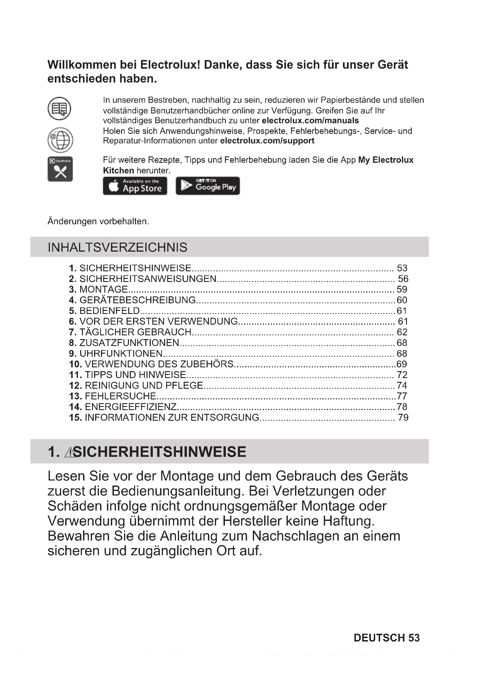 Ihre Pflichten als Endnutzer Dieses Elektro- bzw. Elektronikgerät ist mit einer durchgestrichenen Abfalltonne auf Rädern gekennzeichnet. Das Gerät darf deshalb nur getrennt vom unsortierten Siedlungsabfall gesammelt und zurückgenommen werden, es darf also nicht in den Hausmüll gegeben werden. Das Gerät kann z. B. bei einer kommunalen Sammelstelle oder ggf. bei einem Vertreiber (siehe zu deren Rücknahmepflichten unten) abgegeben werden. Das gilt auch für alle Bauteile, Unterbaugruppen und Verbrauchsmaterialien des zu entsorgenden Altgeräts. Bevor das Altgerät entsorgt werden darf, müssen alle Altbatterien und Altakkumulatoren vom Altgerät getrennt werden, die nicht vom Altgerät umschlossen sind. Das gleiche gilt für Lampen, die zerstörungsfrei aus dem Altgerät entnommen werden können. Der Endnutzer ist zudem selbst dafür verantwortlich, personenbezogene Daten auf dem Altgerät zu löschen. Hinweise zum Recycling Helfen Sie mit, alle Materialien zu recyceln, die mit diesem Symbol gekennzeichnet sind. Entsorgen Sie solche Materialien, insbesondere Verpackungen, nicht im Hausmüll sondern über die bereitgestellten Recyclingbehälter oder die entsprechenden örtlichen Sammelsysteme. Recyceln Sie zum Umwelt- und Gesundheitsschutz auch elektrische und elektronische Geräte. Rücknahmepflichten der Vertreiber in Deutschland Wer auf mindestens 400 m² Verkaufsfläche Elektro- und Elektronikgeräte vertreibt oder sonst geschäftlich an Endnutzer abgibt, ist verpflichtet, bei Abgabe eines neuen Geräts ein Altgerät des Endnutzers der gleichen Geräteart, das im Wesentlichen die gleichen Funktionen wie das neue Gerät erfüllt, am Ort der Abgabe oder in unmittelbarer Nähe hierzu unentgeltlich zurückzunehmen. Das gilt auch für Vertreiber von Lebensmitteln mit einer Gesamtverkaufsfläche von mindestens 800 m², die mehrmals im Kalenderjahr oder dauerhaft Elektro- und Elektronikgeräte anbieten und auf dem Markt bereitstellen. Solche Vertreiber müssen zudem auf Verlangen des Endnutzers Altgeräte, die in keiner äußeren Abmessung größer als 25 cm sind (kleine Elektrogeräte), im Einzelhandelsgeschäft oder in unmittelbarer Nähe hierzu unentgeltlich zurückzunehmen; die Rücknahme darf in diesem Fall nicht an den Kauf eines Elektro- oder Elektronikgerätes geknüpft, kann aber auf drei Altgeräte pro Geräteart beschränkt werden. Ort der Abgabe ist auch der private Haushalt, wenn das neue Elektro- oder Elektronikgerät dorthin geliefert wird; in diesem Fall ist die Abholung des Altgerätes für den Endnutzer kostenlos. Die vorstehenden Pflichten gelten auch für den Vertrieb unter Verwendung von Fernkommunikationsmitteln, wenn die DEUTSCH 79Vertreiber Lager- und Versandflächen für Elektro- und Elektronikgeräte bzw. Gesamtlager- und -versandflächen für Lebensmittel vorhalten, die den oben genannten Verkaufsflächen entsprechen. Die unentgeltliche Abholung von Elektro- und Elektronikgeräten ist dann aber auf Wärmeüberträger (z. B. Kühlschrank), Bildschirme, Monitore und Geräte, die Bildschirme mit einer Oberfläche von mehr als 100 cm² enthalten, und Geräte beschränkt, bei denen mindestens eine der äußeren Abmessungen mehr als 50 cm beträgt. Für alle übrigen Elektro- und Elektronikgeräte muss der Vertreiber geeignete Rückgabemöglichkeiten in zumutbarer Entfernung zum jeweiligen Endnutzer gewährleisten; das gilt auch für kleine Elektrogeräte (s.o.), die der Endnutzer zurückgeben will, ohne ein neues Gerät zu kaufen. Rücknahmepflichten von Vertreibern und andere Möglichkeiten der Entsorgung von Elektro- und Elektronikgeräten in der Region Wallonien Vertreiber, die Elektro- und Elektronikgeräte verkaufen, sind verpflichtet, bei der Lieferung von Neugeräten Altgeräte desselben Typs, die im Wesentlichen die gleichen Funktionen wie die Neugeräte erfüllen, kostenlos vom Endverbraucher zurückzunehmen. Dies gilt auch bei der Lieferung von neuen Elektro- und Elektronikgeräten oder beim Fernabsatz. Darüber hinaus ist jeder, der Elektro- und Elektronikgeräte auf einer Verkaufsfläche von mindestens 400 m² verkauft, verpflichtet, Altgeräte, die in keiner äußeren Abmessung größer als 25 cm sind (Elektrokleingeräte), im Ladengeschäft oder in unmittelbarer Nähe kostenlos zurückzunehmen; die Rücknahme darf in diesem Fall nicht vom Kauf eines Elektro- oder Elektronikgerätes abhängig gemacht werden. Die Rücknahme von Elektro- und Elektronikgeräten kann auch auf Containerplätzen oder zugelassenen Recyclinghöfen erfolgen. Für weitere Informationen wenden Sie sich bitte an Ihre Gemeindeverwaltung. 80 DEUTSCHTi diamo il benvenuto in Electrolux! Grazie per aver scelto di acquistare questo prodotto. Nel nostro intento di essere sostenibili stiamo riducendo le risorse cartacee eforniamo manuali d'uso completi online. È possibile accedere al manuale d'usocompleto all'indirizzo electrolux.com/manualsRicevere consigli per l’uso, scaricare i nostri opuscoli, eliminare eventuali anomalie,ottenere informazioni sull'assistenza e la riparazione su: electrolux.com/supportPer ulteriori ricette, suggerimenti, indicazioni per la risoluzione dei problemi scaricarel’app My Electrolux Kitchen.Con riserva di modifiche. INDICE