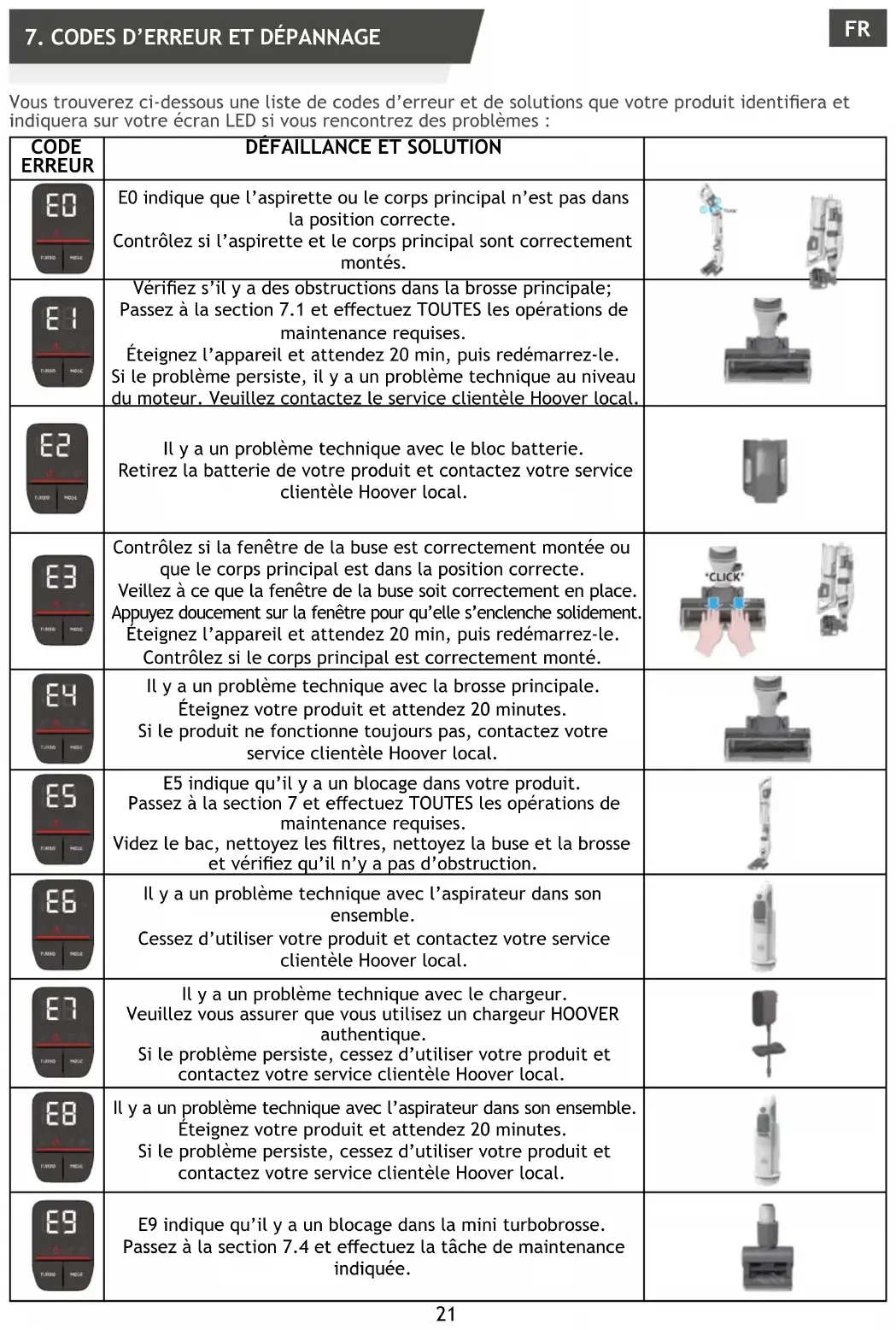 E0 zeigt an, dass das Handgerät oder der Gerätekorpus sich nicht in der korrekten Position benden. Prüfen Sie, ob das Handgerät und der Gerätekorpus korrekt zusammengebaut wurden. Prüfen Sie, ob sich in der Düse eine Verstopfung bendet. Gehen Sie zu Abschnitt 7.1 und führen Sie ALLE Wartungsanweisungen durch. Schalten Sie das Gerät aus, warten Sie 20 Minuten und starten Sie es dann neu. Wenn das Problem weiterhin besteht, liegt ein technisches Problem am Motor vor. Wenden Sie sich bitte an Ihren örtlichen Hoover- Kundendienst. Es gibt ein technisches Problem mit dem Akku. Nehmen Sie den Akku aus dem Gerät und wenden Sie sich an Ihren örtlichen Hoover-Kundendienst. Prüfen Sie, ob das Düsenfenster richtig montiert ist oder ob sich der Gerätekorpus in der korrekten Position bendet. Vergewissern Sie sich, dass das Düsenfenster richtig eingesetzt ist. Drücken Sie das Fenster vorsichtig nach unten, damit es sicher einrastet. Schalten Sie das Gerät aus, warten Sie 20 Minuten und starten Sie es dann neu. Prüfen Sie, ob der Gerätekorpus korrekt zusammengebaut wurde. Es liegt ein technisches Problem an der Hauptdüse vor. Schalten Sie das Gerät aus und warten Sie 20 Minuten. Wenn das Gerät immer noch nicht funktioniert, wenden Sie sich an Ihren örtlichen Hoover-Kundendienst. E5 bedeutet, dass eine Verstopfung an Ihrem Gerät vorliegt. Gehen Sie zu Abschnitt 7 und führen Sie ALLE Wartungsanweisungen durch. Leeren Sie den Staubbehälter, reinigen Sie die Filter, die Düse und die Bürstenwalze und überprüfen Sie, ob Verstopfungen vorliegen. Es liegt ein technisches Problem am Hauptstaubsauger vor. Verwenden Sie Ihr Gerät nicht mehr und wenden Sie sich an Ihren örtlichen Hoover-Kundendienst. Es liegt ein technisches Problem am Ladegerät vor. Bitte vergewissern Sie sich, dass Sie ein Original HOOVER-Ladegerät verwenden. Wenn das Problem weiterhin besteht, verwenden Sie Ihr Gerät nicht mehr und wenden Sie sich an Ihren örtlichen Hoover-Kundendienst. Es liegt ein technisches Problem am Hauptstaubsauger vor. Schalten Sie das Gerät aus und warten Sie 20 Minuten. Wenn das Problem weiterhin besteht, verwenden Sie Ihr Gerät nicht mehr und wenden Sie sich an Ihren örtlichen Hoover-Kundendienst. E9 bedeutet, dass die Mini-Turbodüse verstopft ist. Gehen Sie zu Abschnitt 7.4 und führen Sie die angegebene Wartung durch. DEA