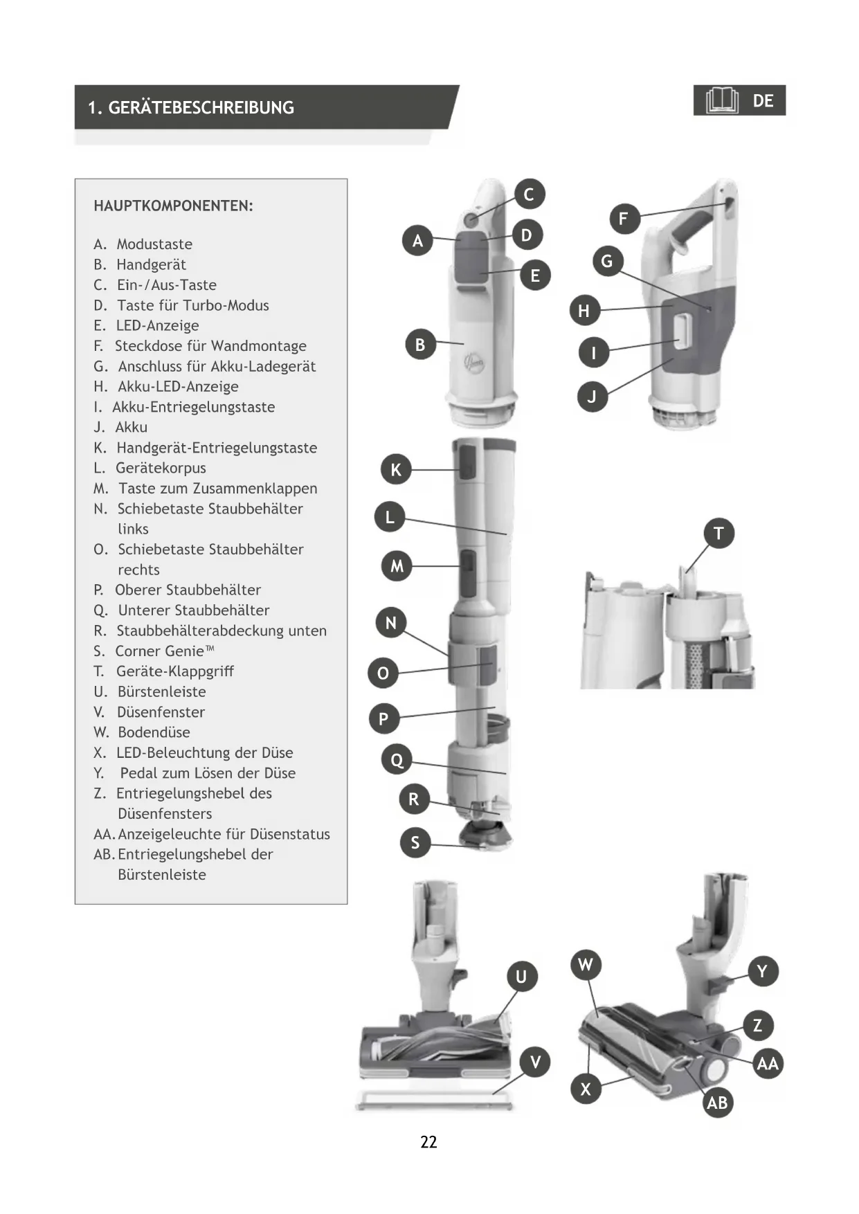AC. Entriegelungstaste für Mini-Staubbehälter AD. Mini-Staubbehälter AE. Entriegelungstaste der Klappe des Mini-Staubbehälters AF. 2in1-Filter AG. Ladegerät AH. Wandbefestigungsschrauben und -halterung AI. Mini-Turbodüse AJ. Lange, exible Fugendüse AK. 2in1-Staubpinsel/Möbelwerkzeug AL. Wandhalterung