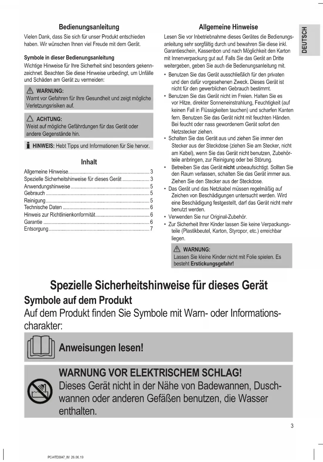 - PC-HTD3047_IM 26.06.19 Bedienungsanleitung Vielen Dank, dass Sie sich für unser Produkt entschieden haben. Wir wünschen Ihnen viel Freude mit dem Gerät. Symbole in dieser Bedienungsanleitung Wichtige Hinweise für Ihre Sicherheit sind besonders gekenn- zeichnet. Beachten Sie diese Hinweise unbedingt, um Unfälle und Schäden am Gerät zu vermeiden: WARNUNG: Warnt vor Gefahren für Ihre Gesundheit und zeigt mögliche Verletzungsrisiken auf. ACHTUNG: Weist auf mögliche Gefährdungen für das Gerät oder andere Gegenstände hin. HINWEIS: Hebt Tipps und Informationen für Sie hervor. Inhalt Allgemeine Hinweise p. 3