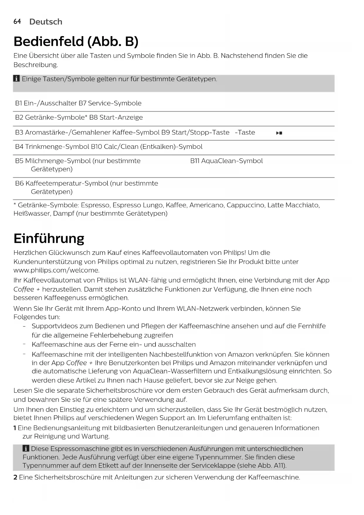 Kaffeemaschine mit der intelligenten Nachbestellfunktion von Amazon verknüpfen. Sie können in der App Coffee + Ihre Benutzerkonten bei Philips und Amazon miteinander verknüpfen und die automatische Lieferung von AquaClean-Wasserfiltern und Entkalkungslösung einrichten. So werden diese Artikel zu Ihnen nach Hause geliefert, bevor sie zur Neige gehen. Lesen Sie die separate Sicherheitsbroschüre vor dem ersten Gebrauch des Gerät aufmerksam durch, und bewahren Sie sie für eine spätere Verwendung auf. Um Ihnen den Einstieg zu erleichtern und um sicherzustellen, dass Sie Ihr Gerät bestmöglich nutzen, bietet Ihnen Philips auf verschiedenen Wegen Support an. Im Lieferumfang enthalten ist: 1 Eine Bedienungsanleitung mit bildbasierten Benutzeranleitungen und genaueren Informationen zur Reinigung und Wartung. Diese Espressomaschine gibt es in verschiedenen Ausführungen mit unterschiedlichen Funktionen. Jede Ausführung verfügt über eine eigene Typennummer. Sie finden diese Typennummer auf dem Etikett auf der Innenseite der Serviceklappe (siehe Abb. A11). 2 Eine Sicherheitsbroschüre mit Anleitungen zur sicheren Verwendung der Kaffeemaschine.65 Deutsch Deutsch 3 Verwenden Sie für Online-Support (Videos usw.) entweder die App Coffee +, scannen Sie den QR- Code auf dem Cover dieser Anleitung oder besuchen Sie die Seite www.philips.com/coffee-care. Dieses Gerät wurde mit Kaffee getestet. Zwar wurde die Maschine anschließend sorgfältig gereinigt, aber es ist möglich, dass noch ein Rest Kaffee in der Maschine ist. Wir garantieren aber, dass Ihre Maschine absolut neu ist. Um den besten Kaffee zuzubereiten, passt die Kaffeemaschine die Menge des gemahlenen Kaffees, der verwendet wird, automatisch an. Damit die Kaffeemaschine den Selbsteinstellungsprozess abschließen kann, müssen Sie 5Tassen zubereiten. Spülen Sie den LatteGo (Milchbehälter) und den klassischen Milchaufschäumer vor dem ersten Gebrauch. Vor dem ersten Gebrauch