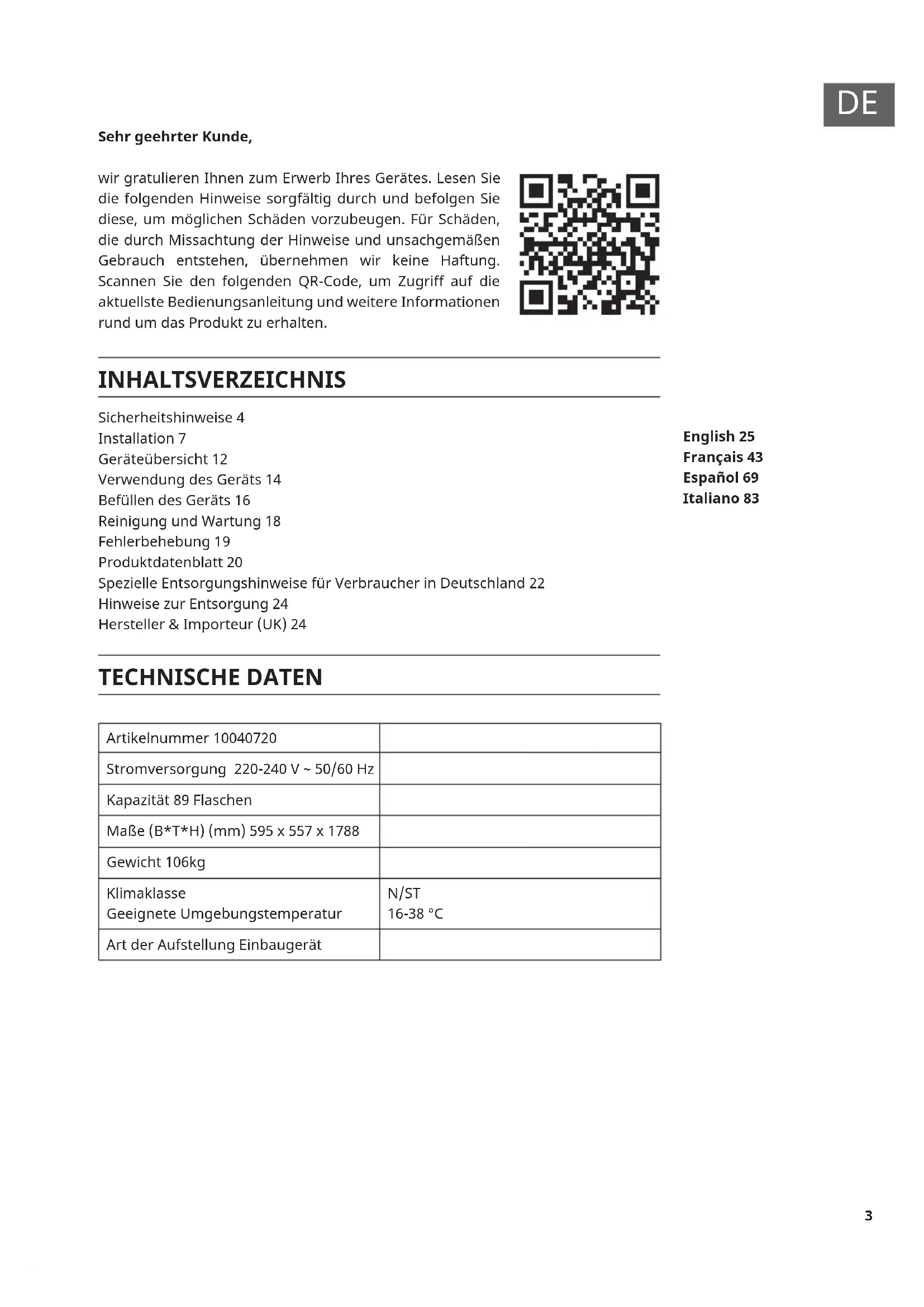 Sehr geehrter Kunde, wir gratulieren Ihnen zum Erwerb Ihres Gerätes. Lesen Sie die folgenden Hinweise sorgfältig durch und befolgen Sie diese, um möglichen Schäden vorzubeugen. Für Schäden, die durch Missachtung der Hinweise und unsachgemäßen Gebrauch entstehen, übernehmen wir keine Haftung. Scannen Sie den folgenden QR-Code, um Zugriff auf die aktuellste Bedienungsanleitung und weitere Informationen rund um das Produkt zu erhalten. INHALTSVERZEICHNIS TECHNISCHE DATEN Artikelnummer 10040720 Stromversorgung 220-240 V ~ 50/60 Hz Kapazität 89 Flaschen Maße (B*T*H) (mm) 595 x 557 x 1788 Gewicht 106kg Klimaklasse Geeignete Umgebungstemperatur N/ST 16-38 °C Art der Aufstellung Einbaugerät English 25 Français 43 Español 69 Italiano 83 Sicherheitshinweise 4 Installation 7 Geräteübersicht 12 Verwendung des Geräts 14 Befüllen des Geräts 16 Reinigung und Wartung 18 Fehlerbehebung 19 Produktdatenblatt 20 Spezielle Entsorgungshinweise für Verbraucher in Deutschland 22 Hinweise zur Entsorgung 24 Hersteller & Importeur (UK) 244