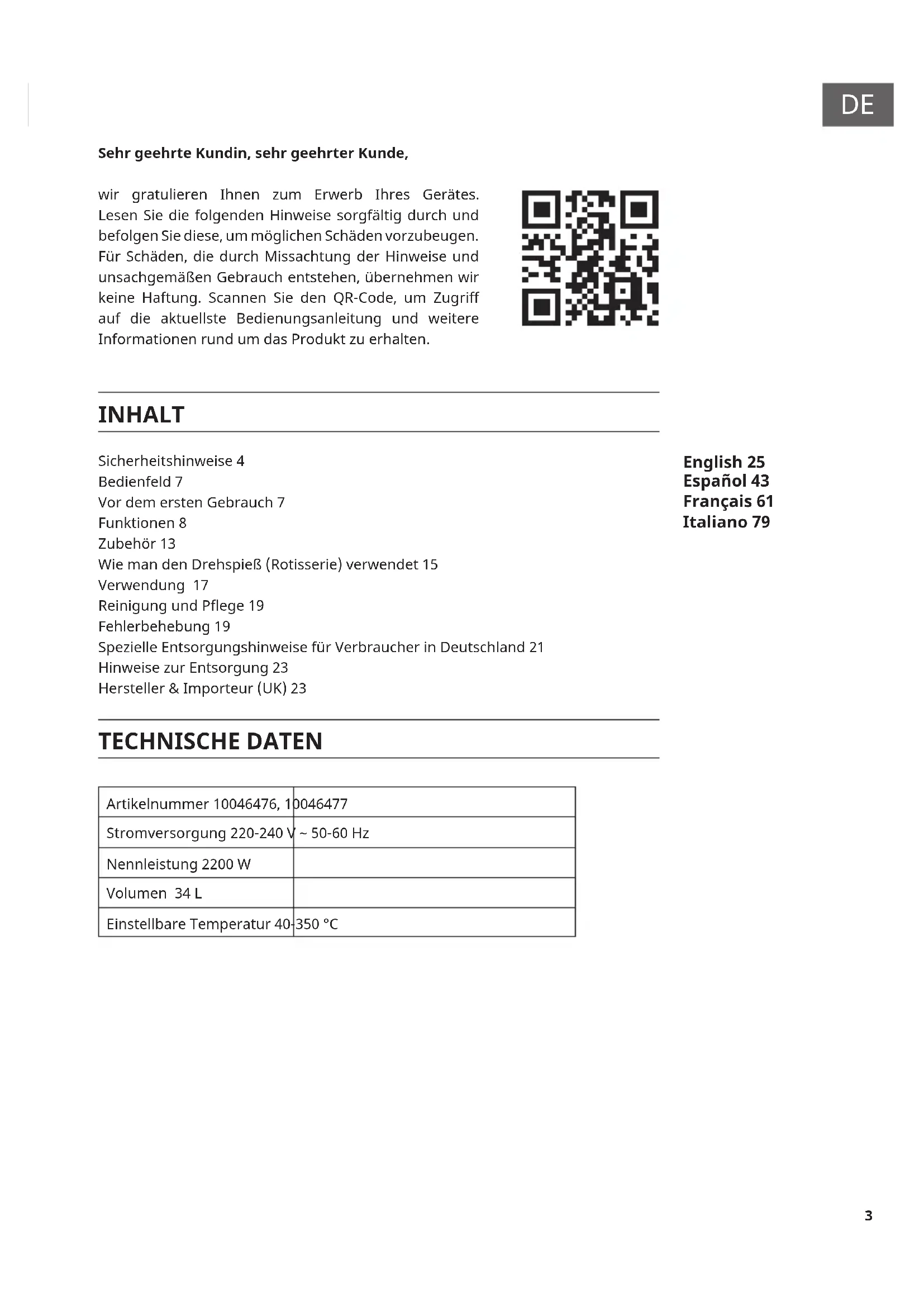 TECHNISCHE DATEN Artikelnummer 10046476, 10046477 Stromversorgung 220-240 V ~ 50-60 Hz Nennleistung 2200 W Volumen 34 L Einstellbare Temperatur 40-350 °C INHALT Sicherheitshinweise 4 Bedienfeld 7 Vor dem ersten Gebrauch 7 Funktionen 8 Zubehör 13 Wie man den Drehspieß (Rotisserie) verwendet 15 Verwendung 17 Reinigung und Pege 19 Fehlerbehebung 19 Spezielle Entsorgungshinweise für Verbraucher in Deutschland 21 Hinweise zur Entsorgung 23 Hersteller & Importeur (UK) 23 Sehr geehrte Kundin, sehr geehrter Kunde, wir gratulieren Ihnen zum Erwerb Ihres Gerätes. Lesen Sie die folgenden Hinweise sorgfältig durch und befolgen Sie diese, um möglichen Schäden vorzubeugen. Für Schäden, die durch Missachtung der Hinweise und unsachgemäßen Gebrauch entstehen, übernehmen wir keine Haftung. Scannen Sie den QR-Code, um Zugriff auf die aktuellste Bedienungsanleitung und weitere Informationen rund um das Produkt zu erhalten. English 25 Español 43 Français 61 Italiano 794