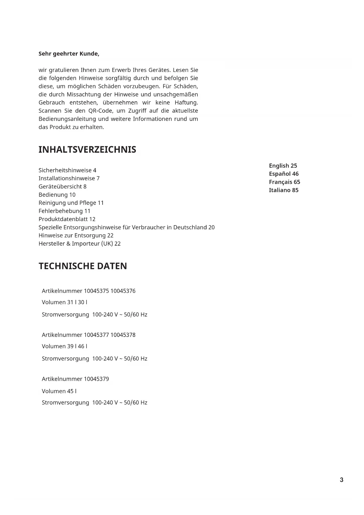 Sehr geehrter Kunde, wir gratulieren Ihnen zum Erwerb Ihres Gerätes. Lesen Sie die folgenden Hinweise sorgfältig durch und befolgen Sie diese, um möglichen Schäden vorzubeugen. Für Schäden, die durch Missachtung der Hinweise und unsachgemäßen Gebrauch entstehen, übernehmen wir keine Haftung. Scannen Sie den QR-Code, um Zugriff auf die aktuellste Bedienungsanleitung und weitere Informationen rund um das Produkt zu erhalten. INHALTSVERZEICHNIS Sicherheitshinweise 4 Installationshinweise 7 Geräteübersicht 8 Bedienung 10 Reinigung und Pege 11 Fehlerbehebung 11 Produktdatenblatt 12 Spezielle Entsorgungshinweise für Verbraucher in Deutschland 20 Hinweise zur Entsorgung 22 Hersteller & Importeur (UK) 22 TECHNISCHE DATEN Artikelnummer 10045375 10045376 Volumen 31 l 30 l Stromversorgung 100-240 V ~ 50/60 Hz Artikelnummer 10045377 10045378 Volumen 39 l 46 l Stromversorgung 100-240 V ~ 50/60 Hz Artikelnummer 10045379 Volumen 45 l Stromversorgung 100-240 V ~ 50/60 Hz English 25 Español 46 Français 65 Italiano 85 Nederlands4