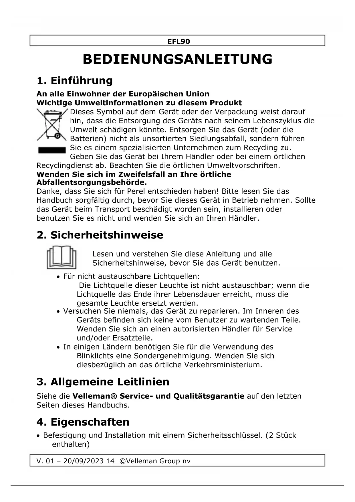 Lampen Gehäusegröße: Durchmesser 175 mm Beleuchtungsquelle: 2PCS 5mm superhelle LED Batterie: 1 Stück oder 2 Stück - 4R25 6V-Batterie (nicht enthalten) Art der Installation: Metallklammern Verwenden Sie dieses Gerät nur mit Originalzubehör. Velleman nv kann nicht für Schäden oder Verletzungen verantwortlich gemacht werden, die durch den (falschen) Gebrauch dieses Geräts entstehen. Weitere Informationen zu diesem Produkt und die neueste Version dieses Handbuchs finden Sie auf unserer Website www.perel.eu. Die Informationen in diesem Handbuch können ohne vorherige Ankündigung geändert werden. © COPYRIGHT-VERMERK Das Urheberrecht an diesem Handbuch liegt bei der Velleman Group nv. Alle weltweiten Rechte vorbehalten. Kein Teil dieses Handbuchs darf ohne die vorherige schriftliche Zustimmung des Urheberrechtsinhabers kopiert, reproduziert, übersetzt oder auf ein elektronisches Medium oder anderweitig reduziert werden.EFL90