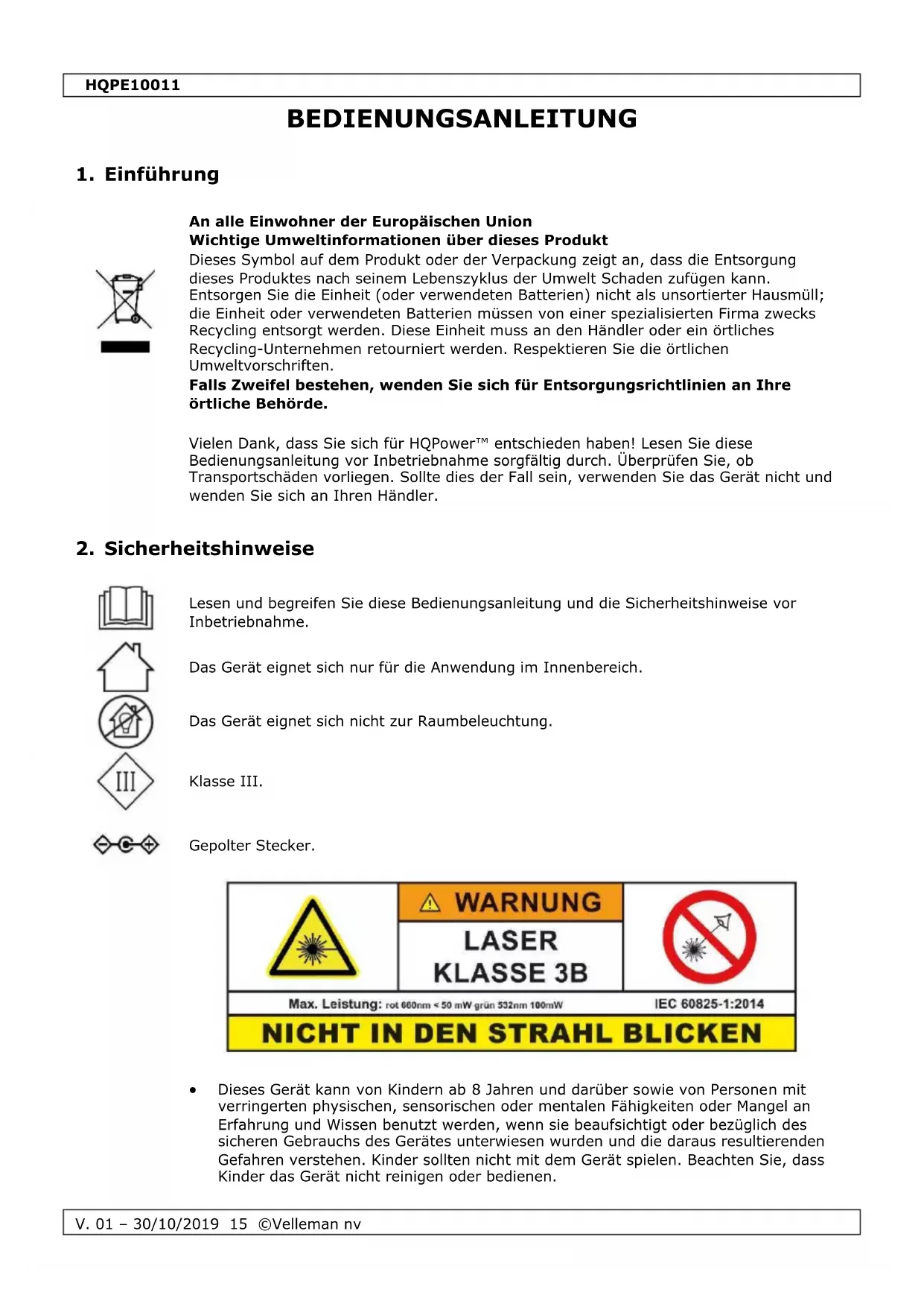 Verwenden Sie dieses Gerät nur mit originellen Zubehörteilen. Velleman NV übernimmt keine Haftung für Schaden oder Verletzungen bei (falscher) Anwendung dieses Gerätes. Für mehr Informationen zu diesem Produkt und die neueste Version dieser Bedienungsanleitung, siehe www.hqpower.eu. Alle Änderungen ohne vorherige Ankündigung vorbehalten.