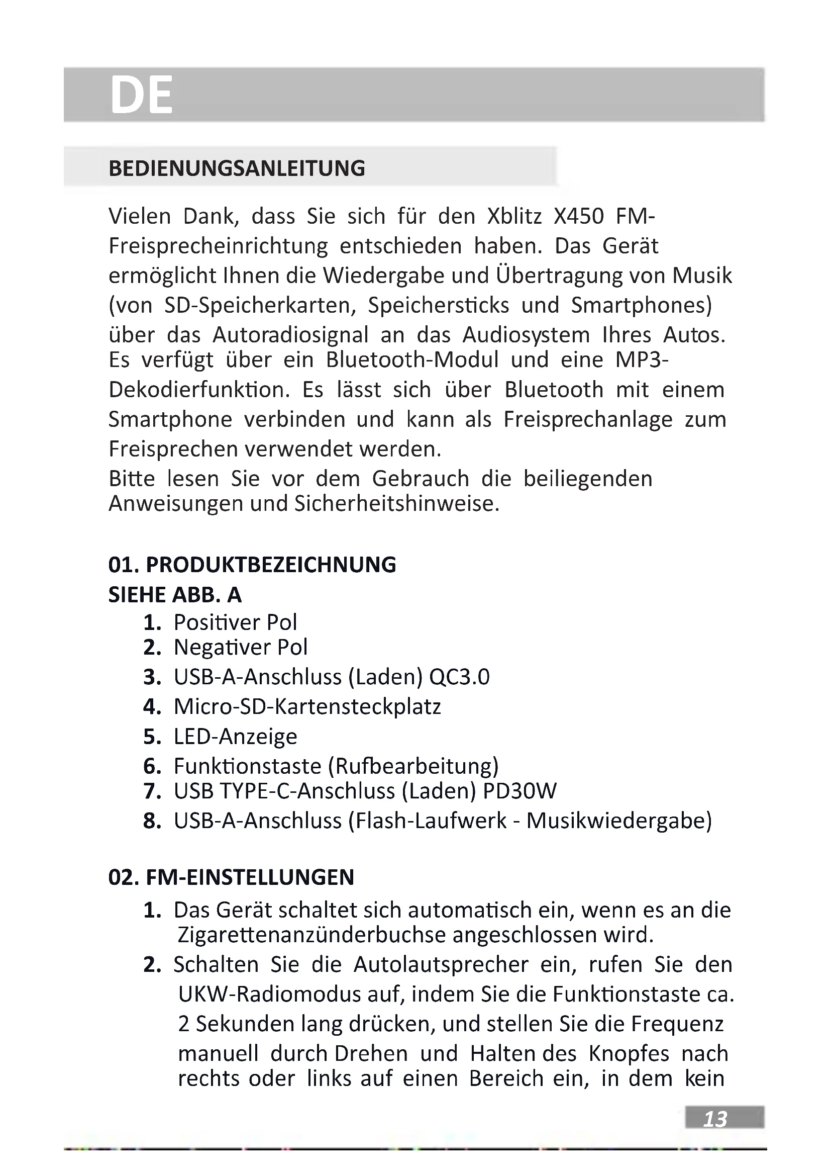 BEDIENUNGSANLEITUNG Vielen Dank, dass Sie sich für den Xblitz X450 FM- Freisprecheinrichtung entschieden haben. Das Gerät ermöglicht Ihnen die Wiedergabe und Übertragung von Musik (von SD-Speicherkarten, Speicherscks und Smartphones) über das Autoradiosignal an das Audiosystem Ihres Autos. Es verfügt über ein Bluetooth-Modul und eine MP3- Dekodierfunkon. Es lässt sich über Bluetooth mit einem Smartphone verbinden und kann als Freisprechanlage zum Freisprechen verwendet werden. Bie lesen Sie vor dem Gebrauch die beiliegenden Anweisungen und Sicherheitshinweise.