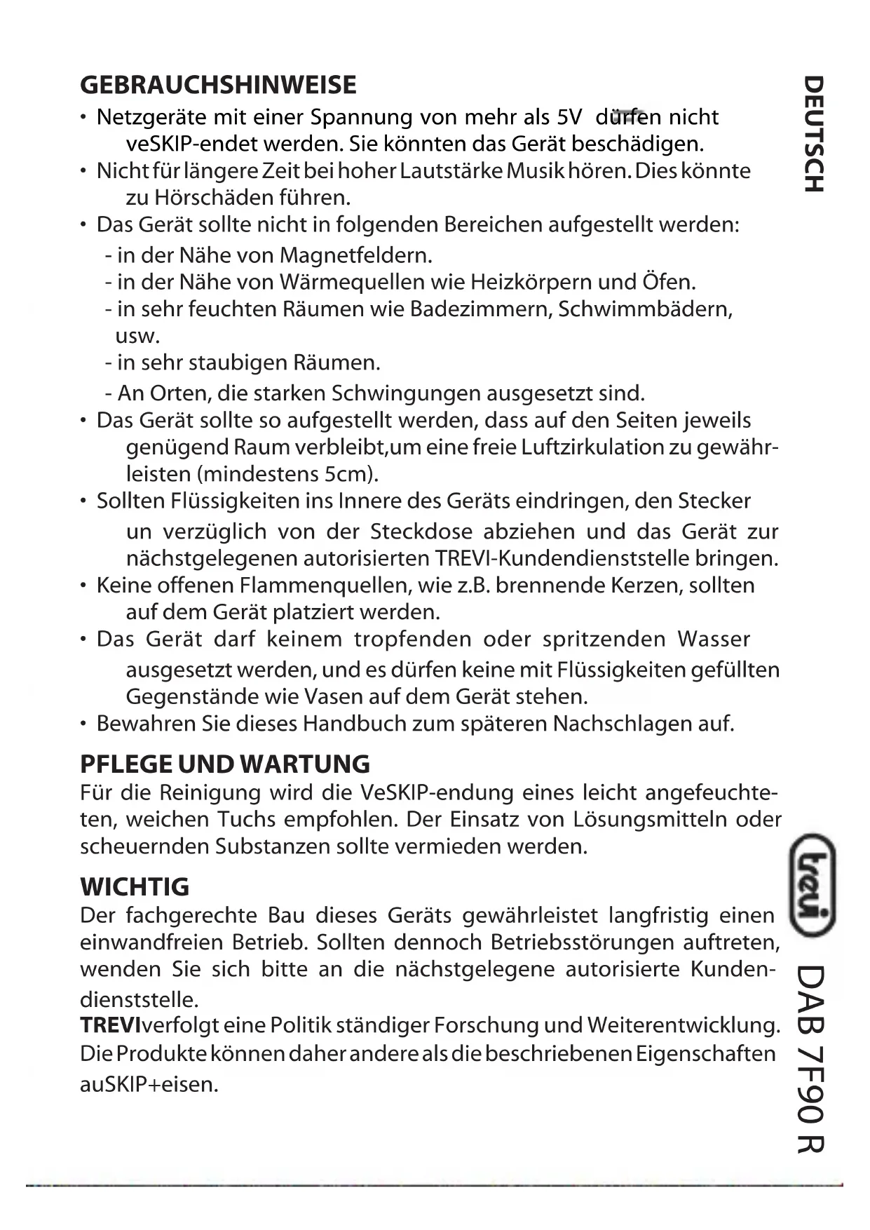 Für die Reinigung wird die VeSKIP-endung eines leicht angefeuchte- ten, weichen Tuchs empfohlen. Der Einsatz von Lösungsmitteln oder scheuernden Substanzen sollte vermieden werden. WICHTIG Der fachgerechte Bau dieses Geräts gewährleistet langfristig einen einwandfreien Betrieb. Sollten dennoch Betriebsstörungen auftreten, wenden Sie sich bitte an die nächstgelegene autorisierte Kunden- dienststelle. TREVIverfolgt eine Politik ständiger Forschung und Weiterentwicklung. Die Produkte können daher andere als die beschriebenen Eigenschaften auSKIP+eisen.