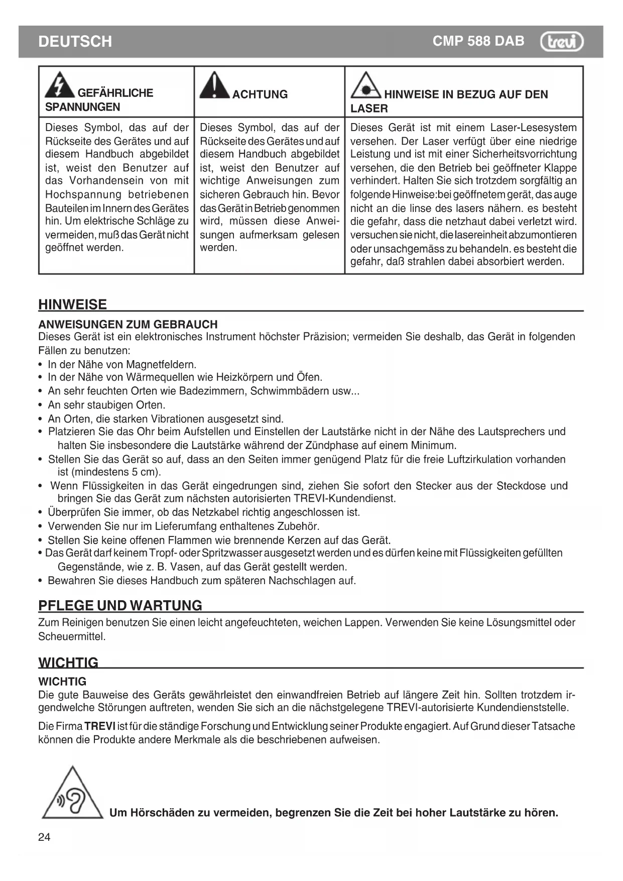 LASER Dieses Symbol, das auf der Rückseite des Gerätes und auf diesem Handbuch abgebildet ist, weist den Benutzer auf das Vorhandensein von mit Hochspannung betriebenen Bauteilen im Innern des Gerätes hin. Um elektrische Schläge zu vermeiden, muß das Gerät nicht geöffnet werden. Dieses Symbol, das auf der Rückseite des Gerätes und auf diesem Handbuch abgebildet ist, weist den Benutzer auf wichtige Anweisungen zum sicheren Gebrauch hin. Bevor das Gerät in Betrieb genommen wird, müssen diese Anwei- sungen aufmerksam gelesen werden. Dieses Gerät ist mit einem Laser-Lesesystem versehen. Der Laser verfügt über eine niedrige Leistung und ist mit einer Sicherheitsvorrichtung versehen, die den Betrieb bei geöffneter Klappe verhindert. Halten Sie sich trotzdem sorgfältig an folgende Hinweise:bei geöffnetem gerät, das auge nicht an die linse des lasers nähern. es besteht die gefahr, dass die netzhaut dabei verletzt wird. versuchen sie nicht, die lasereinheit abzumontieren oder unsachgemäss zu behandeln. es besteht die gefahr, daß strahlen dabei absorbiert werden. DEUTSCH25 CMP 588 DAB
