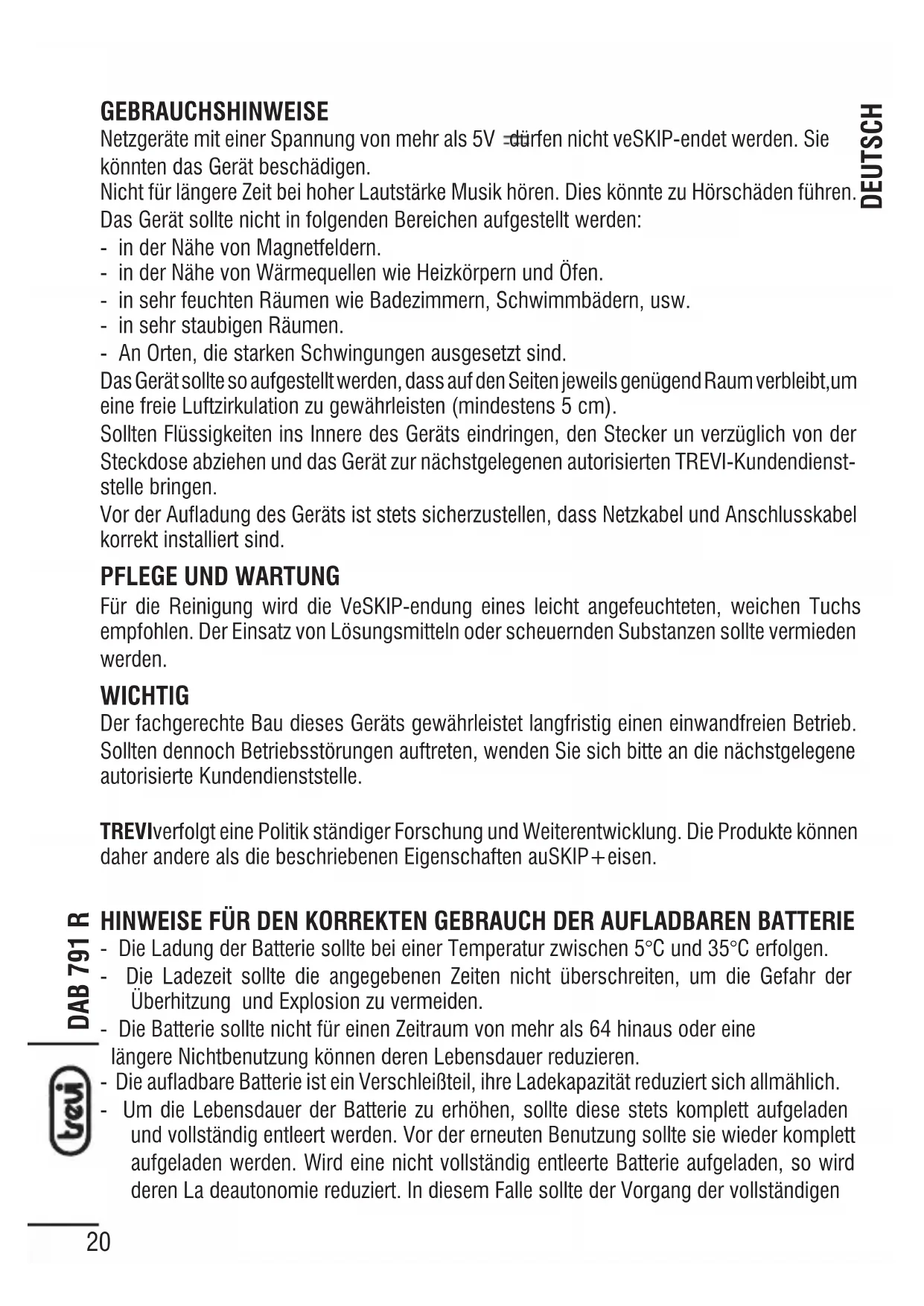 Für die Reinigung wird die VeSKIP-endung eines leicht angefeuchteten, weichen Tuchs empfohlen. Der Einsatz von Lösungsmitteln oder scheuernden Substanzen sollte vermieden werden. WICHTIG Der fachgerechte Bau dieses Geräts gewährleistet langfristig einen einwandfreien Betrieb. Sollten dennoch Betriebsstörungen auftreten, wenden Sie sich bitte an die nächstgelegene autorisierte Kundendienststelle. TREVIverfolgt eine Politik ständiger Forschung und Weiterentwicklung. Die Produkte können daher andere als die beschriebenen Eigenschaften auSKIP+eisen. HINWEISE FÜR DEN KORREKTEN GEBRAUCH DER AUFLADBAREN BATTERIE - Die Ladung der Batterie sollte bei einer Temperatur zwischen 5°C und 35°C erfolgen. - Die Ladezeit sollte die angegebenen Zeiten nicht überschreiten, um die Gefahr der Überhitzung und Explosion zu vermeiden. - Die Batterie sollte nicht für einen Zeitraum von mehr als 64 hinaus oder eine längere Nichtbenutzung können deren Lebensdauer reduzieren. - Die aufladbare Batterie ist ein Verschleißteil, ihre Ladekapazität reduziert sich allmählich. - Um die Lebensdauer der Batterie zu erhöhen, sollte diese stets komplett aufgeladen und vollständig entleert werden. Vor der erneuten Benutzung sollte sie wieder komplett aufgeladen werden. Wird eine nicht vollständig entleerte Batterie aufgeladen, so wird deren La deautonomie reduziert. In diesem Falle sollte der Vorgang der vollständigen DEUTSCHDAB 791 R