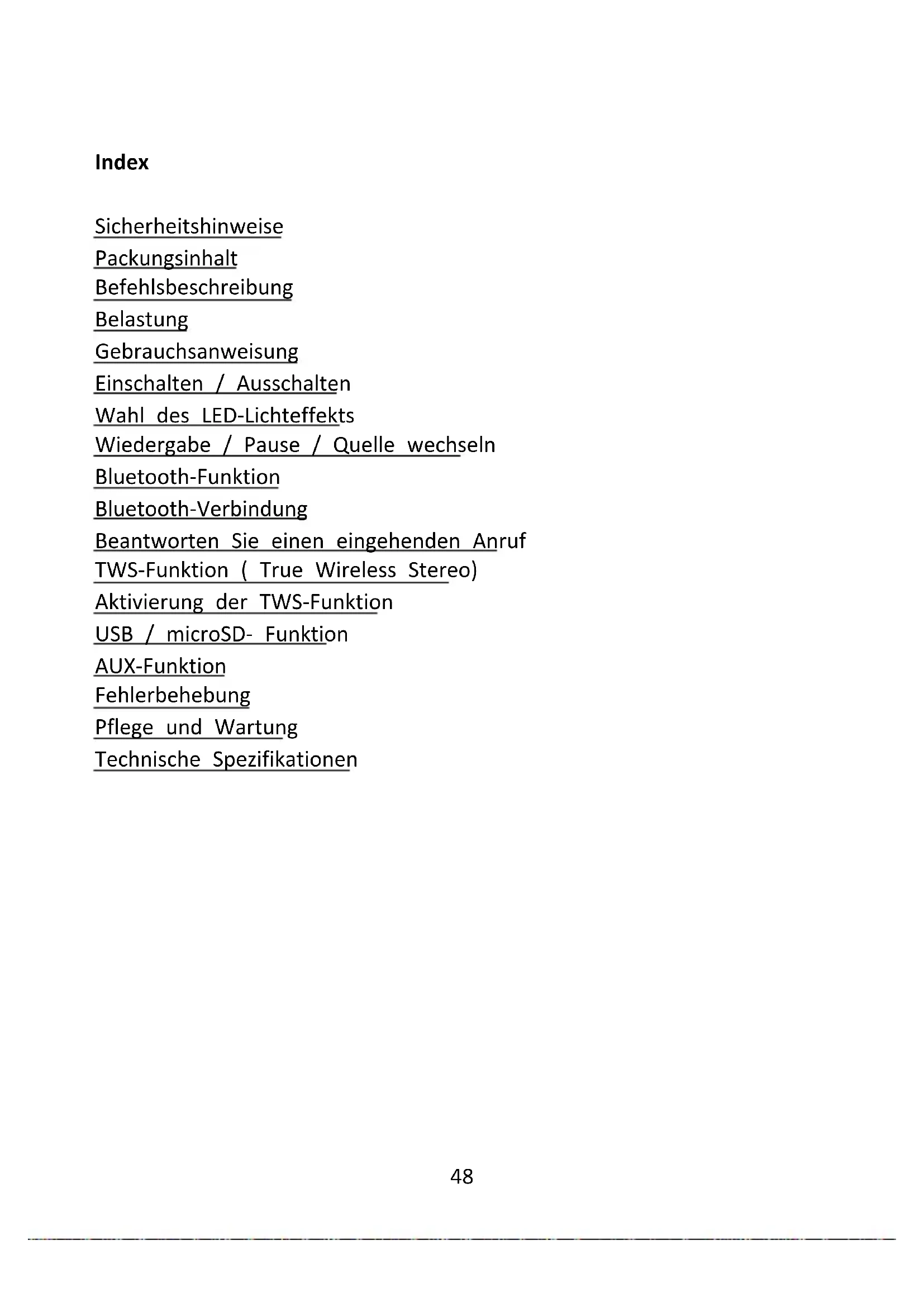 47Index Sicherheitshinweise Packungsinhalt Befehlsbeschreibung Belastung Gebrauchsanweisung Einschalten / Ausschalten Wahl des LED-Lichteffekts Wiedergabe / Pause / Quelle wechseln Bluetooth-Funktion Bluetooth-Verbindung Beantworten Sie einen eingehenden Anruf TWS-Funktion ( True Wireless Stereo) Aktivierung der TWS-Funktion USB / microSD- Funktion AUX-Funktion Fehlerbehebung Pflege und Wartung Technische Spezifikationen