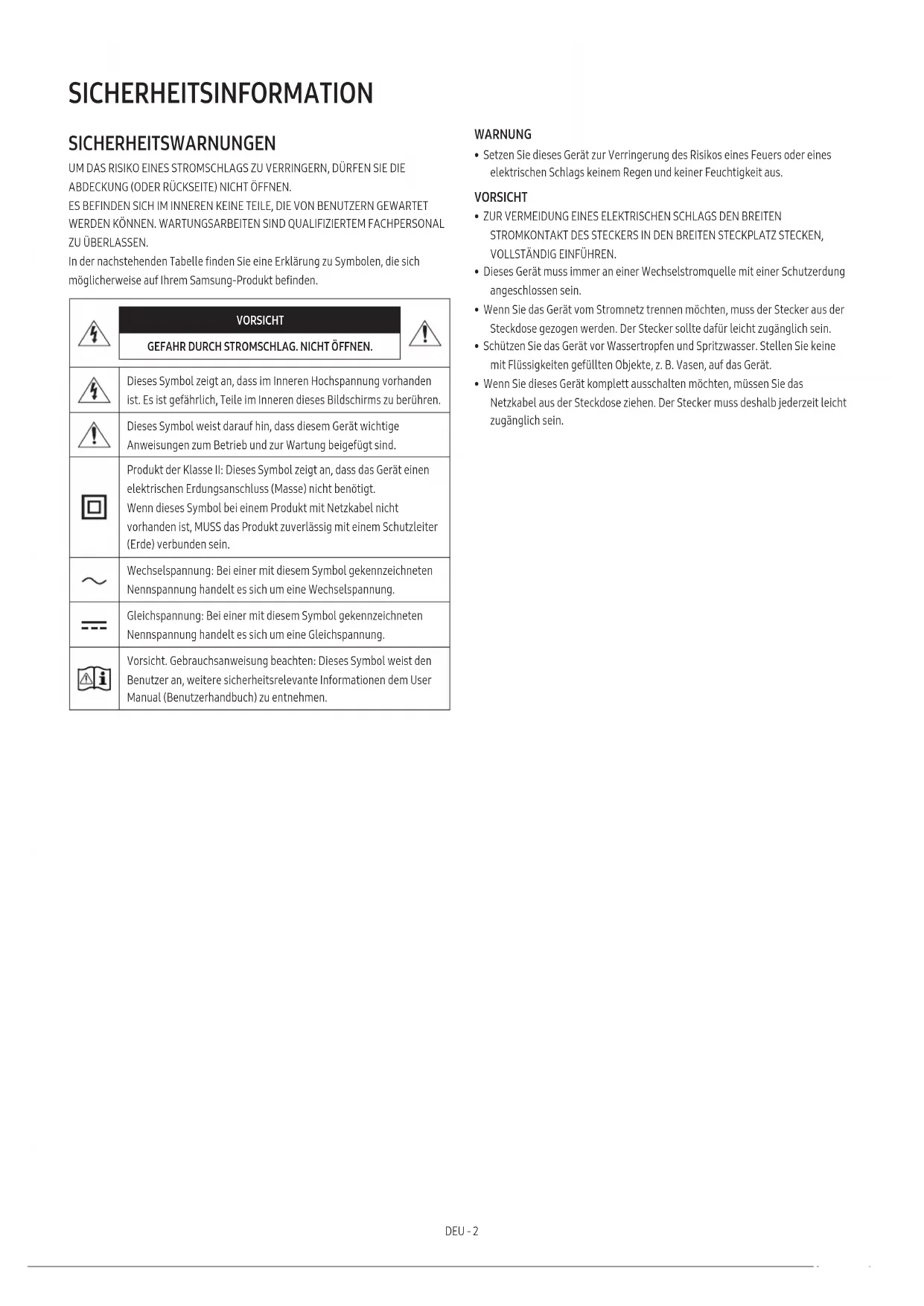 - Wenn Sie dieses Gerät komplett ausschalten möchten, müssen Sie das Netzkabel aus der Steckdose ziehen. Der Stecker muss deshalb jederzeit leicht zugänglich sein.DEU - 3 VORSICHTSMAßNAHMEN