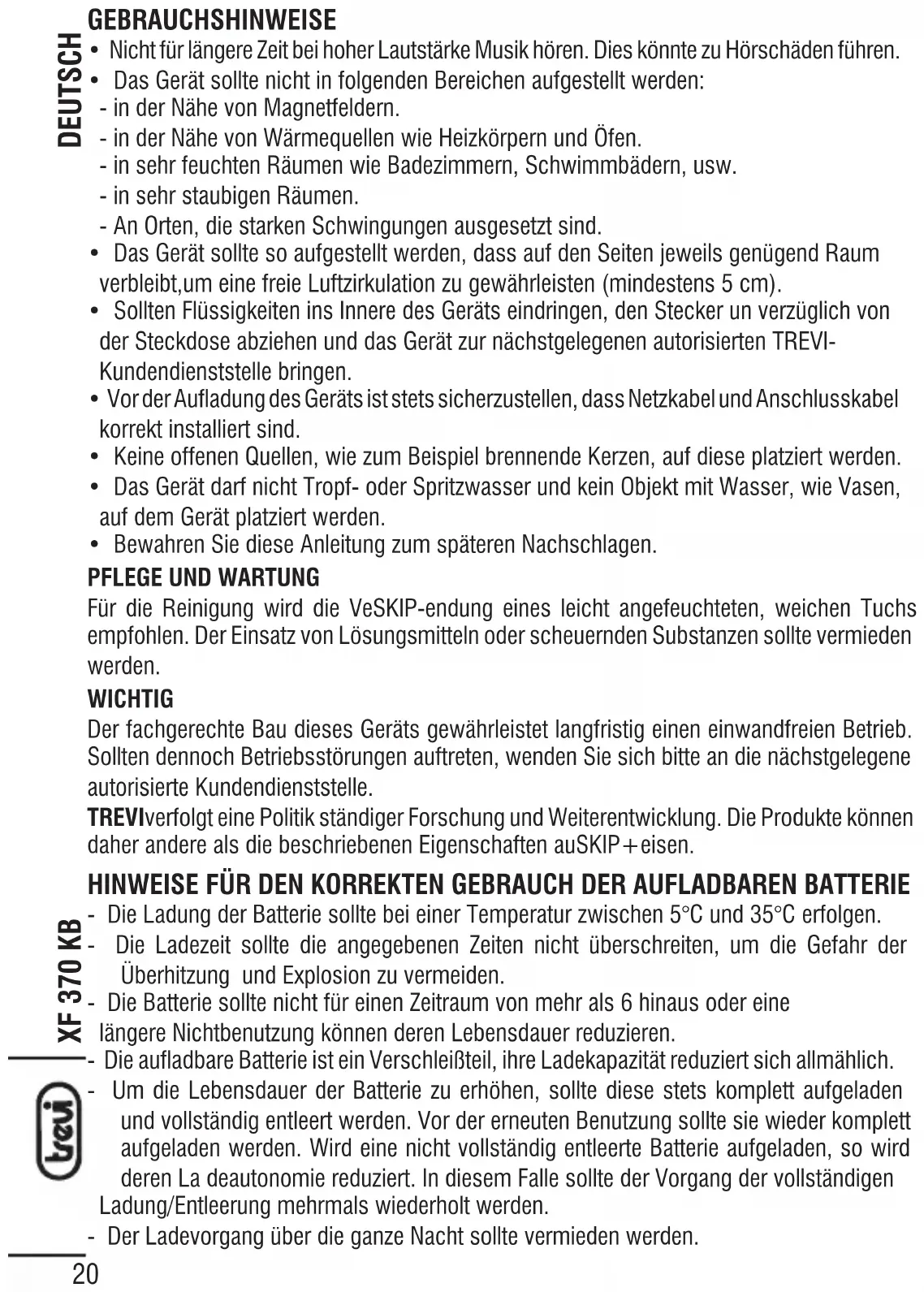 Für die Reinigung wird die VeSKIP-endung eines leicht angefeuchteten, weichen Tuchs empfohlen. Der Einsatz von Lösungsmitteln oder scheuernden Substanzen sollte vermieden werden. WICHTIG Der fachgerechte Bau dieses Geräts gewährleistet langfristig einen einwandfreien Betrieb. Sollten dennoch Betriebsstörungen auftreten, wenden Sie sich bitte an die nächstgelegene autorisierte Kundendienststelle. TREVIverfolgt eine Politik ständiger Forschung und Weiterentwicklung. Die Produkte können daher andere als die beschriebenen Eigenschaften auSKIP+eisen. HINWEISE FÜR DEN KORREKTEN GEBRAUCH DER AUFLADBAREN BATTERIE - Die Ladung der Batterie sollte bei einer Temperatur zwischen 5°C und 35°C erfolgen. - Die Ladezeit sollte die angegebenen Zeiten nicht überschreiten, um die Gefahr der Überhitzung und Explosion zu vermeiden. - Die Batterie sollte nicht für einen Zeitraum von mehr als 6 hinaus oder eine längere Nichtbenutzung können deren Lebensdauer reduzieren. - Die aufladbare Batterie ist ein Verschleißteil, ihre Ladekapazität reduziert sich allmählich. - Um die Lebensdauer der Batterie zu erhöhen, sollte diese stets komplett aufgeladen und vollständig entleert werden. Vor der erneuten Benutzung sollte sie wieder komplett aufgeladen werden. Wird eine nicht vollständig entleerte Batterie aufgeladen, so wird deren La deautonomie reduziert. In diesem Falle sollte der Vorgang der vollständigen Ladung/Entleerung mehrmals wiederholt werden. - Der Ladevorgang über die ganze Nacht sollte vermieden werden. DEUTSCHXF 370 KB