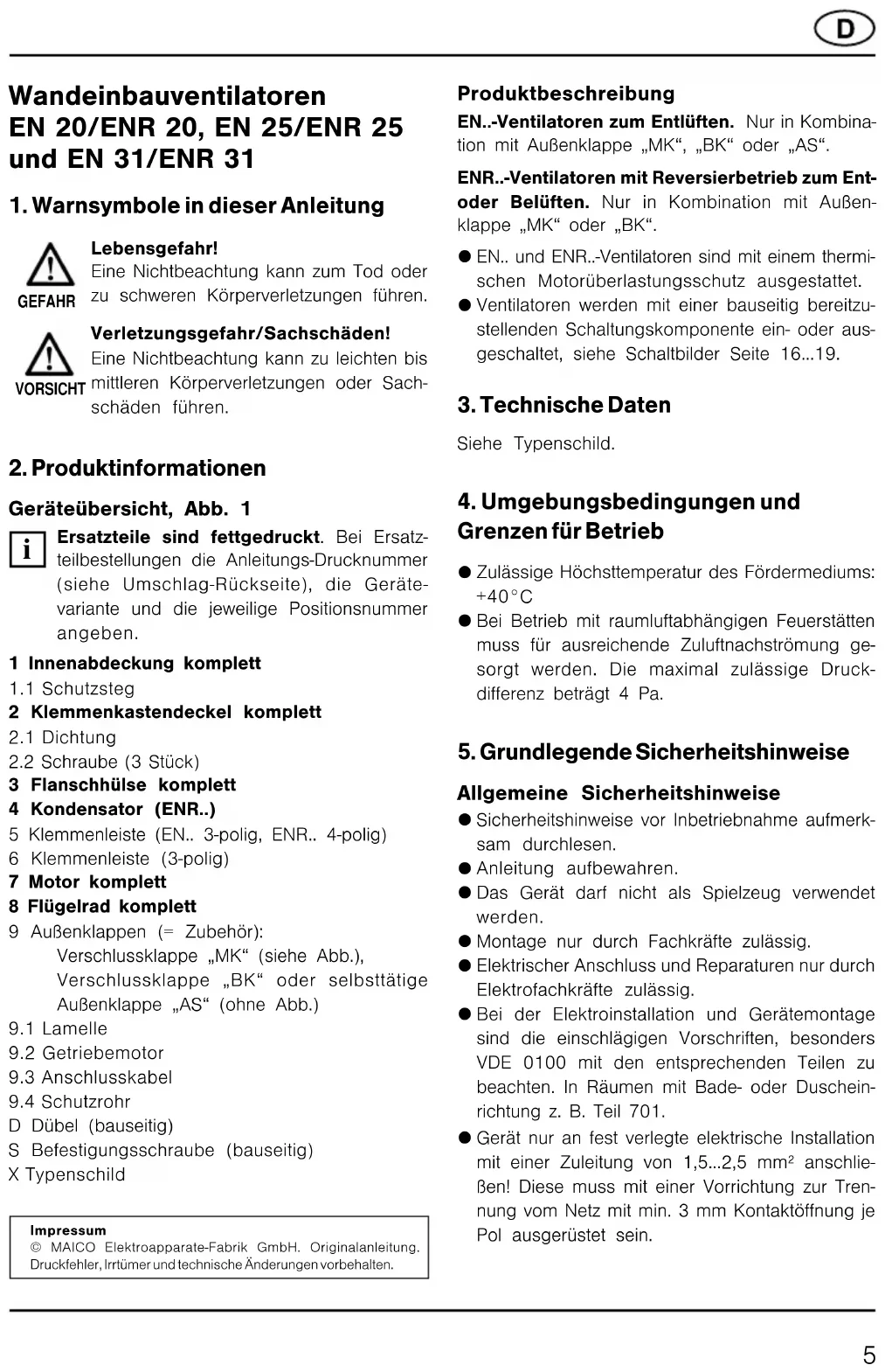 Geräteübersicht, Abb. 1 Ersatzteile sind fettgedruckt. Bei Ersatz-teilbestellungen die Anleitungs-Drucknummer(siehe Umschlag-Rückseite), die Geräte-variante und die jeweilige Positionsnummerangeben.1 Innenabdeckung komplett1.1 Schutzsteg2 Klemmenkastendeckel komplett2.1 Dichtung2.2 Schraube (3 Stück)3 Flanschhülse komplett4 Kondensator (ENR..)5 Klemmenleiste (EN.. 3-polig, ENR.. 4-polig)6 Klemmenleiste (3-polig)7 Motor komplett8 Flügelrad komplett9 Außenklappen (= Zubehör):Verschlussklappe „MK“ (siehe Abb.),Verschlussklappe „BK“ oder selbsttätigeAußenklappe „AS“ (ohne Abb.)9.1 Lamelle9.2 Getriebemotor9.3 Anschlusskabel9.4 SchutzrohrD Dübel (bauseitig)S Befestigungsschraube (bauseitig)X Typenschild VORSICHT GEFAHRImpressum© MAICO Elektroapparate-Fabrik GmbH. Originalanleitung.Druckfehler, Irrtümer und technische Änderungen vorbehalten.