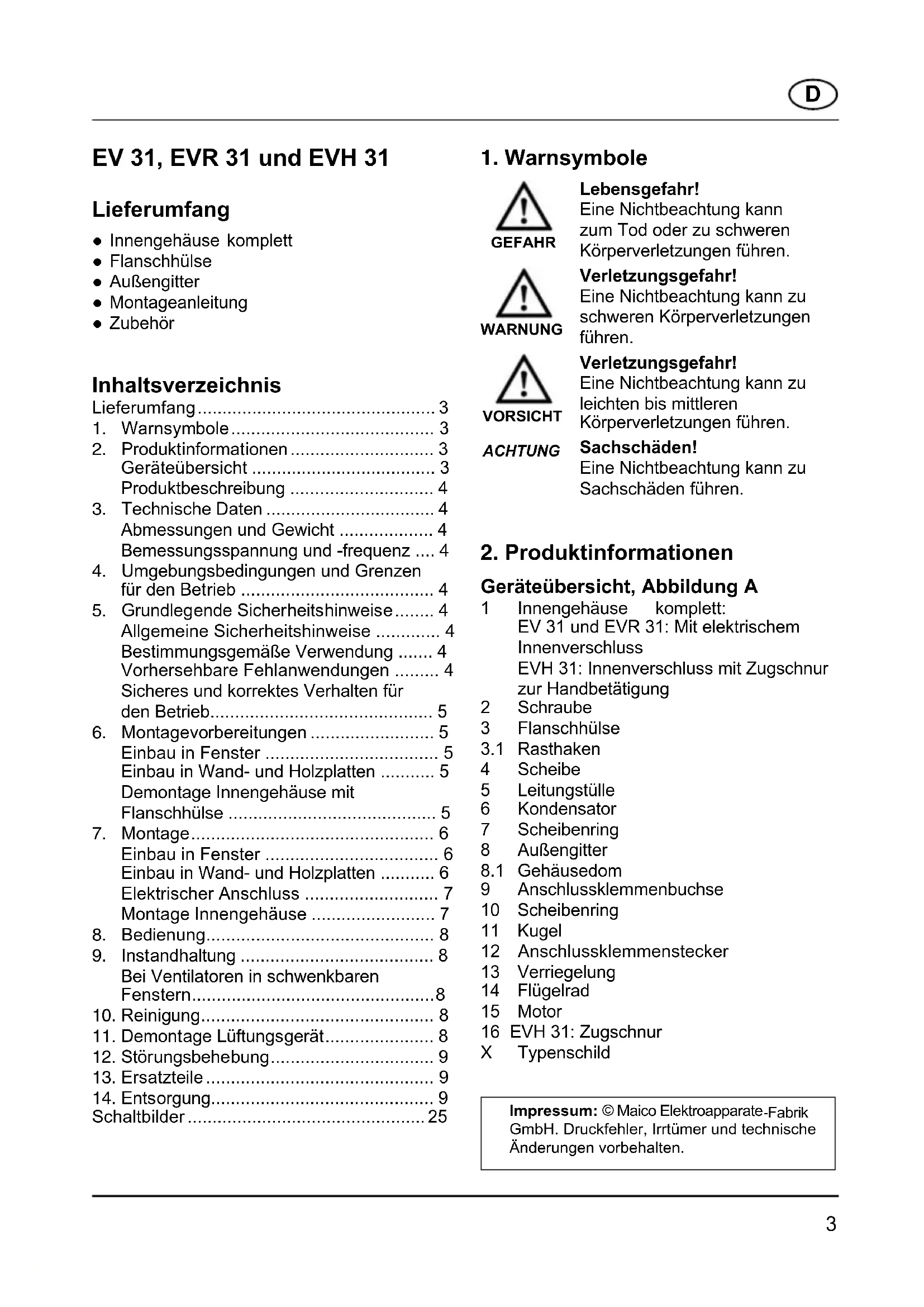 Sicherheitshinweise Allgemeine Sicherheitshinweise ● Sicherheitshinweise vor Inbetriebnahme aufmerksam durchlesen. ● Anleitung aufbewahren. ● Das Gerät darf nicht als Spielzeug verwendet werden. ● Montage nur durch Fachkräfte zulässig. ● Elektrischer Anschluss und Reparaturen nur durch Elektrofachkräfte zulässig. ● Gerät nur an einer fest verlegten elektrischen Installation anschließen! – Zulässiger Leitungsquerschnitt 0,75 mm² bis 1,5 mm². – Bei Geräteeinbau in schwenkbare Fenster geeignete, flexible Anschluss- leitung verwenden. – Vorrichtung zur Trennung vom Netz mit mindestens 3 mm Kontaktöffnung je Pol erforderlich. ● Gerät nur mit auf Typenschild angegebener Spannung und Frequenz betreiben. ● Keine Veränderungen am Gerät vornehmen. ● Gerät nur komplett montiert betreiben. Nie ohne Außengitter. ● Der Betrieb ist nur mit aufgesetztem und verriegeltem Innengehäuse zulässig. Bestimmungsgemäße Verwendung ● EV 31 und EVH 31: Zur Entlüftung von Büros, Geschäfts- und Gewerberäumen, Gaststätten, Produktions- und Arbeits- stätten, Arztpraxen etc. ● EVR 31: Zur Be- oder Entlüftung o. g. Räumlichkeiten. ● Für den senkrechten Einbau in Fenster oder dünne Wände. ● In aufklappbaren Doppelfenstern, Verbund- fenstern und Glasbausteinwänden nur mit passendem Maico-Zubehör ZD oder ZG. Vorhersehbare Fehlanwendungen Maico haftet nicht für Schäden durch bestim- mungswidrigen Gebrauch. Gerät auf keinen Fall einsetzen: ● an schrägen Wänden, Dachschrägen oder Decken.
