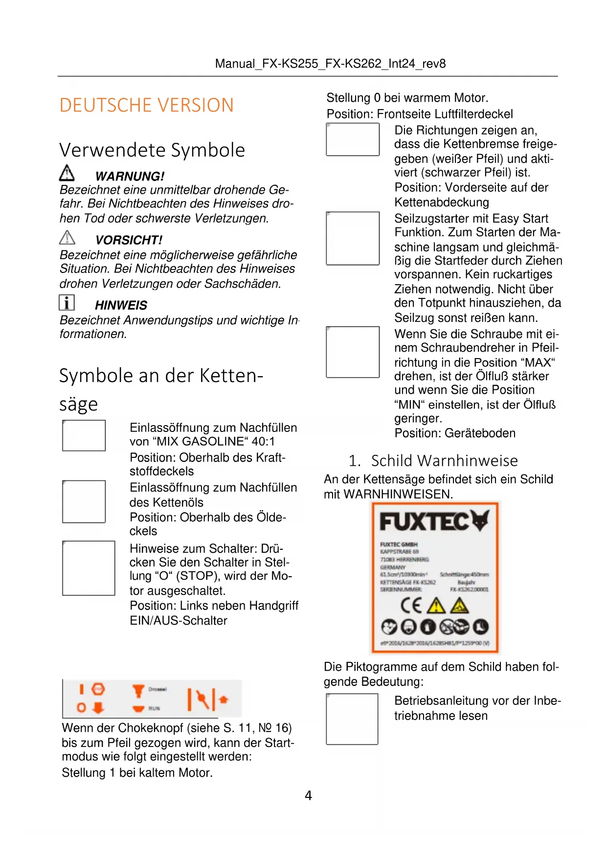 Verwendung Die Kettensäge ist ausschließlich bestimmt: − Zum Schneiden von Ästen, Baumstäm- men, Kanthölzern bis zu einem Durch- messer entsprechend der verwendeten Schneidschienenlänge. − Zur Verwendung entsprechend den in die- ser Bedienungsanleitung gegebenen Be- schreibungen und Sicherheitshinweisen. ◼ Es dürfen nur Werkstoffe aus Holz bear- beitet werden. ◼ Für eine ausreichende Schutzausrüstung während des Gebrauchs ist entsprechend der Bedienungsanleitung zu sorgen. Alle weiteren Anwendungen wie z. B. professi- onelle Baumpflege innerhalb des Baumes werden ausdrücklich ausgeschlossen. ◼ Für aus Fehlanwendung resultierende Schäden oder Verletzungen haftet der Be- nutzer/Bediener und nicht der Hersteller. Es dürfen nur für die Maschine geeignete Sägeketten/Schneidschienen Kombinatio- nen, wie in der Bedienungsanleitung ge- nannt, verwendet werden. ◼ Bestandteil der bestimmungsgemäßen Verwendung ist speziell die Beachtung al- ler Sicherheitshinweise und Betriebshin- weise in der Bedienungsanleitung. Perso- nen, die die Kettensäge bedienen und warten, müssen mit ihr vertraut sein und alle möglichen Gefahren kennen und be- achten. ◼ Darüber hinaus sind die geltenden Unfall- verhütungsvorschriften genauestens ein- zuhalten. ◼ Die allgemeinen arbeitsmedizinischen und sicherheitstechnischen Regeln müssen strikt beachtet werden. Diese Kettensäge ist nur zum Einsatz im offenen Bereich (z. B. Garten, Wald) bestimmt.Manual_FX-KS255_FX-KS262_Int24_rev8
