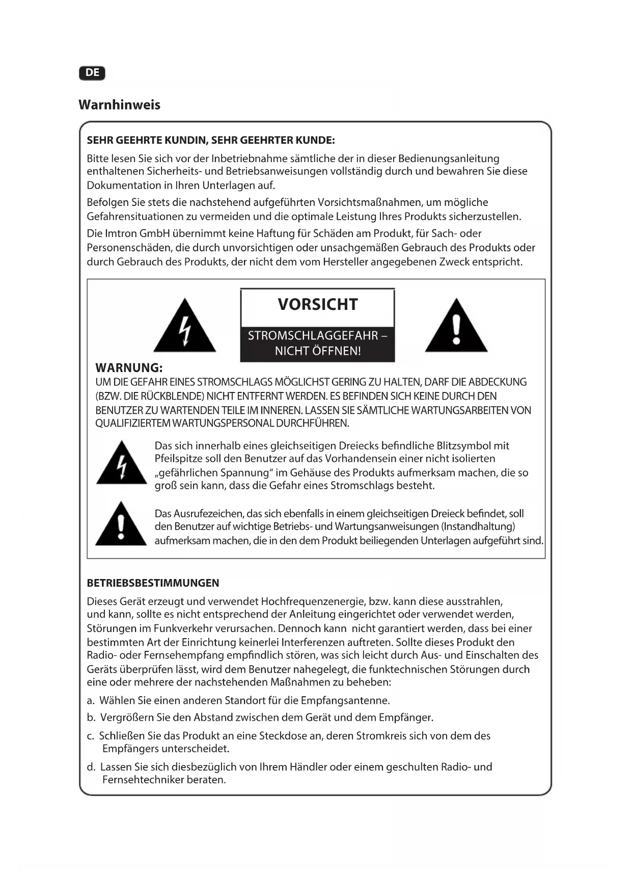 SEHR GEEHRTE KUNDIN, SEHR GEEHRTER KUNDE: Bitte lesen Sie sich vor der Inbetriebnahme sämtliche der in dieser Bedienungsanleitung enthaltenen Sicherheits- und Betriebsanweisungen vollständig durch und bewahren Sie diese Dokumentation in Ihren Unterlagen auf. Befolgen Sie stets die nachstehend aufgeführten Vorsichtsmaßnahmen, um mögliche Gefahrensituationen zu vermeiden und die optimale Leistung Ihres Produkts sicherzustellen. Die Imtron GmbH übernimmt keine Haftung für Schäden am Produkt, für Sach- oder Personenschäden, die durch unvorsichtigen oder unsachgemäßen Gebrauch des Produkts oder durch Gebrauch des Produkts, der nicht dem vom Hersteller angegebenen Zweck entspricht. Warnhinweis WARNUNG: UM DIE GEFAHR EINES STROMSCHLAGS MÖGLICHST GERING ZU HALTEN, DARF DIE ABDECKUNG (BZW. DIE RÜCKBLENDE) NICHT ENTFERNT WERDEN. ES BEFINDEN SICH KEINE DURCH DEN BENUTZER ZU WARTENDEN TEILE IM INNEREN. LASSEN SIE SÄMTLICHE WARTUNGSARBEITEN VON QUALIFIZIERTEM WARTUNGSPERSONAL DURCHFÜHREN. Das sich innerhalb eines gleichseitigen Dreiecks bendliche Blitzsymbol mit Pfeilspitze soll den Benutzer auf das Vorhandensein einer nicht isolierten „gefährlichen Spannung“ im Gehäuse des Produkts aufmerksam machen, die so groß sein kann, dass die Gefahr eines Stromschlags besteht. Das Ausrufezeichen, das sich ebenfalls in einem gleichseitigen Dreieck bendet, soll den Benutzer auf wichtige Betriebs- und Wartungsanweisungen (Instandhaltung) aufmerksam machen, die in den dem Produkt beiliegenden Unterlagen aufgeführt sind. BETRIEBSBESTIMMUNGEN Dieses Gerät erzeugt und verwendet Hochfrequenzenergie, bzw. kann diese ausstrahlen, und kann, sollte es nicht entsprechend der Anleitung eingerichtet oder verwendet werden, Störungen im Funkverkehr verursachen. Dennoch kann nicht garantiert werden, dass bei einer bestimmten Art der Einrichtung keinerlei Interferenzen auftreten. Sollte dieses Produkt den Radio- oder Fernsehempfang empndlich stören, was sich leicht durch Aus- und Einschalten des Geräts überprüfen lässt, wird dem Benutzer nahegelegt, die funktechnischen Störungen durch eine oder mehrere der nachstehenden Maßnahmen zu beheben: a. Wählen Sie einen anderen Standort für die Empfangsantenne. b. Vergrößern Sie den Abstand zwischen dem Gerät und dem Empfänger. c. Schließen Sie das Produkt an eine Steckdose an, deren Stromkreis sich von dem des Empfängers unterscheidet. d. Lassen Sie sich diesbezüglich von Ihrem Händler oder einem geschulten Radio- und Fernsehtechniker beraten. VORSICHT STROMSCHLAGGEFAHR – NICHT ÖFFNEN! 2DE Warnhinweis VORSICHT