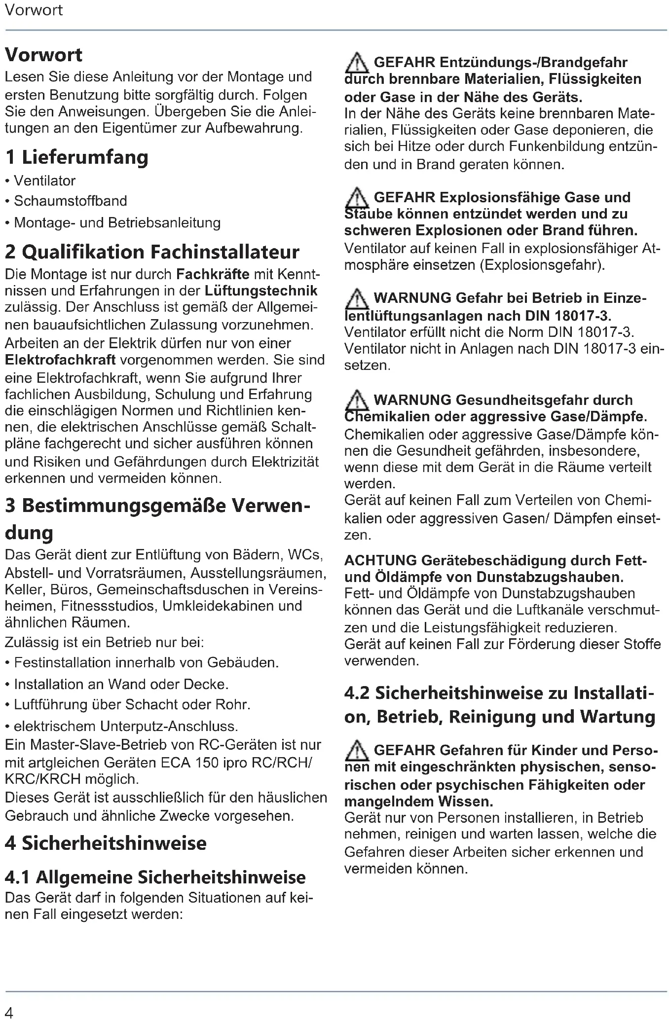 - elektrischem Unterputz-Anschluss. Ein Master-Slave-Betrieb von RC-Geräten ist nur mit artgleichen Geräten ECA 150 ipro RC/RCH/ KRC/KRCH möglich. Dieses Gerät ist ausschließlich für den häuslichen Gebrauch und ähnliche Zwecke vorgesehen. 4 Sicherheitshinweise