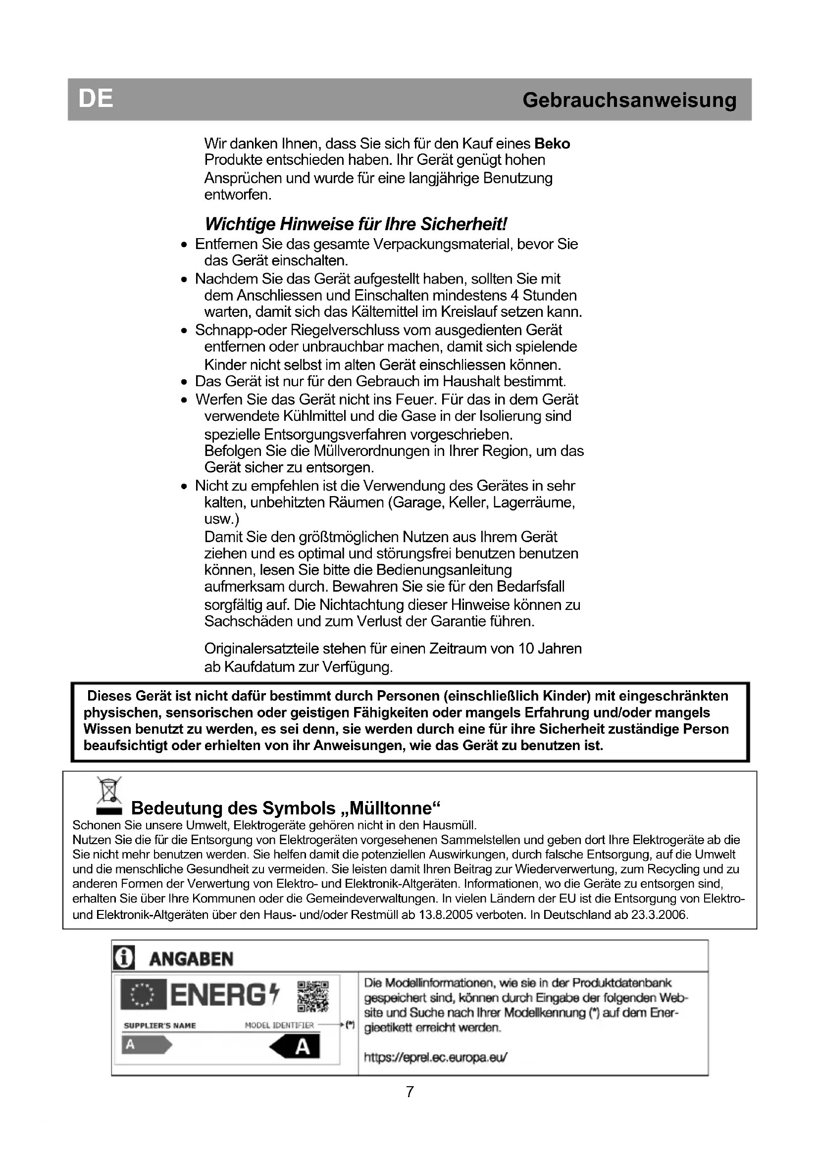 Dieses Gerät ist nicht dafür bestimmt durch Personen (einschließlich Kinder) mit eingeschränkten physischen, sensorischen oder geistigen Fähigkeiten oder mangels Erfahrung und/oder mangels Wissen benutzt zu werden, es sei denn, sie werden durch eine für ihre Sicherheit zuständige Person beaufsichtigt oder erhielten von ihr Anweisungen, wie das Gerät zu benutzen ist. Bedeutung des Symbols „Mülltonne“ Schonen Sie unsere Umwelt, Elektrogeräte gehören nicht in den Hausmüll. Nutzen Sie die für die Entsorgung von Elektrogeräten vorgesehenen Sammelstellen und geben dort Ihre Elektrogeräte ab die Sie nicht mehr benutzen werden. Sie helfen damit die potenziellen Auswirkungen, durch falsche Entsorgung, auf die Umwelt und die menschliche Gesundheit zu vermeiden. Sie leisten damit Ihren Beitrag zur Wiederverwertung, zum Recycling und zu anderen Formen der Verwertung von Elektro- und Elektronik-Altgeräten. Informationen, wo die Geräte zu entsorgen sind, erhalten Sie über Ihre Kommunen oder die Gemeindeverwaltungen. In vielen Ländern der EU ist die Entsorgung von Elektro- und Elektronik-Altgeräten über den Haus- und/oder Restmüll ab 13.8.2005 verboten. In Deutschland ab 23.3.2006.DE Gebrauchsanweisung Elektrischer Anschluss Bevor Sie das Gerät anschliessen, prüfen Sie unbedingt, ob die auf dem Typenschild angegebene Wechselspannung mit der Netzspannung übereinstimmt. Die elektrischen Anschlüsse müssen den gesetzlichen Vorschriften entsprechen. Schließen Sie das Gerät an eine leicht zugängliche Steckdose an. Warnung! Dieses Gerät muss richtig geerdet werden. Reparatur- und Wa rtungsarbeiten sollten nur von Fachkräften durchgeführt werden. Reparaturen, die von nicht qualifizierten Personen ausgeführt werden, sind eine Gefahrenquelle und können gefährliche Konsequenzen für den Benutzer des Gerätes haben. Achtung! Dieses Gerät verwendet das Kühlmittel R600a, ein Gas mit hoher Umweltverträglichkeit, das aber brennbar ist. Achten Sie beim Transportieren und Aufstellen des Geräts darauf, daß keine Teile des Kühlmittelkreislaufs beschädigt werden. Vermeiden Sie bei Beschädigungen offenes Feuer oder Zündquellen, und lüften Sie den Raum, in dem sich das Gerät befindet, mehrere Minuten lang. Warnung! Verwenden Sie zur Beschleunigung des Abtauprozesses keine mechanischen oder anderen Hilfsmittel als die vom Hersteller empfohlenen Mittel. Warnung! Achten Sie darauf, dass der Kühlmittelkreislauf nicht beschädigt wird. Warnung! Keine elektrische Geräte benutzen um den Abtauprozess zu beschleunigen. Verwenden Sie in der Kühl-Gefrier - Kombination keine anderen als die vom Hersteller empfohlenen elektrischen Geräte. Warnung! Wenn die Netzanschlussleitung dieses Gerätes beschädigt wird, muss sie durch den Hersteller oder seinen Kundendienst oder eine ähnlich qualifizierte Person ersetzt werden, um Gefährdungen zu vermeiden. Transporthinweise