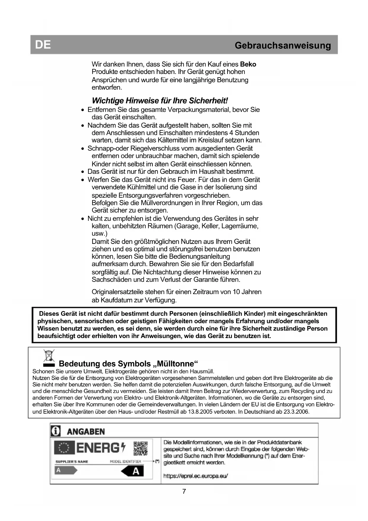 Dieses Gerät ist nicht dafür bestimmt durch Personen (einschließlich Kinder) mit eingeschränkten physischen, sensorischen oder geistigen Fähigkeiten oder mangels Erfahrung und/oder mangels Wissen benutzt zu werden, es sei denn, sie werden durch eine für ihre Sicherheit zuständige Person beaufsichtigt oder erhielten von ihr Anweisungen, wie das Gerät zu benutzen ist. Bedeutung des Symbols „Mülltonne“ Schonen Sie unsere Umwelt, Elektrogeräte gehören nicht in den Hausmüll. Nutzen Sie die für die Entsorgung von Elektrogeräten vorgesehenen Sammelstellen und geben dort Ihre Elektrogeräte ab die Sie nicht mehr benutzen werden. Sie helfen damit die potenziellen Auswirkungen, durch falsche Entsorgung, auf die Umwelt und die menschliche Gesundheit zu vermeiden. Sie leisten damit Ihren Beitrag zur Wiederverwertung, zum Recycling und zu anderen Formen der Verwertung von Elektro- und Elektronik-Altgeräten. Informationen, wo die Geräte zu entsorgen sind, erhalten Sie über Ihre Kommunen oder die Gemeindeverwaltungen. In vielen Ländern der EU ist die Entsorgung von Elektro- und Elektronik-Altgeräten über den Haus- und/oder Restmüll ab 13.8.2005 verboten. In Deutschland ab 23.3.2006.DE Gebrauchsanweisung Elektrischer Anschluss Bevor Sie das Gerät anschliessen, prüfen Sie unbedingt, ob die auf dem Typenschild angegebene Wechselspannung mit der Netzspannung übereinstimmt. Die elektrischen Anschlüsse müssen den gesetzlichen Vorschriften entsprechen. Schließen Sie das Gerät an eine leicht zugängliche Steckdose an. Warnung! Dieses Gerät muss richtig geerdet werden. Reparatur- und Wa rtungsarbeiten sollten nur von Fachkräften durchgeführt werden. Reparaturen, die von nicht qualifizierten Personen ausgeführt werden, sind eine Gefahrenquelle und können gefährliche Konsequenzen für den Benutzer des Gerätes haben. Achtung! Dieses Gerät verwendet das Kühlmittel R600a, ein Gas mit hoher Umweltverträglichkeit, das aber brennbar ist. Achten Sie beim Transportieren und Aufstellen des Geräts darauf, daß keine Teile des Kühlmittelkreislaufs beschädigt werden. Vermeiden Sie bei Beschädigungen offenes Feuer oder Zündquellen, und lüften Sie den Raum, in dem sich das Gerät befindet, mehrere Minuten lang. Warnung! Verwenden Sie zur Beschleunigung des Abtauprozesses keine mechanischen oder anderen Hilfsmittel als die vom Hersteller empfohlenen Mittel. Warnung! Achten Sie darauf, dass der Kühlmittelkreislauf nicht beschädigt wird. Warnung! Keine elektrische Geräte benutzen um den Abtauprozess zu beschleunigen. Verwenden Sie in der Kühl-Gefrier - Kombination keine anderen als die vom Hersteller empfohlenen elektrischen Geräte. Warnung! Wenn die Netzanschlussleitung dieses Gerätes beschädigt wird, muss sie durch den Hersteller oder seinen Kundendienst oder eine ähnlich qualifizierte Person ersetzt werden, um Gefährdungen zu vermeiden. Transporthinweise