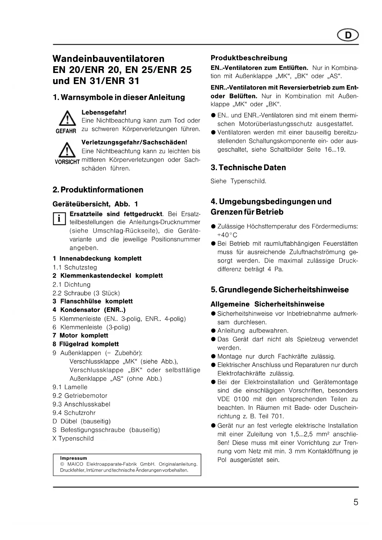 Geräteübersicht, Abb. 1 Ersatzteile sind fettgedruckt. Bei Ersatz-teilbestellungen die Anleitungs-Drucknummer(siehe Umschlag-Rückseite), die Geräte-variante und die jeweilige Positionsnummerangeben.1 Innenabdeckung komplett1.1 Schutzsteg2 Klemmenkastendeckel komplett2.1 Dichtung2.2 Schraube (3 Stück)3 Flanschhülse komplett4 Kondensator (ENR..)5 Klemmenleiste (EN.. 3-polig, ENR.. 4-polig)6 Klemmenleiste (3-polig)7 Motor komplett8 Flügelrad komplett9 Außenklappen (= Zubehör):Verschlussklappe „MK“ (siehe Abb.),Verschlussklappe „BK“ oder selbsttätigeAußenklappe „AS“ (ohne Abb.)9.1 Lamelle9.2 Getriebemotor9.3 Anschlusskabel9.4 SchutzrohrD Dübel (bauseitig)S Befestigungsschraube (bauseitig)X Typenschild VORSICHT GEFAHRImpressum© MAICO Elektroapparate-Fabrik GmbH. Originalanleitung.Druckfehler, Irrtümer und technische Änderungen vorbehalten.
