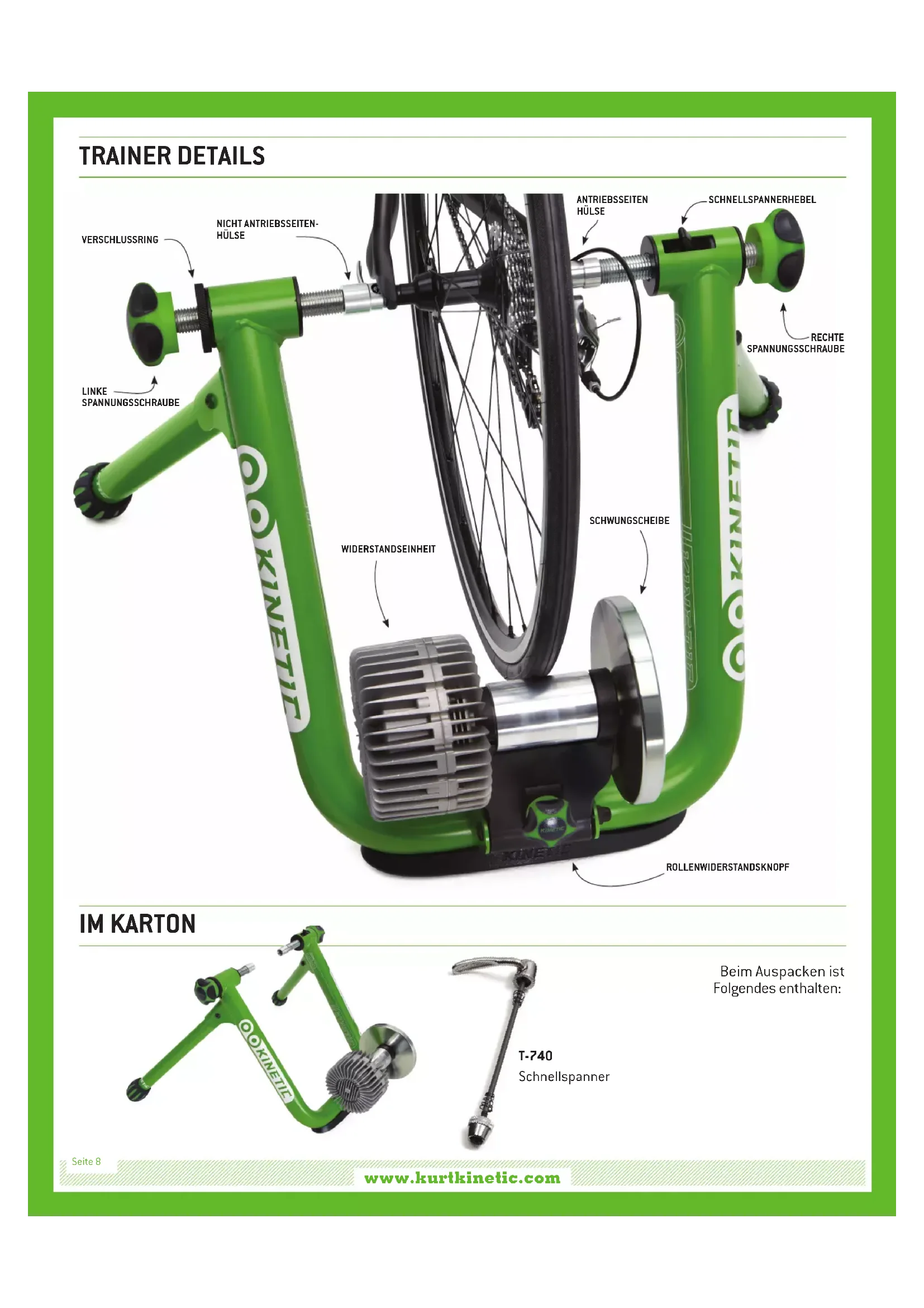 GEBRAUCHSANWEISUNG Seite 7www.kurtkinetic.com Seite 8 Beim Auspacken ist Folgendes enthalten: IM KARTON T-740 Schnellspanner SCHWUNGSCHEIBE SCHNELLSPANNERHEBEL VERSCHLUSSRING NICHT ANTRIEBSSEITEN- HÜLSE ANTRIEBSSEITEN HÜLSE WIDERSTANDSEINHEIT TRAINER DETAILS LINKE SPANNUNGSSCHRAUBE RECHTE SPANNUNGSSCHRAUBE ROLLENWIDERSTANDSKNOPFT-2202 Rollen Widerstandsknopf und Unterlegscheiben T-2201 Querstange und Schrauben T-2203 Feder T-2204 Befestigungsbolzen und Mutter T-740 Schnellspanner www.kurtkinetic.com T-2210 Rahmen TRAINER TEILE Seite 9 REGISTRIEREN SIE IHR GERÄT: www.kurtkinetic.com/warranty Beim Fehlen eines dieser gelisteten Komponenten bitte den Kundenservice kontaktieren www.kurtkinetic.com/contact WALZE SCHWUNGSCHEIBE BÜGEL SERIENNUMMER T-699C Widerstandseinheit Weil jede Rolle getestet wird, nden Sie Reifenspuren T-2111 Standard Hülsen (am Trainer befestigt) T-2103 Geschlitzte Hülse (am Trainer befestigt)www.kurtkinetic.com