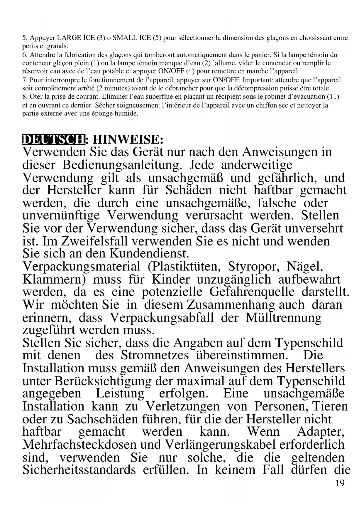 DEUTSCH: HINWEISE: Verwenden Sie das Gerät nur nach den Anweisungen in dieser Bedienungsanleitung. Jede anderweitige Verwendung gilt als unsachgemäß und gefährlich, und der Hersteller kann für Schäden nicht haftbar gemacht werden, die durch eine unsachgemäße, falsche oder unvernünftige Verwendung verursacht werden. Stellen Sie vor der Verwendung sicher, dass das Gerät unversehrt ist. Im Zweifelsfall verwenden Sie es nicht und wenden Sie sich an den Kundendienst. Verpackungsmaterial (Plastiktüten, Styropor, Nägel, Klammern) muss für Kinder unzugänglich aufbewahrt werden, da es eine potenzielle Gefahrenquelle darstellt. Wir möchten Sie in diesem Zusammenhang auch daran erinnern, dass Verpackungsabfall der Mülltrennung zugeführt werden muss. Stellen Sie sicher, dass die Angaben auf dem Typenschild mit denen des Stromnetzes übereinstimmen. Die Installation muss gemäß den Anweisungen des Herstellers unter Berücksichtigung der maximal auf dem Typenschild angegeben Leistung erfolgen. Eine unsachgemäße Installation kann zu Verletzungen von Personen, Tieren oder zu Sachschäden führen, für die der Hersteller nicht haftbar gemacht werden kann. Wenn Adapter, Mehrfachsteckdosen und Verlängerungskabel erforderlich sind, verwenden Sie nur solche, die die geltenden Sicherheitsstandards erfüllen. In keinem Fall dürfen die20 am einfachen Adapter und/oder an den Verlängerungskabeln angegebenen Verbrauchsgrenzen sowie die maximale Leistung überschritten werden, die auf dem Mehrfachadapter angegeben ist. - Verwenden Sie das Netzkabel nicht in der Nähe von scharfen Gegenständen oder heißen Oberflächen und ziehen Sie den Netzstecker nicht am Netzkabel aus der Steckdose. Lassen Sie es nicht von der Arbeitsplatte baumeln, wo ein Kind es halten könnte. Verwenden Sie das Gerät im Falle von Schäden am Netzkabel, Stecker oder im Falle von Kurzschlüssen nicht und lassen Sie es in einer Vertragswerkstatt reparieren. - Setzen Sie das Gerät keinen ungünstigen Wetterbedingungen, wie z. B. Regen, Feuchtigkeit, Frost, aus und bewahren Sie es an einem trockenen Ort auf. Fassen Sie das Gerät nicht mit nassen Händen an und verwenden Sie es nicht barfuß. - Dieses Gerät kann von Kindern ab 8 Jahren und von Personen mit eingeschränkten körperlichen, sensorischen oder geistigen Fähigkeiten oder mangelnder Erfahrung und Kenntnissen verwendet werden, wenn sie beaufsichtigt oder instruiert wurden, um das Gerät sicher zu verwenden und die damit verbundenen Gefahren zu verstehen. Kinder dürfen nicht mit dem Gerät spielen. Reinigung und Benutzerwartung dürfen nicht von Kindern ohne Aufsicht durchgeführt werden. - Kinder dürfen nicht mit dem Gerät spielen. - Bewahren Sie das Gerät und sein Netzanschluss außerhalb der Reichweite von Kinder unter 8 Jahren. - Nicht für den gewerblichen Gebrauch bestimmt. Nur für den Hausgebrauch bestimmt. Im Falle eines Defekts und/oder von Fehlfunktionen das Gerät nicht öffnen. Für Reparaturen wenden Sie sich an21 eine vom Hersteller autorisierte Werkstatt (Vertragswerkstatt) und fordern Sie den Einsatz von Original-Ersatzteilen. Die Nichtbeachtung der obigen Vorschriften kann die Sicherheit beeinträchtigen und zur Folge haben, dass die Garantie erlischt. Dieses Gerät ist nur für den Hausgebrauch oder gleichwertiges bestimmt, in Situationen wie bspw.: Kantinen in kleinen Firmen oder ähnliche Arbeitsumgebungen, von Kunden in Hotels, Motels oder andere Art von touristische Unterkunft, wie ländlicher oder Wohn –Tourismus. Das Gerät darf nicht mit einer Zeitschaltuhr oder mit einem separaten Fernwirksystem betrieben werden Führen Sie vor jedem Gebrauch das Netzkabel aus. Setzen Sie das Produkt keinen Stößen aus, es könnte beschädigt werden. Verwenden Sie nur originale und kompatible Teile und Zubehör. Halten Sie das Gerät fern von brennbaren Materialien, Wärmequellen, Dampf-und kalte Zonen. WICHTIGE SICHERHEITSHINWEISE Gerät nur an Wechselstrom mit Spannung gemäß Typschild am Gerät anschließen. Gerät nur an geerdete Wandsteckdose anschließen. Das gerät niemals in Wasser oder andere Flüssigkeiten tauchen. Dieses Gerät darf nur zur Herstellung von Eiswürfeln verwendet werden. Nicht zum Kühlen von Lebensmitteln und Getränken verwenden, da das Gerät Schaden nehmen könnte. Eine Beschädigung der Serpentine und des Glasbehälters kann gefährliche Folgen haben. Während des Transportes oder Verstellens nicht mehr als 45° neigen. Nicht in der Nähe von entzündlichen Flüssigkeiten oder Gasen lagern. Nicht in der Nähe von hitzequellen lagern.22 Nie die Belüftung verdecken und das Gerät mit einem Mindestabstand von 15 cm zur Wand oder anderen Gegenständen lagern. Schlechte Belüftung kann das Gerät beschädigen. Keine warmen und schweren Gegenstände auf das Gerät legen. Nur Trinkwasser verwenden. Bei Temperaturen zwischen 10 ° C und 43 ° C installieren